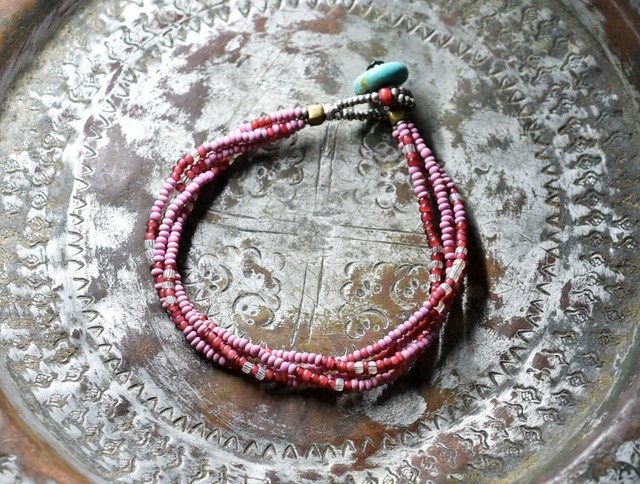 ※こちらは「A様専用」の作品でpす。 ピンクマサイ、金赤ホワイトハーツ、グーズベリーを繋いだ4連ブレスです。 ピンク色のビーズはピンクマサイと呼ばれています。マサイ族が好んでつけたことからこう呼ばれています。(19~20世紀) 一粒一粒形状が異なり、小さくて可愛らしいビーズです。 渋い赤色のビーズはホワイトハーツです。(芯部分が白いんです)金で発色させてある金赤ホワイトハーツを使用しています。 人気で希少なアンティークビーズです。 留め金の若部分の少し大き目な赤いビーズも金赤ホワイトハーツです。 シマシマのビーズなグーズベリーと呼ばれています。ベネチアのアンティークビーズです。(19~20世紀) スグリの実に似ていることから、この名前が付いています。 留め金の小さなカレンシルバービーズには一粒づつ刻印がされているんです! すべて手作業で行われていると思うと気が遠くなります・・・。 ◇カレンシルバー◇ タイヤビルマに住む山岳民族が作るシルバーです。 一つ一つ手作りで、とても純度が高いと言われています。 留め金はターコイズです。(ターコイズの大きさ:直径1.2cm) 可愛らしい色合いの中に、アンティークビーズならではの落ち着いた雰囲気のあるブレスです。 長さ:約20cm(直線にして) 内径は約17.8cm 素材:ガラス、カレンシルバー、ターコイズ、ロウビキ紐