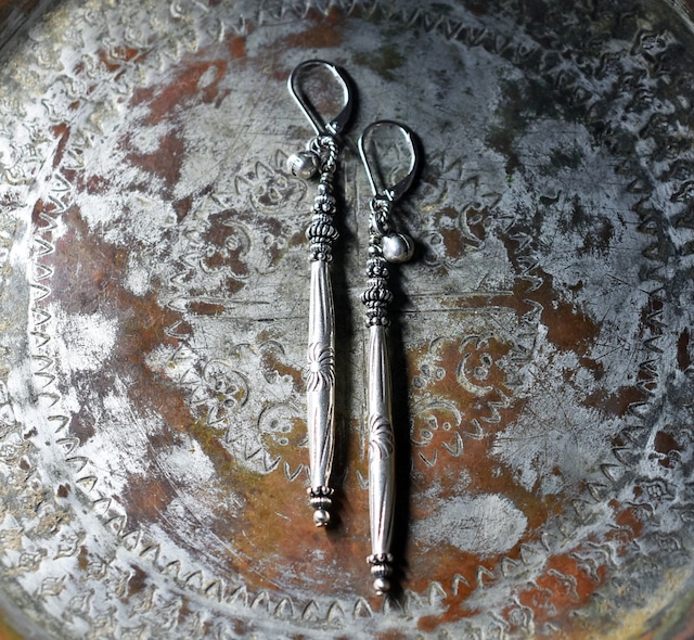 刻印入りロングカレンシルバーとハンドメイドシルバー、ナバホパール、インドシルバー鈴を繋いだちょっと長めなピアスです。 細長いカレンシルバーの中央部分には太陽のような刻印が施されています。一枚のシルバーの板を丸めた様な作りになっています。 シュッとしたフォルムがカッコイイ!! (刻印入りカレンシルバーの大きさ:縦3.7cm 横0.4cm) 間の小さなビーズ(花の刻印入り)、2重螺旋の輪っかもカレンシルバーです。 ◇カレンシルバー◇ タイヤビルマに住む山岳民族が作るシルバーです。 一つ一つ手作りで、とても純度が高いと言われています。 上部の壺のようなパーツもシルバーです。こちらも一つ一つハンドメイドで作られたものです。 花形のパーツもシルバーです。 小さな丸いビーズ、筋の施された算盤型の小さなビーズはナバホパールです。 こちらはsilver925製のビーズです。 アメリカ先住民の銀細工から生まれたもので、まるで真珠のようなことからナバホパールと呼ばれているビーズです。 上下部分の燻しがカッコイイ!! 小さな鈴はインドシルバーです。音は鳴りません。 フレンチフックもシルバーです。silver925の「925」の刻印が施されています。 様々なシルバーが楽しめるオールシルバーのスリムで長めのピアスです。 【変更できます!】 フック型のピアス ネジ式のイヤリング(シルバーではありません。シリコンゴムのカバーお付けします) サイズ 長さ:約7.9cm(ピアスの金具は含みます。) 重さ:片方で約4.1g(両方で約8.2g) 素材:カレンシルバー、ナバホパール、シルバー、インドシルバー