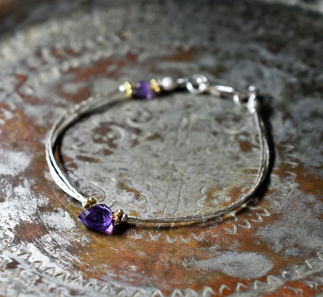 ザンビア産アメジストと繊細筒型シルバービーズの3連ブレス