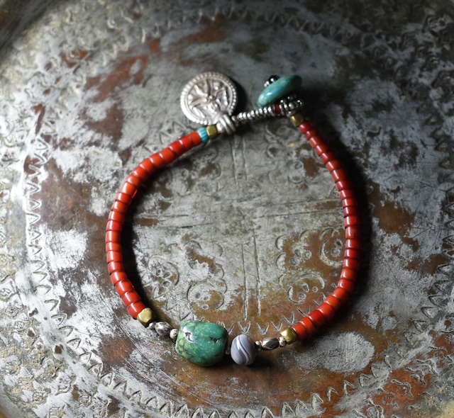oldチベタンターコイズと古代瑪瑙、oldチンシルバー&oldオリッサブラス、飴色ホワイトハーツ、oldインドシルバーチャームなどを繋いだブレスです。 oldチベタンターコイズは約100年~200年ほど前のものです。(もっと古いかもしれません)チベットへ行き、買い付けてきた方に譲っていただいたものです。ターコイズは、天空から落ちた石(Fallen Skystone)とも言われています。古代から様々な国で神聖な石として用いられてきました。 チベットでは時には薬として使われています。何千年も前から受け継がれ、身に着けられている石の一つです。 ぷっくりとした形状と、多彩なグリーンが楽しめます! (ターコイズの大きさ:縦1.1cm 横1cm 厚さ0.7cm) グレーの古代瑪瑙を入れました。こちらはパキスタン~インド等、インダス川流域にて出土したもので、約2000年前のものです。 美しい縞模様がと柔らかなグラデーションが楽しめます。 ※一筋傷が見られます。 oldチベタンターコイズ横の多面体のシルバービーズは、とっても希少なoldチンシルバーです。18~19世紀頃の伝世品です。こちらはビルマから届いたものです。チン族の女性がネックレスなどに使用してもので、独特の摩耗感や、愛おしい傷が見られます。 重厚感や存在感が、現代のシルバーとは比べ物になりません(現代ものでもかっこいいものはあるのですが...)近年さらに高騰しているアンティークビーズです。 鈍い金色のビーズはoldオリッサブラスです。インドから届いた古い真鍮ビーズです。 このビーズとっても、今では手に入りづらく希少なんですよ!留め金付近のチャームもインドから届いた古いものです。 赤色のビーズはホワイトハーツと呼ばれるアンティークビーズです。芯(ハート)部分が白いことからこう呼ばれています。 こちらは19~20世紀頃のヴェネチア産のビーズです。 色村のある飴色で、とても美しいビーズです。 (ホワイトハーツの大きさ:直径3.5~4mm) 留め金付近のターコイズブルーのビーズはシェブロンと呼ばれるアンティークのベネチアビーズです。こちらは4層構造になっていてます。 シェブロンビーズは英語で「山形」を意味します。(イタリア語ではロゼタ)ビーズの貴族とも呼ばれる、高価で重要な意味を持つビーズです。 特にターコイズブルーのシェブロンビーズは希少で手に入りにくいんです!! 留め金部分にはアンティークのインドのシルバーチャームをあしらいました。こちらは19世紀~20世紀初期に作られたものです。 たくさん身に着けることで独特の照りが現れてくると思います。 中央に描かれているのシヴァ神(ベル神)です。 (インドシルバーチャームの大きさ:縦1.8cm 横1.4cm・輪っか部分を含みます。) 留め金はターコイズです。(ターコイズの大きさ:直径1.2cm) 留め金輪っか部分の小さなビーズなどはカレンシルバーです。 ◇カレンシルバー◇ タイヤビルマに住む山岳民族が作るシルバーです。 一つ一つ手作りで、とても純度が高いと言われています。 様々な国、年代素材を盛り込んだ、こだわりのブレスです。 ロウビキ紐で繋いでいるので、最初はやや硬めな着け心地ですが、身に付けるほど柔らかくしなやかになります。 サイズ変更もできますので、お気軽にお問い合わせください。 サイズ 長さ:約18.8cm(直線にして) 内径は約17cm 素材:oldチベタンターコイズ、古代瑪瑙、ガラス、oldインドシルバー、oldチンシルバー、oldオリッサブラス、カレンシルバー、ターコイズ、ロウビキ紐