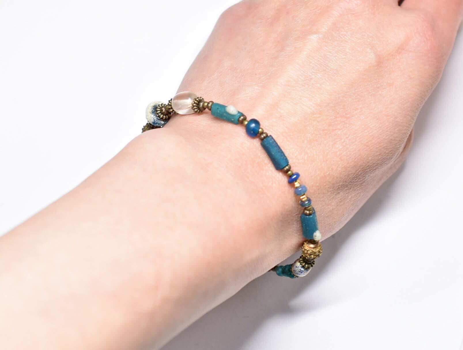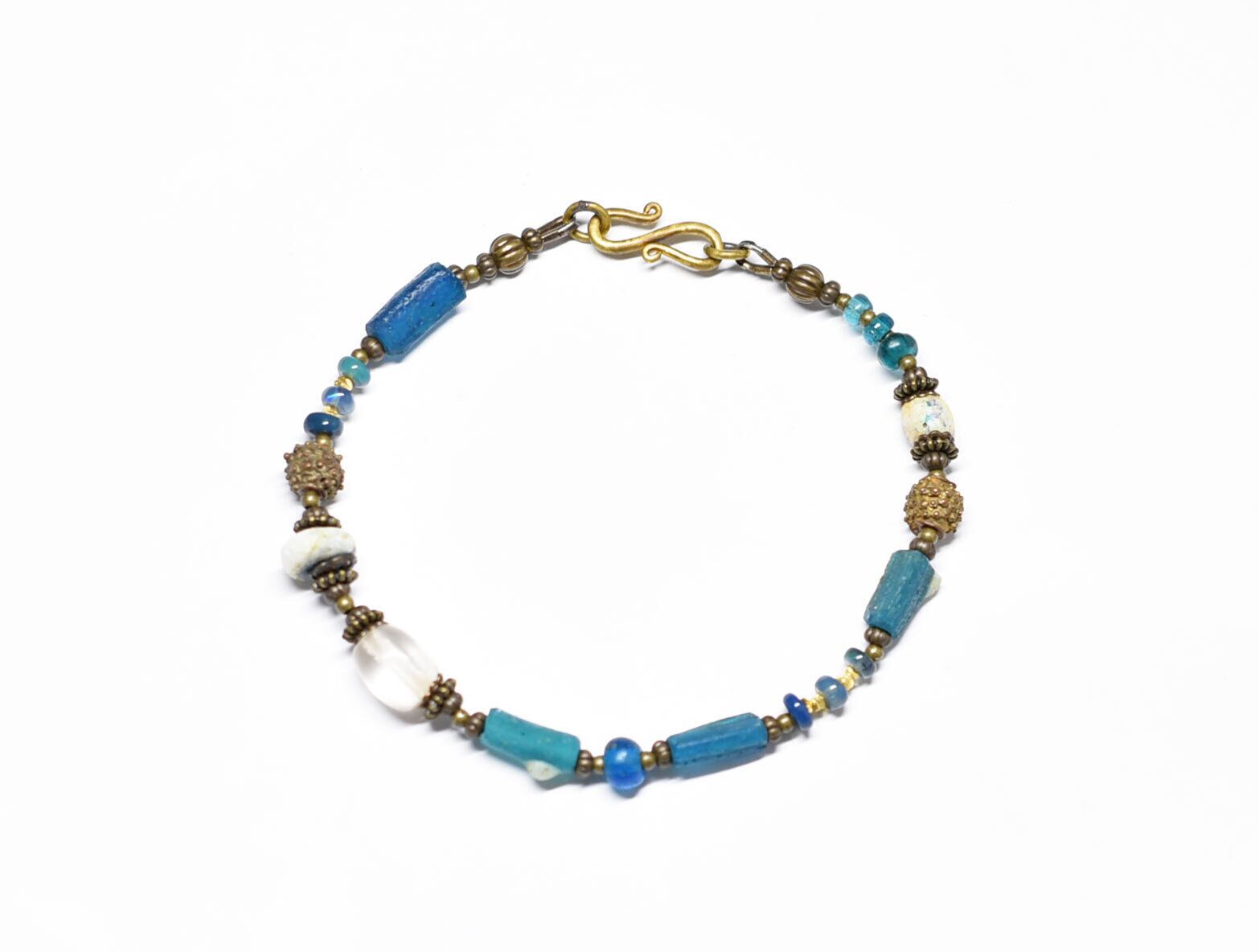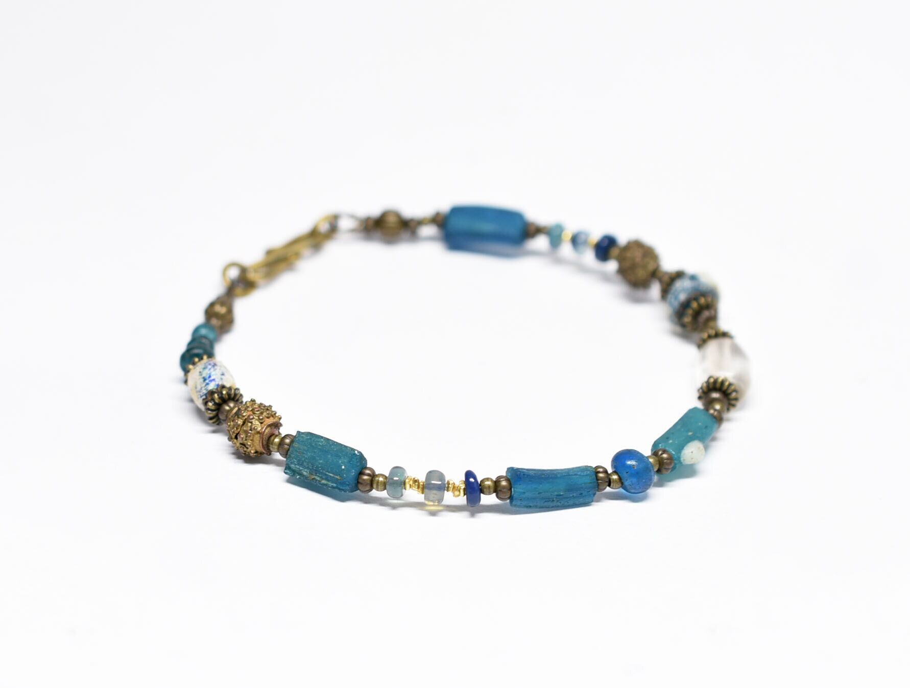 エメラルドブルーローマングラスとアンティークボヘミアビーズ、発掘ビーズ、銀化ビーズ、オパール、民族ブラス、オパールを繋いだブレスです。