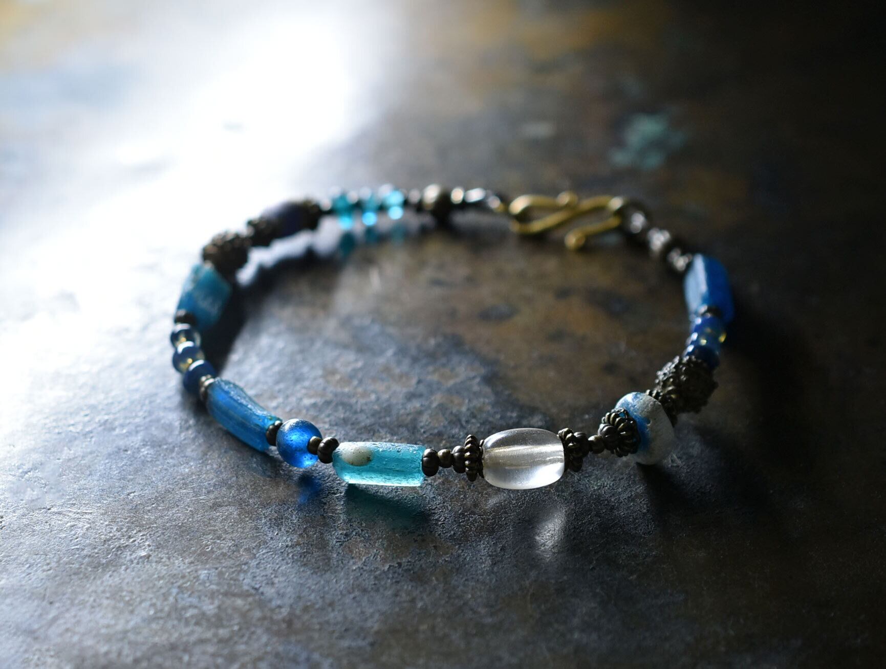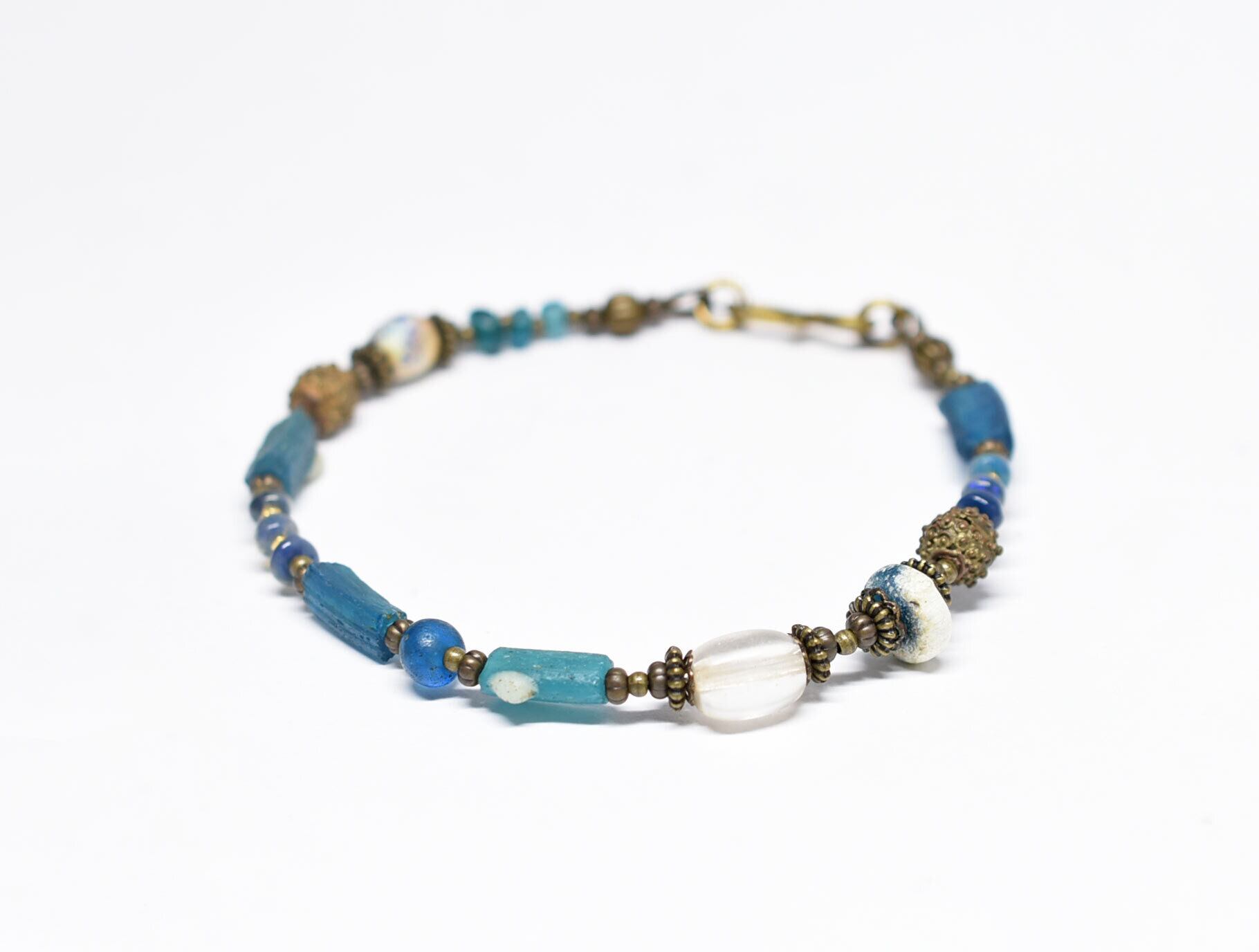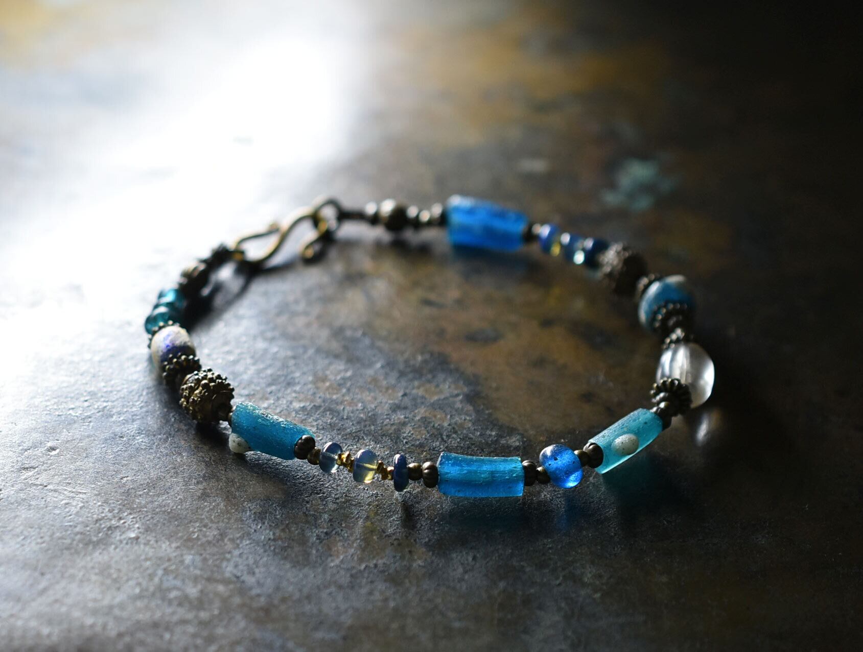 エメラルドブルーローマングラスとアンティークボヘミアビーズ、発掘ビーズ、銀化ビーズ、オパール、民族ブラス、オパールを繋いだブレスです。