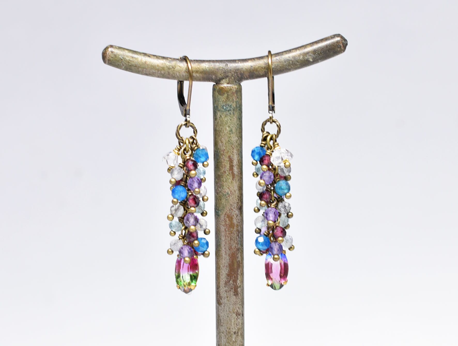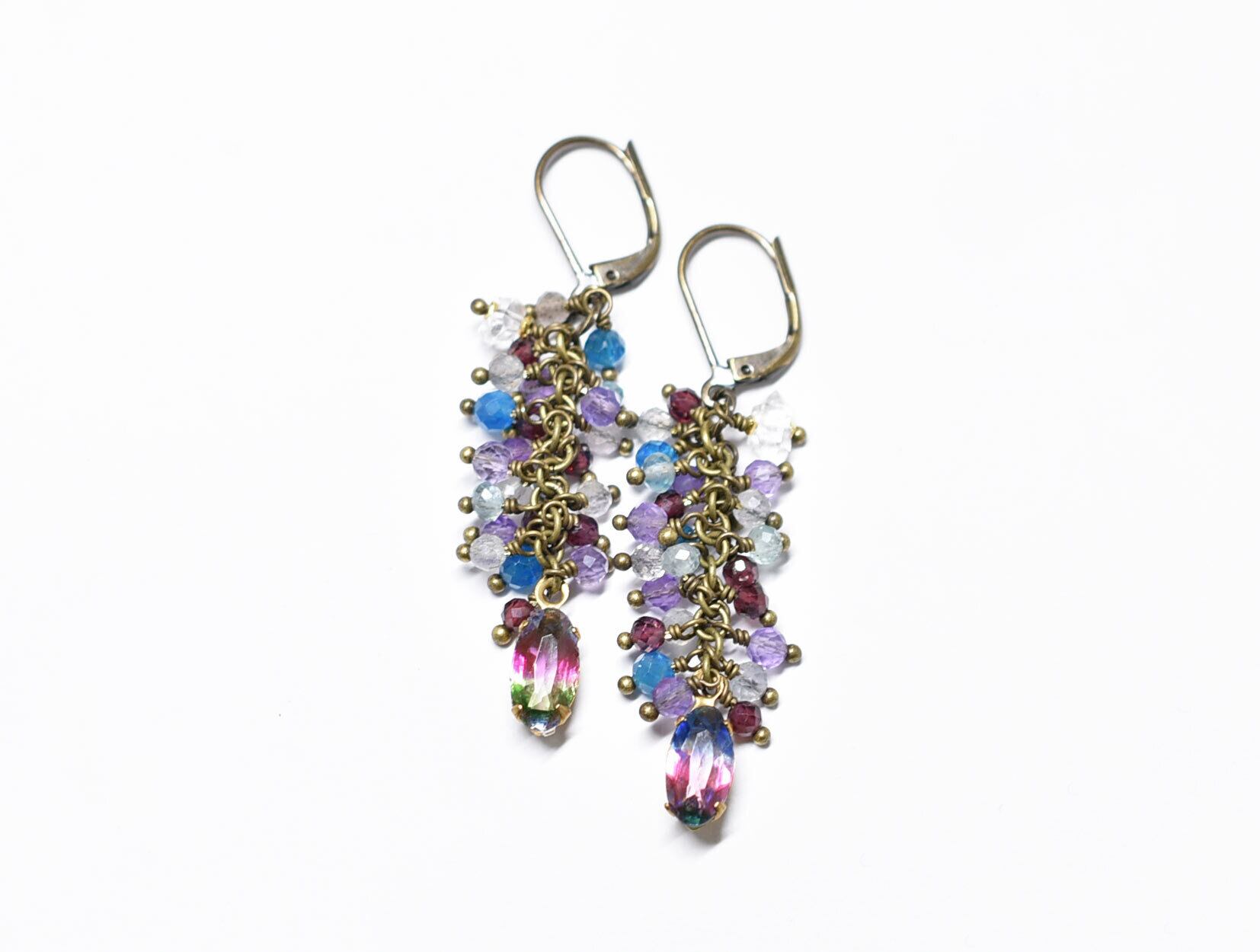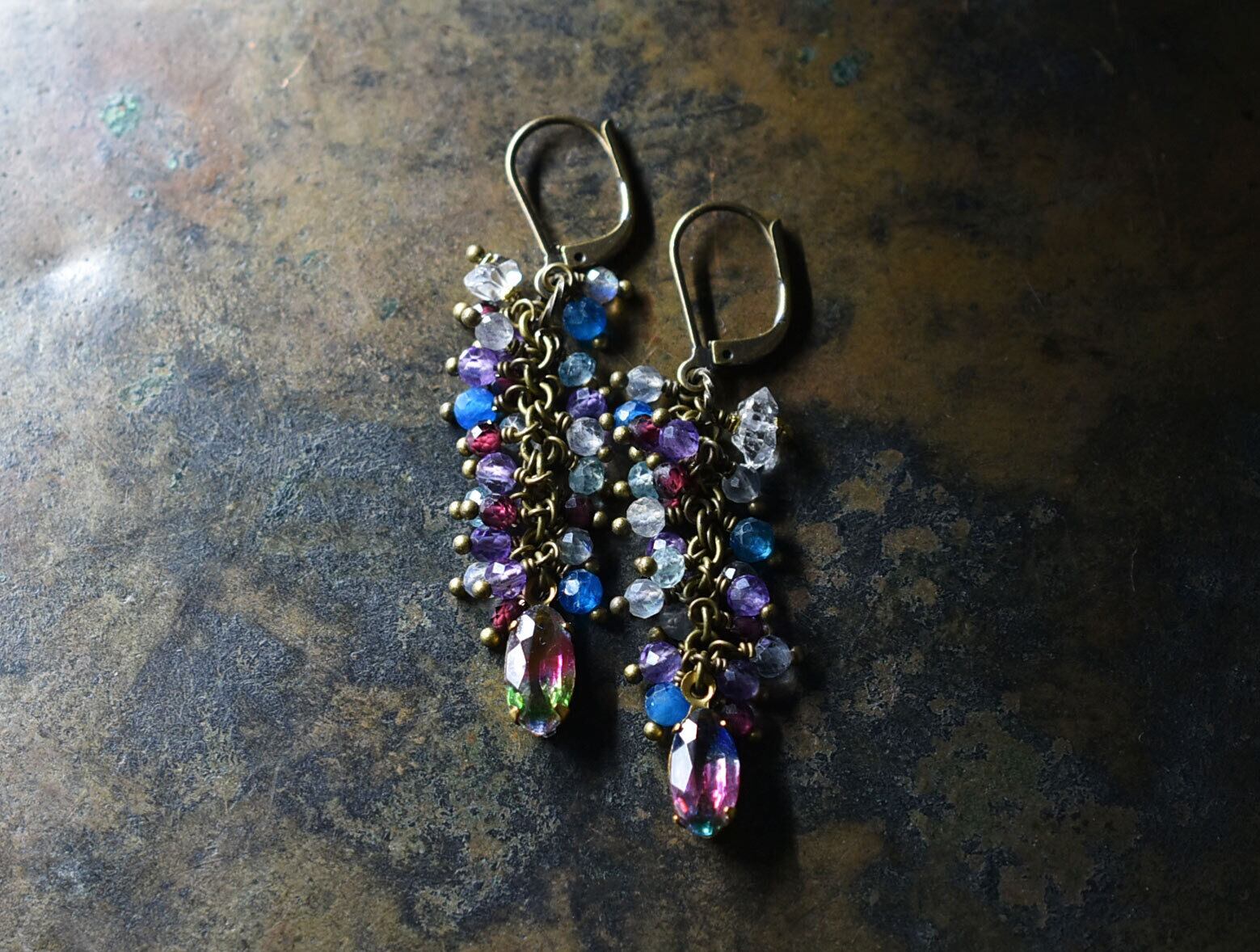 アンティークアイリスガラスとたわわなストーンビーズ、ハーキマーダイヤモンドのピアス