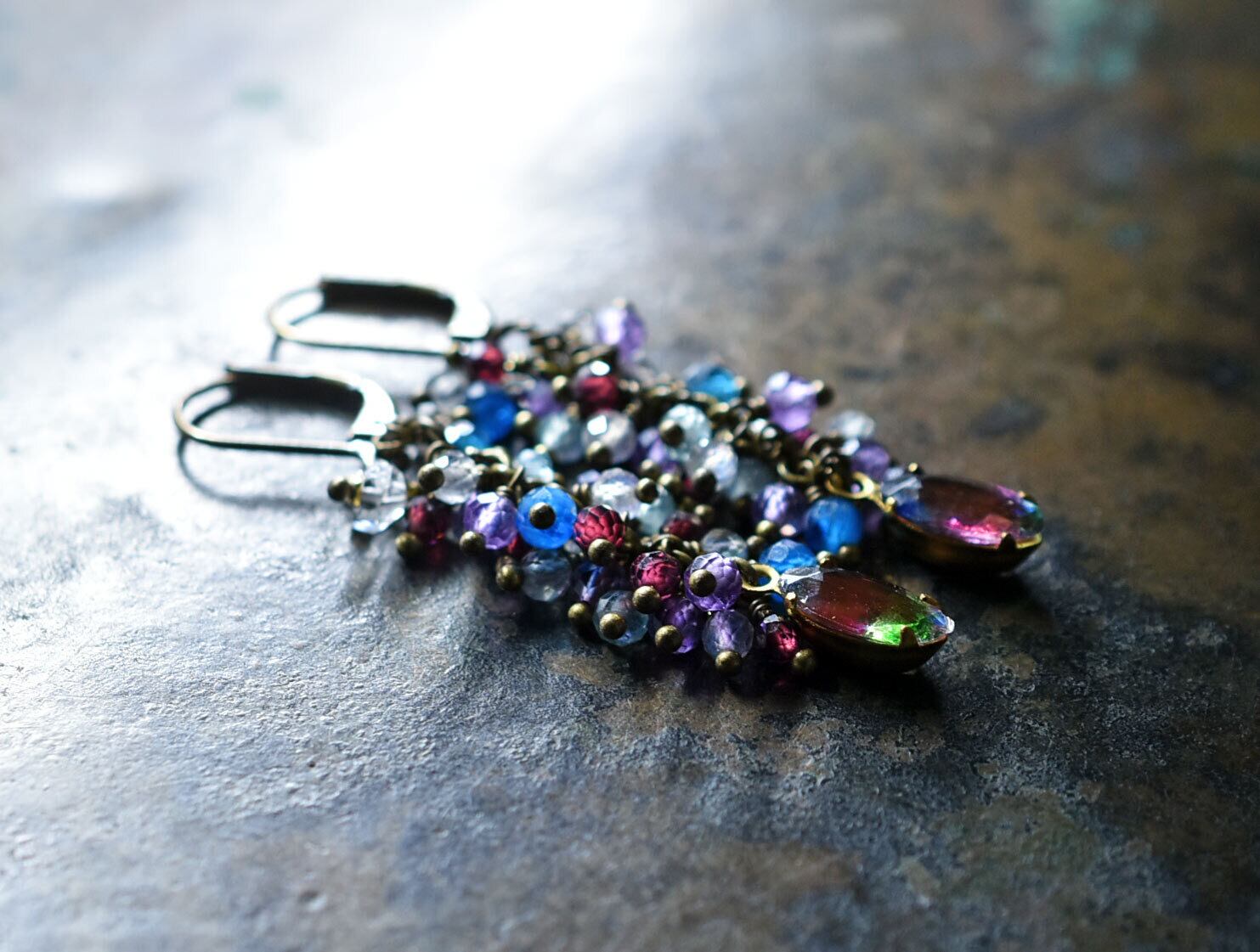 枠にはめられたアンティークアイリスガラスとたわわなストーンビーズ、ハーキマーダイヤモンドを繋いだピアスです。