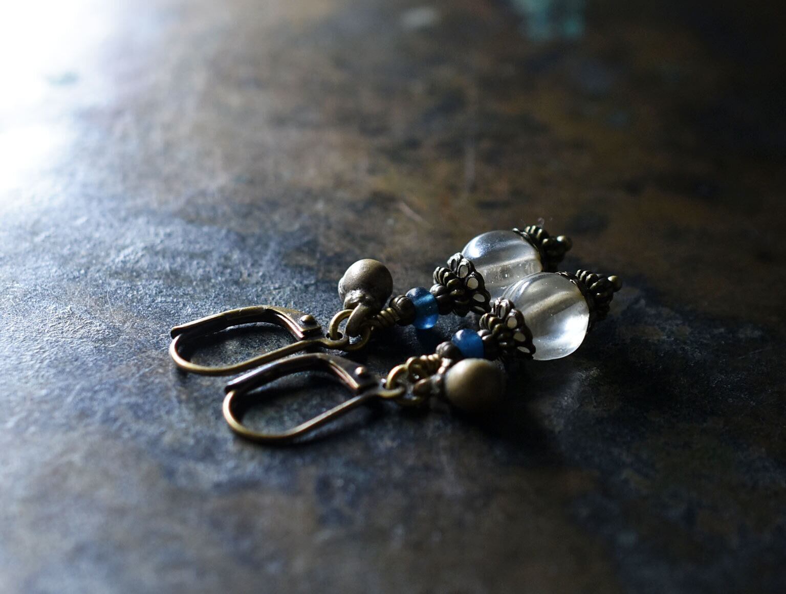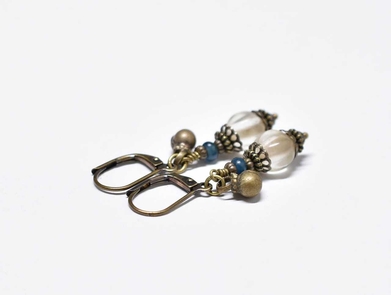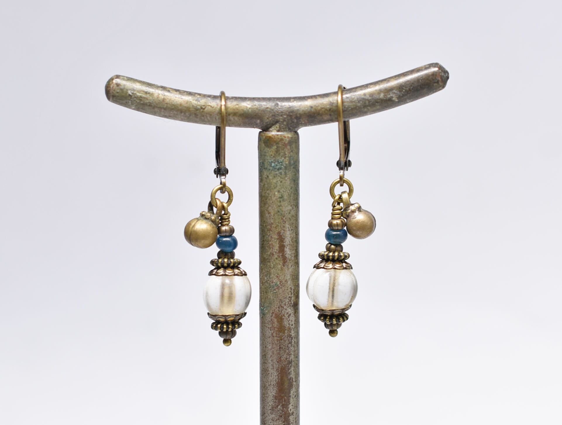 ナガ族クリア蜜柑玉とインディゴブルービーズ、民族鈴の小さなピアス