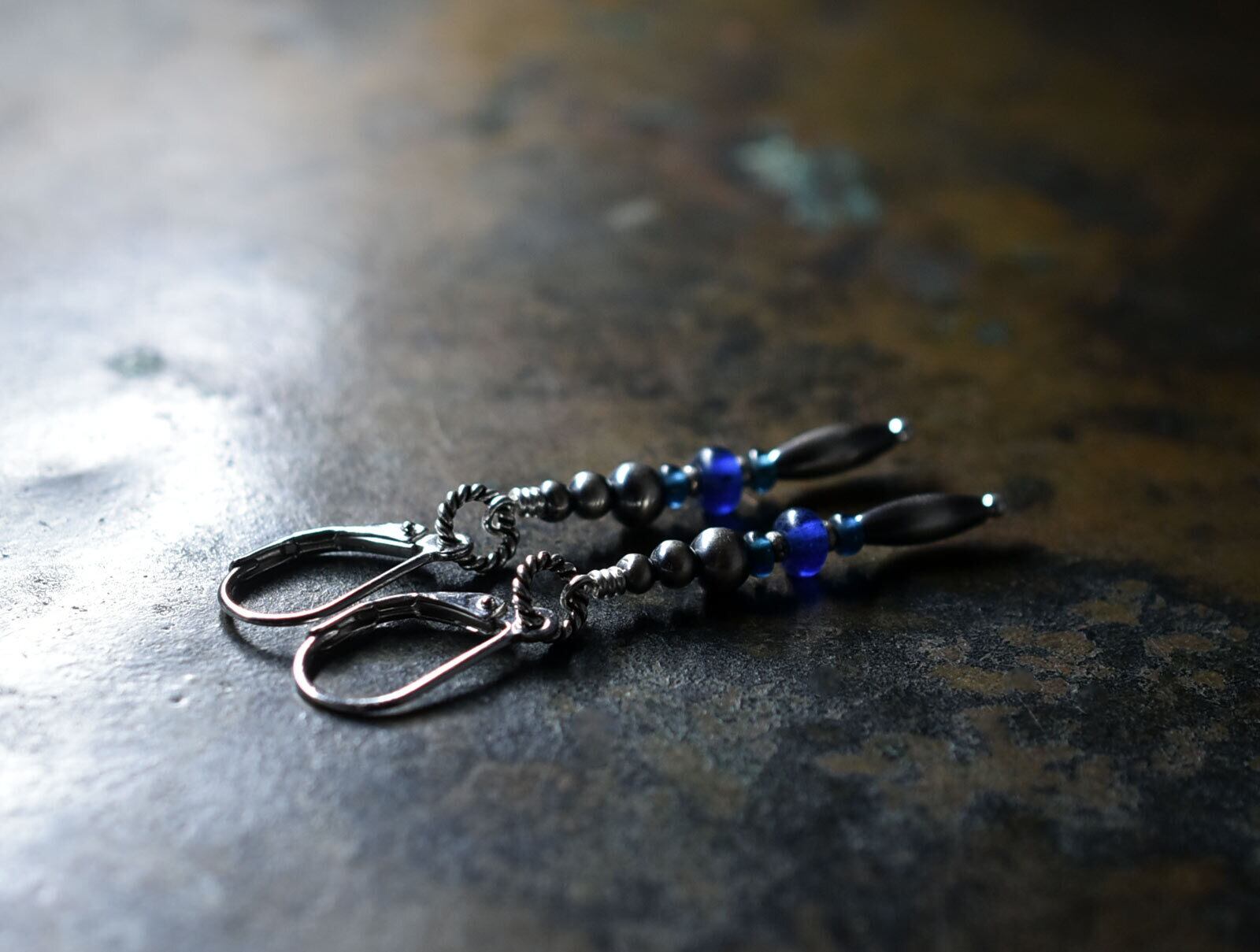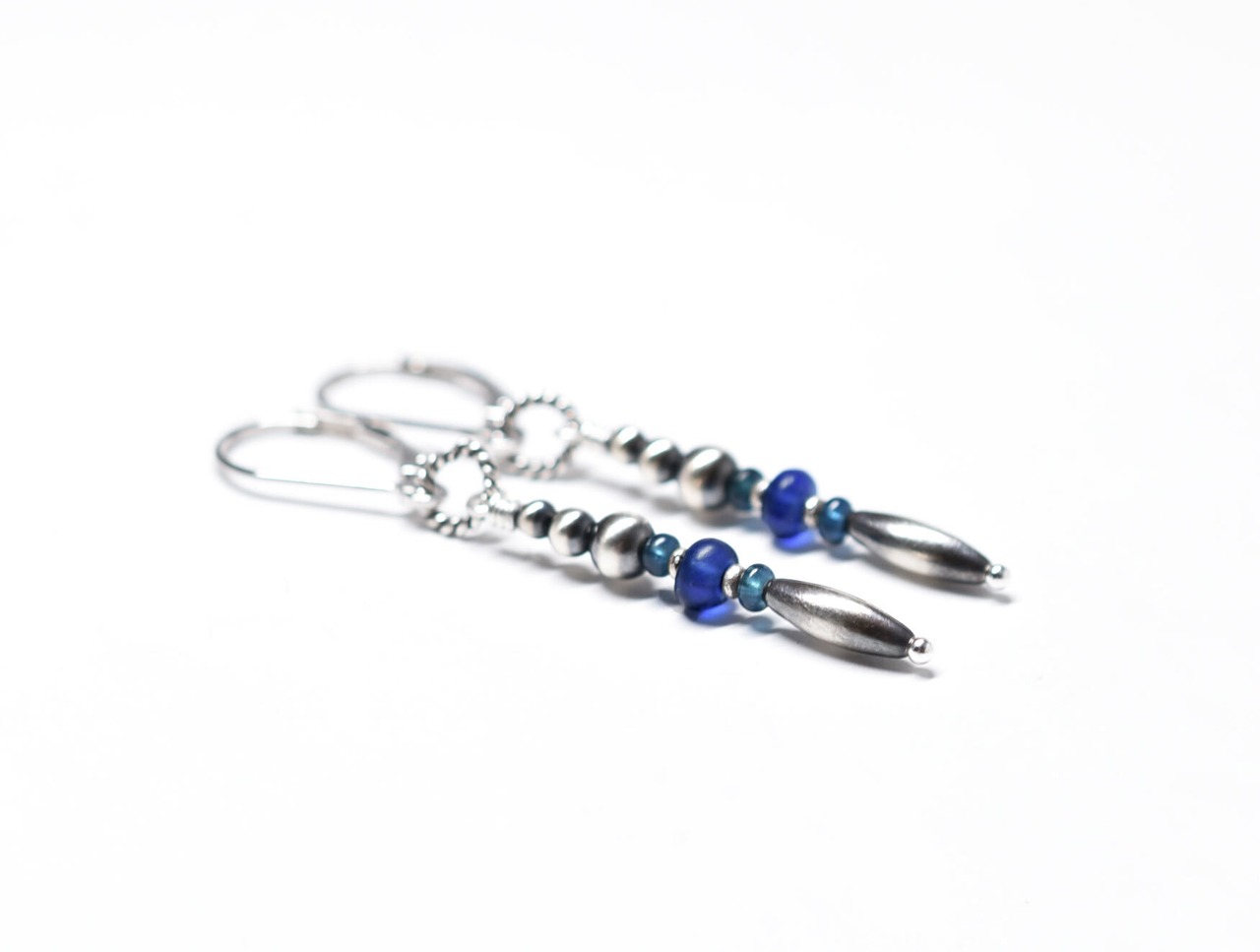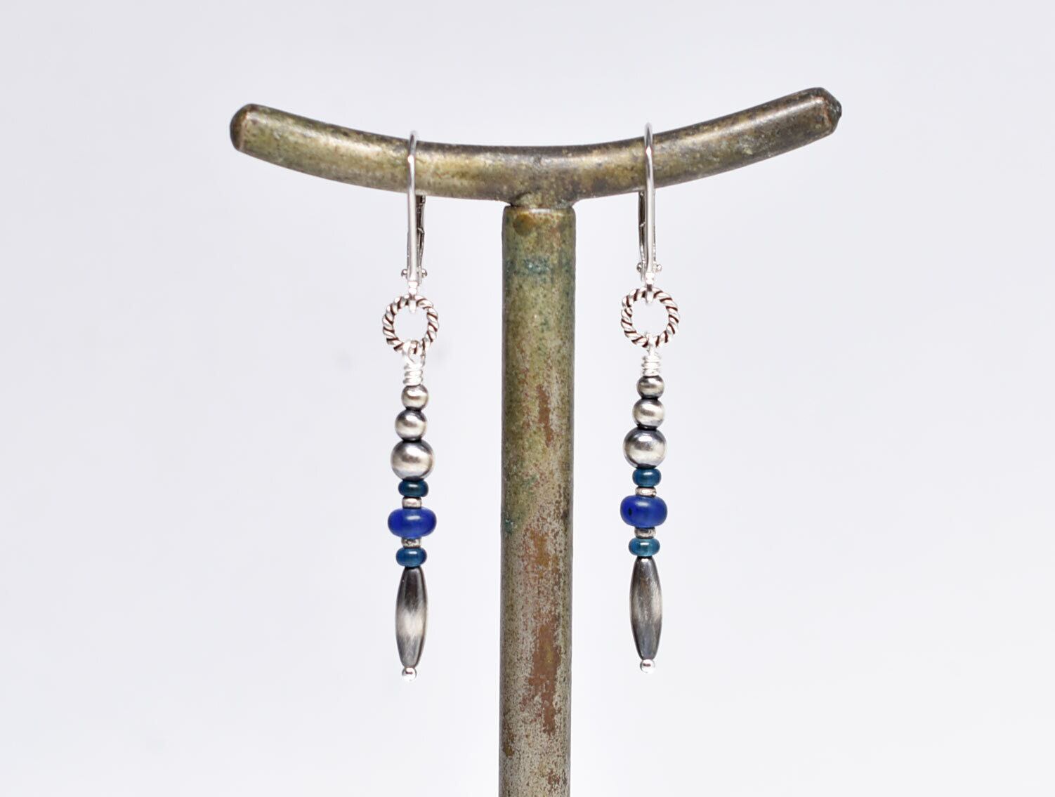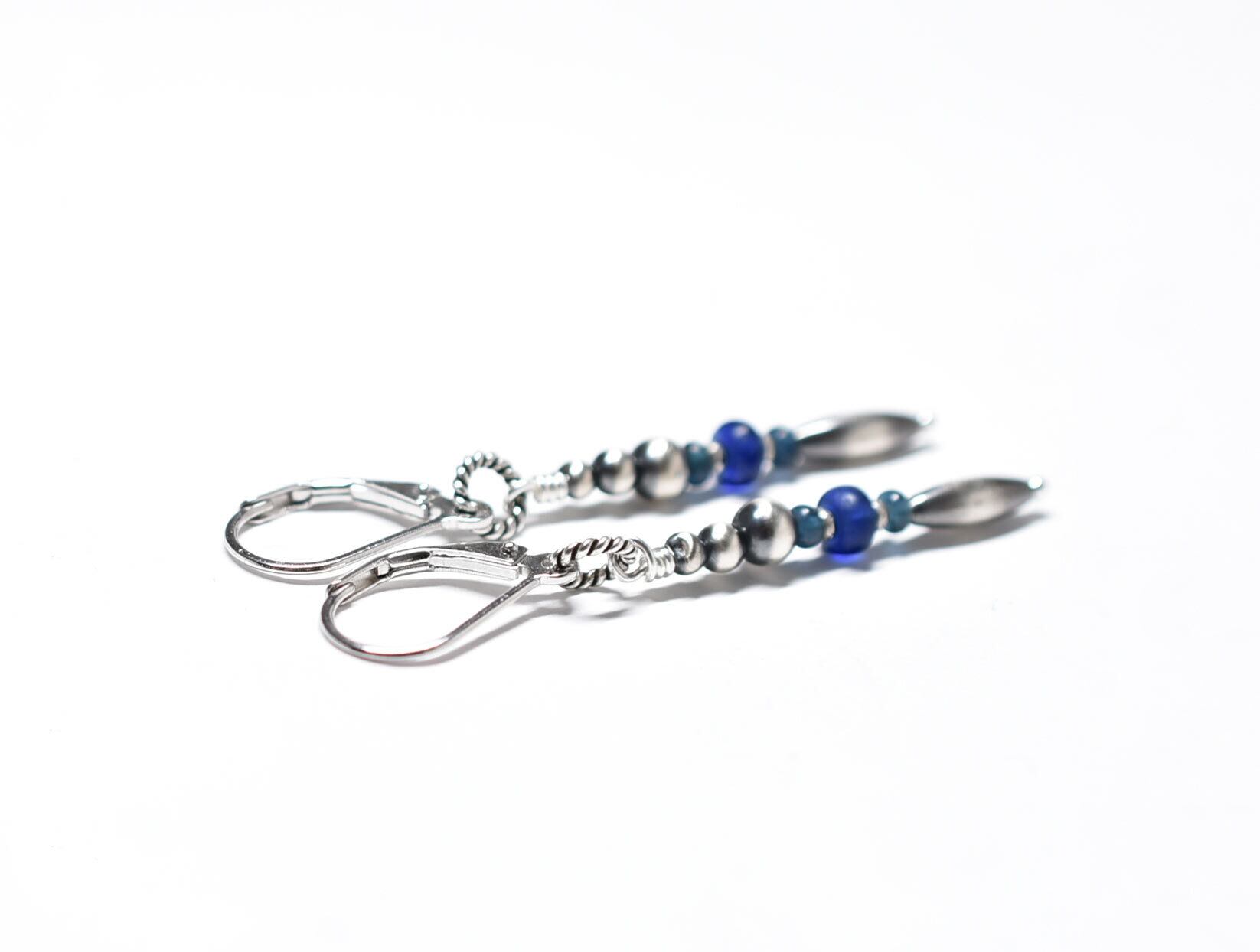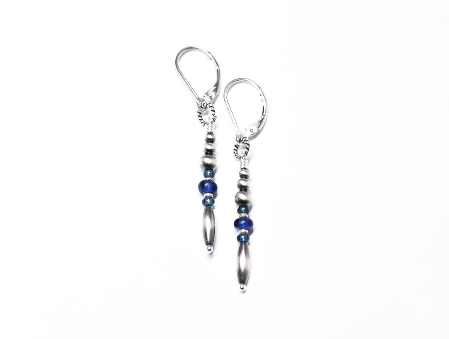 ナバホパールとブルー系アンティークビーズ、カレンシルバーのスリムなピアス