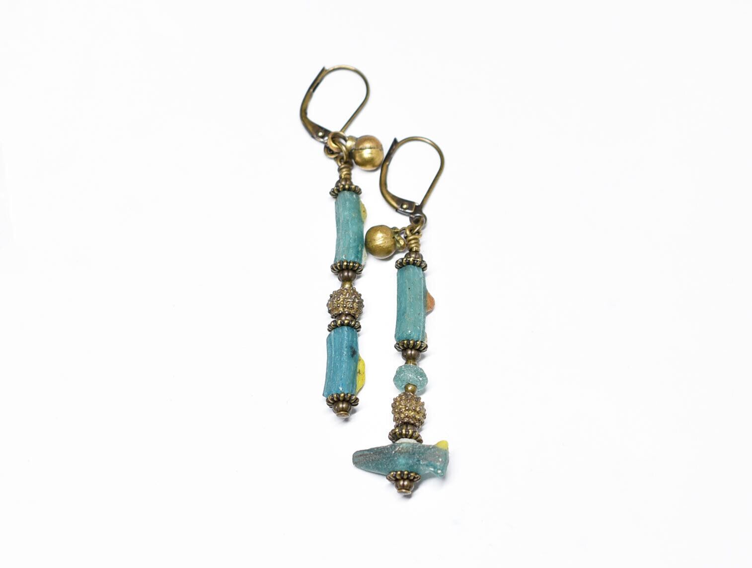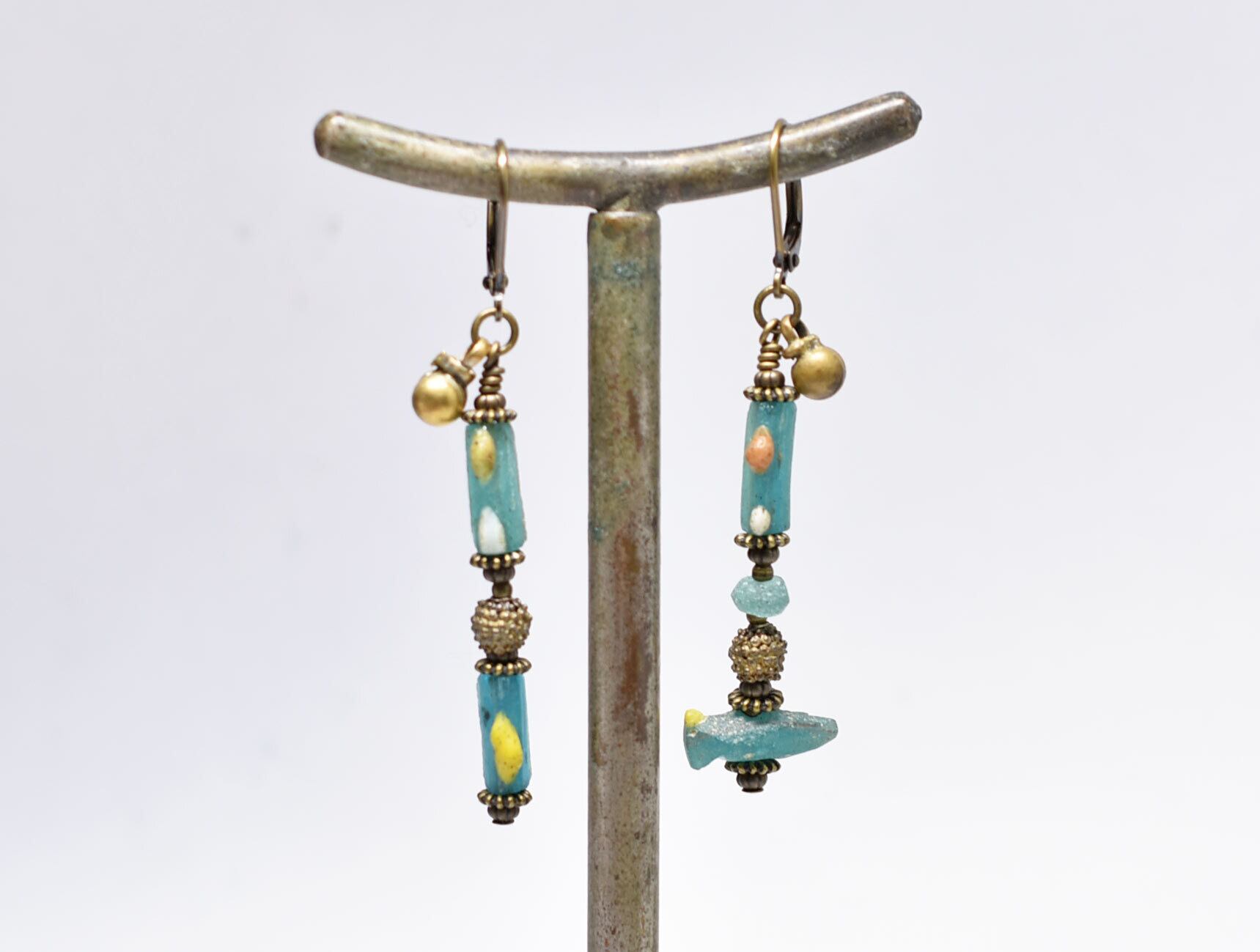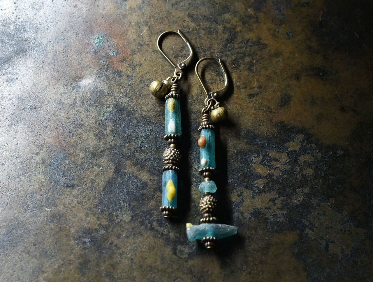 エメラルドグリーンローマングラス、ベニン族のツブツブビーズ、民族鈴を繋いだアンシメトリーピアスです。