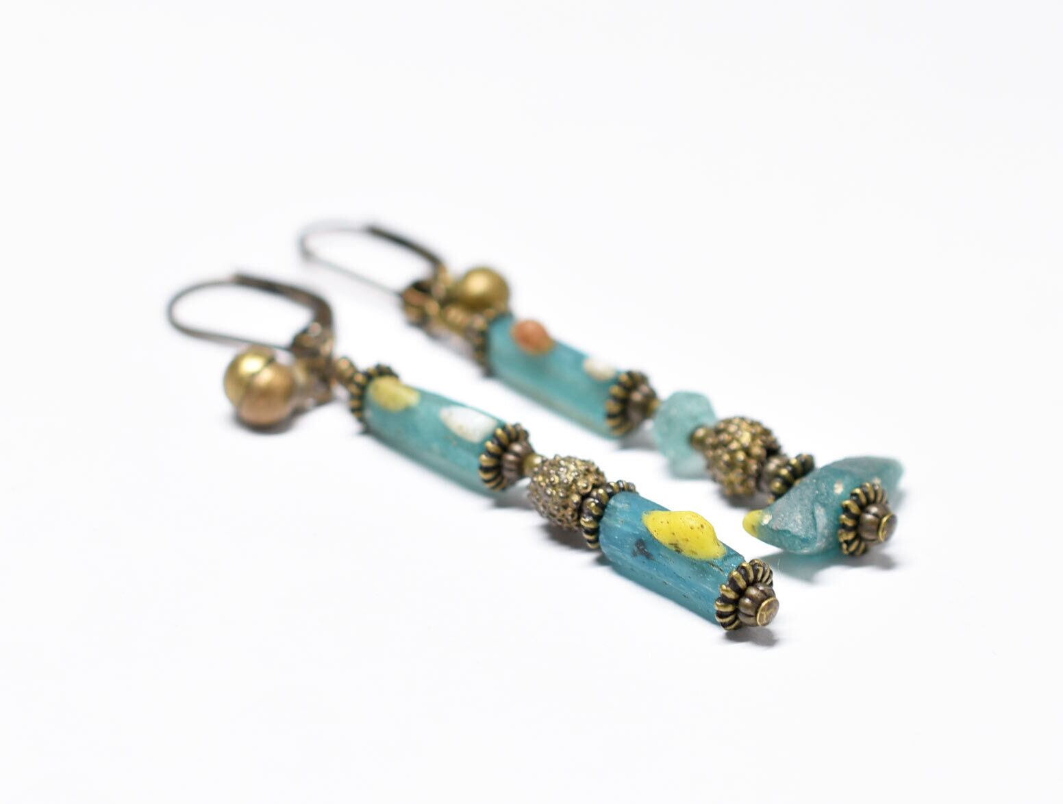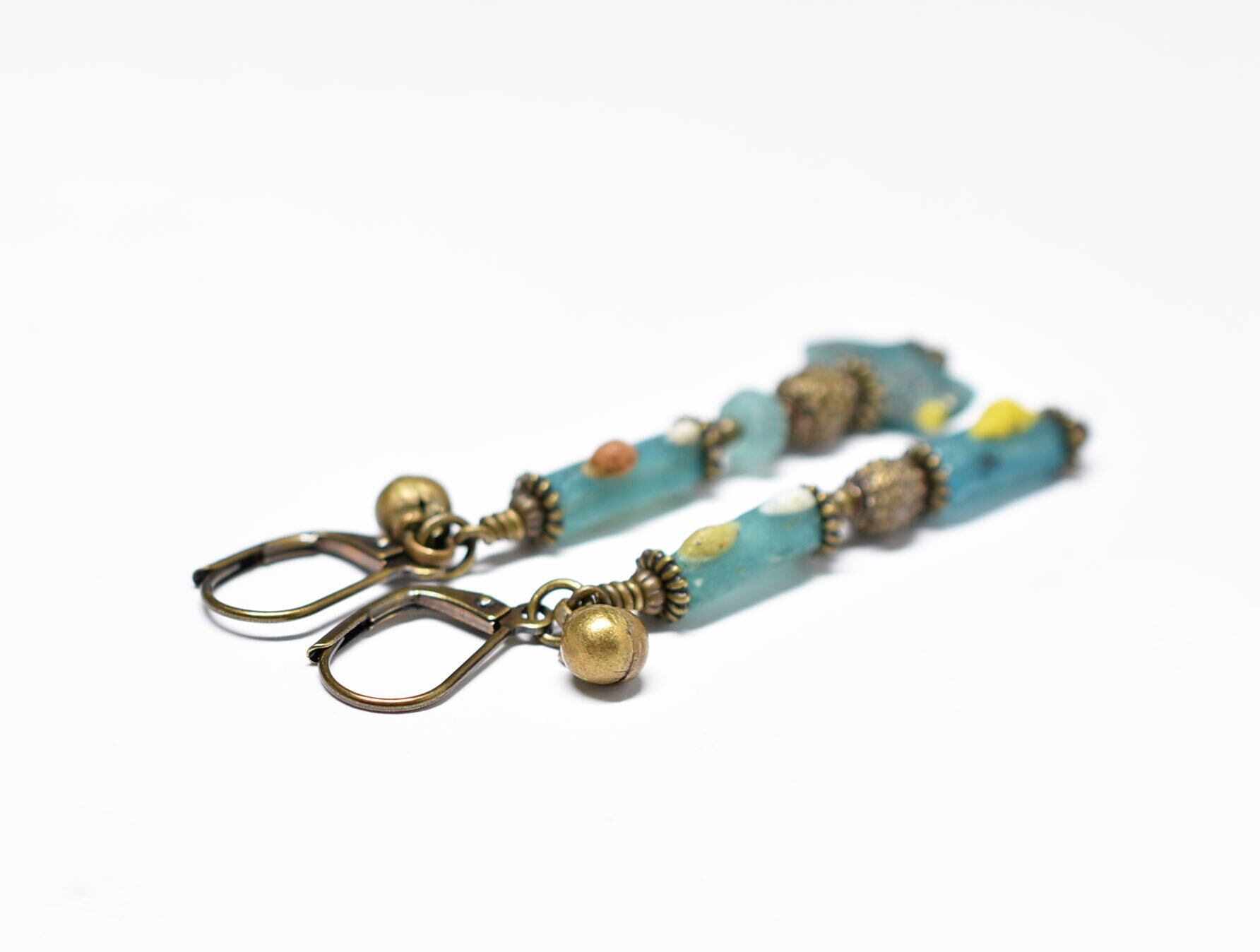 古代ガラスの味わいの中に、ポップな雰囲気も楽しめるピアスです。