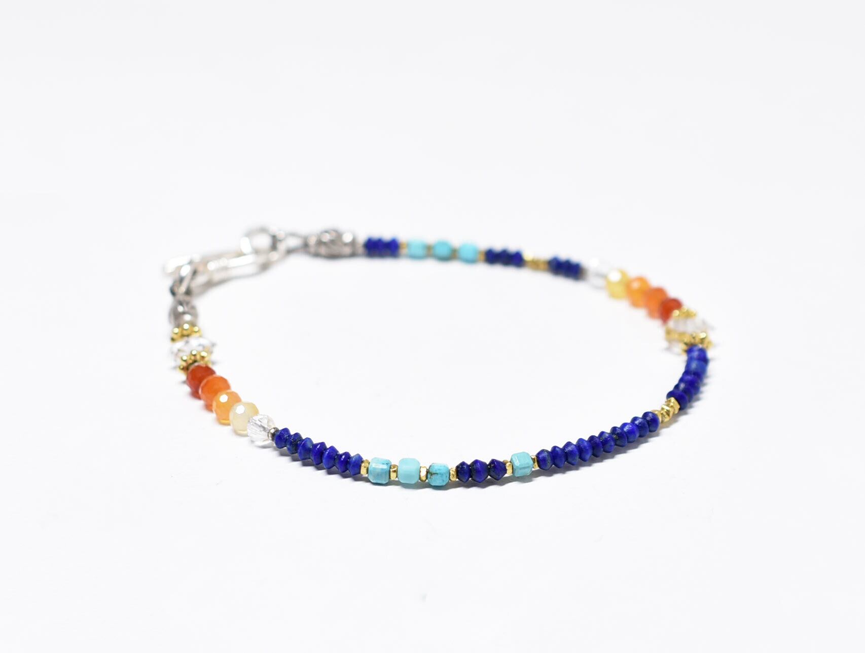 カーネリアンとスクエアターコイズ、ハーキマーダイヤモンド、小さなラピス、カレンシルバーを繋いだ華奢なブレスです。
