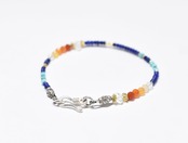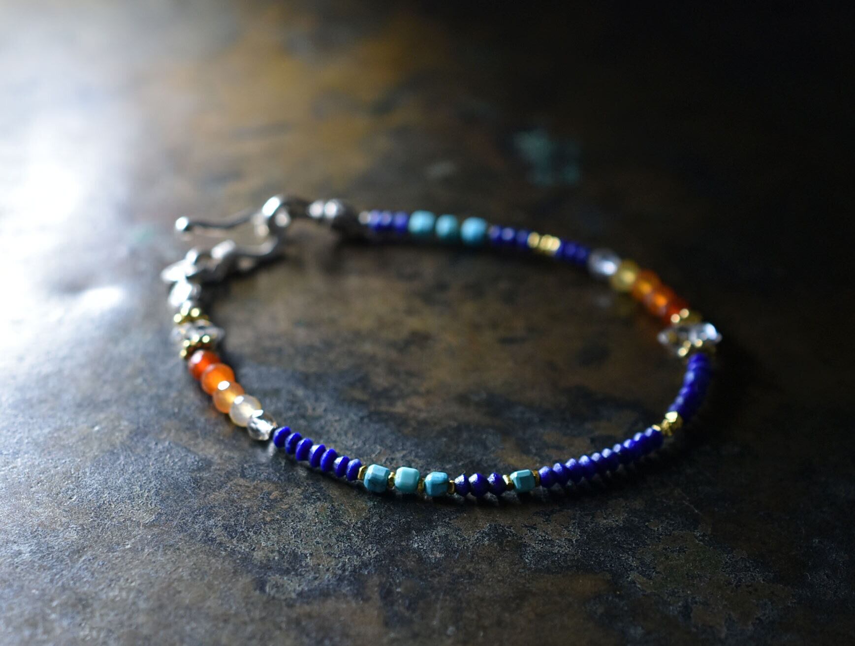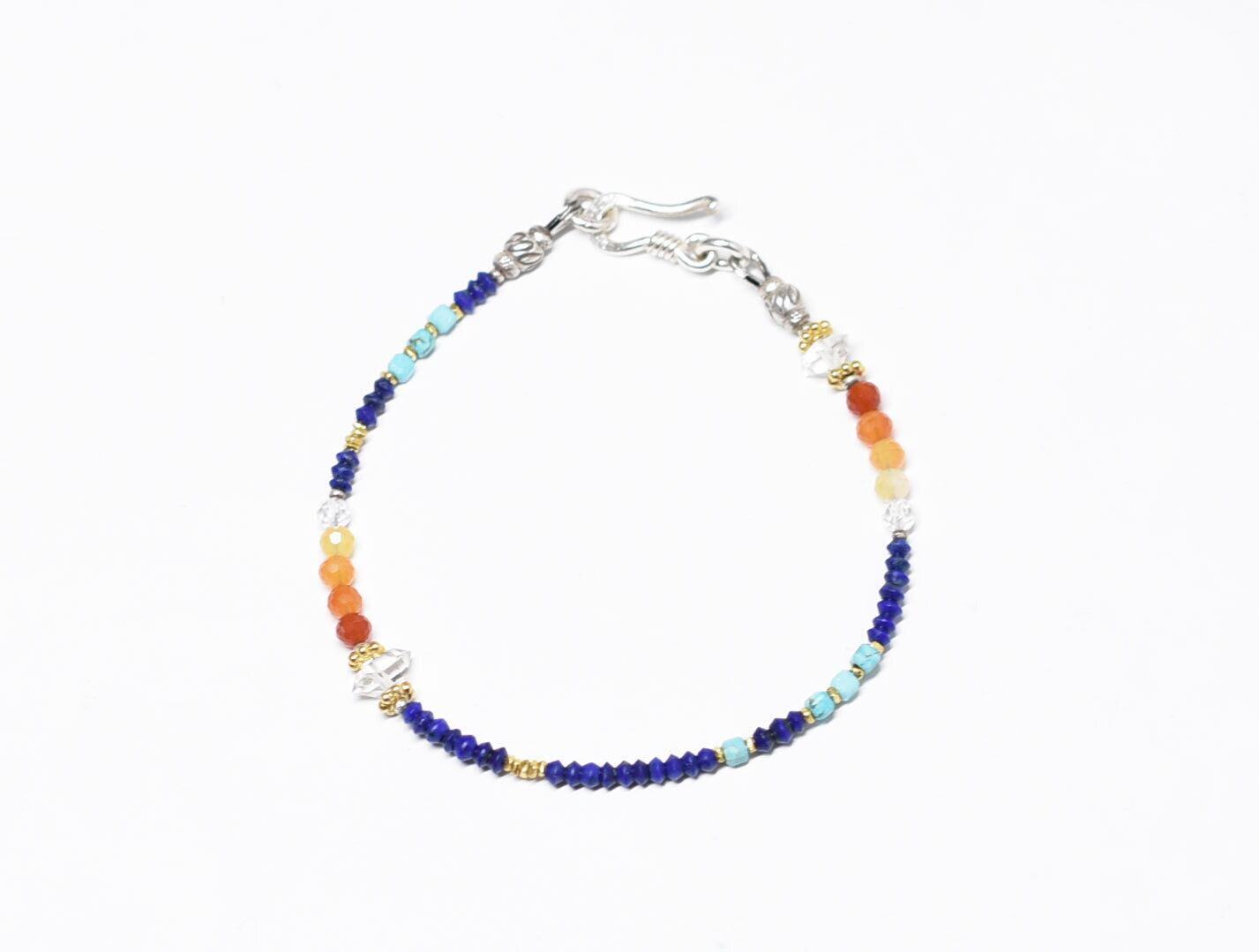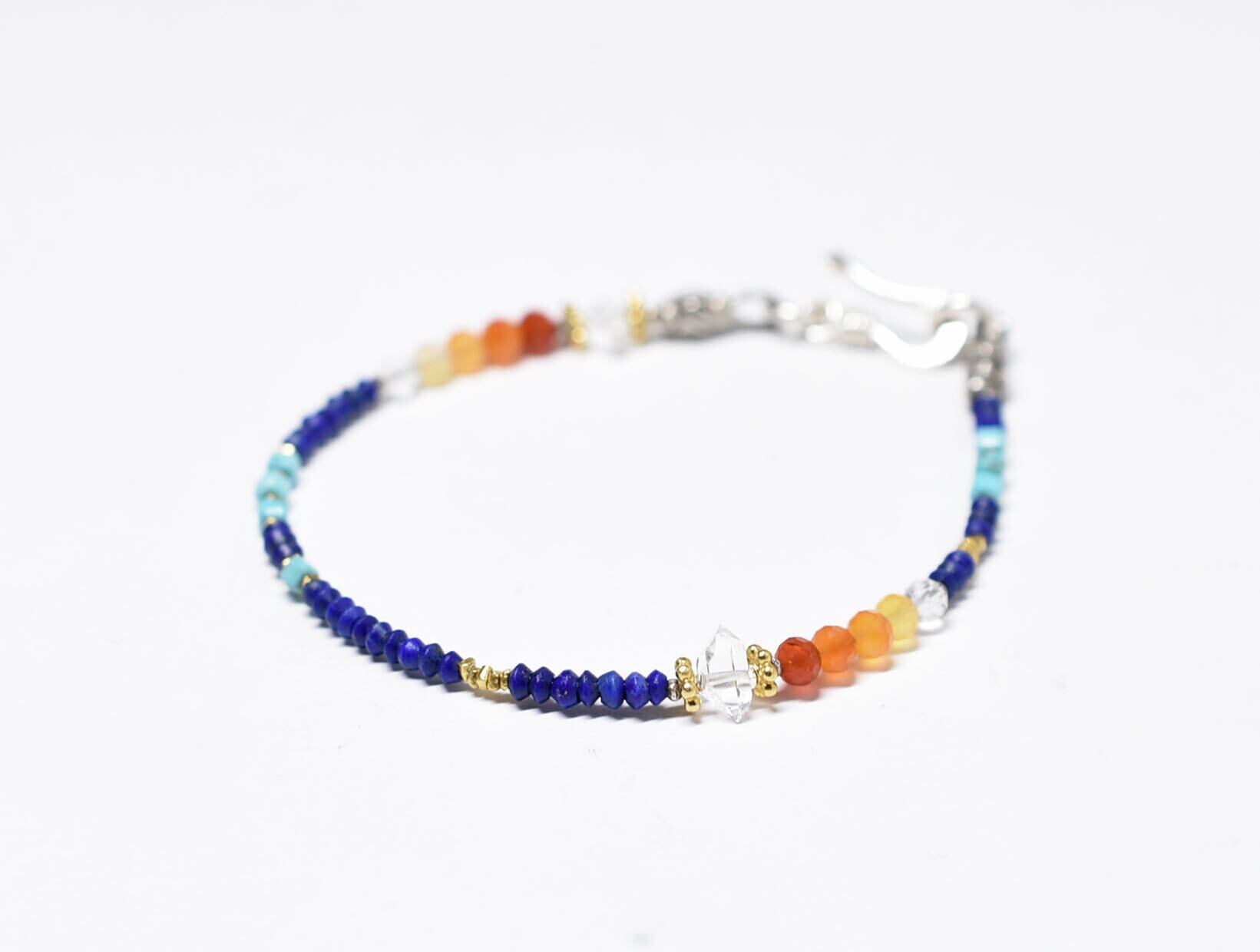カーネリアンとスクエアターコイズ、ハーキマーダイヤモンド、小さなラピス、カレンシルバーの華奢なブレス