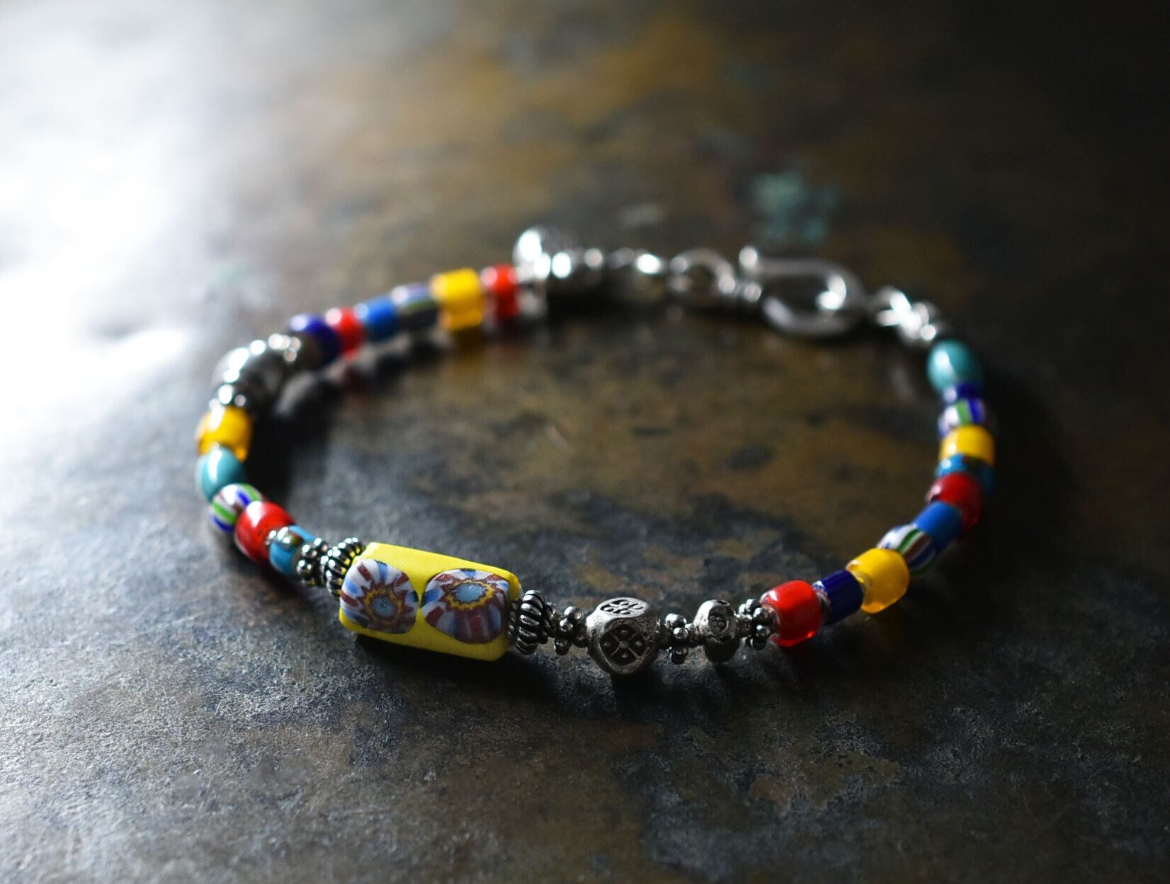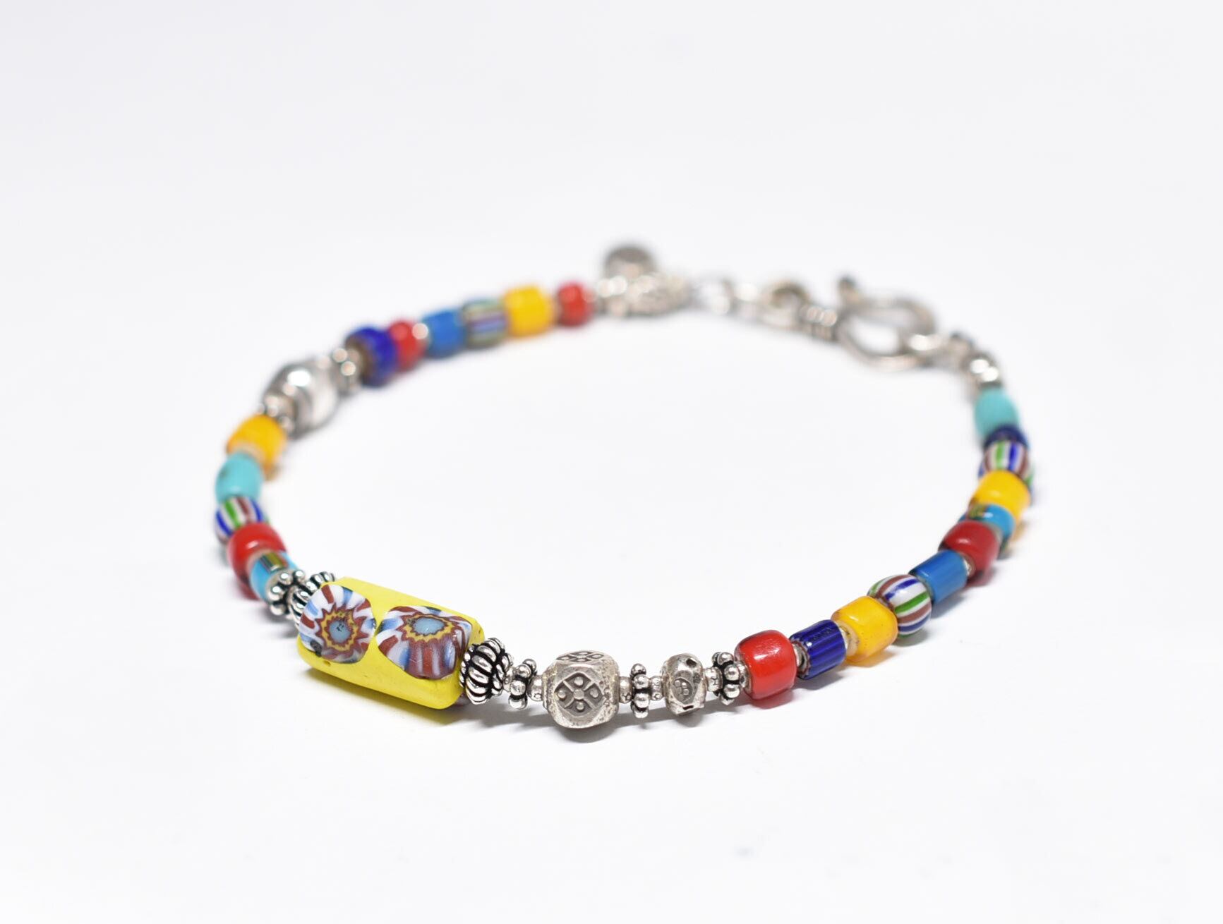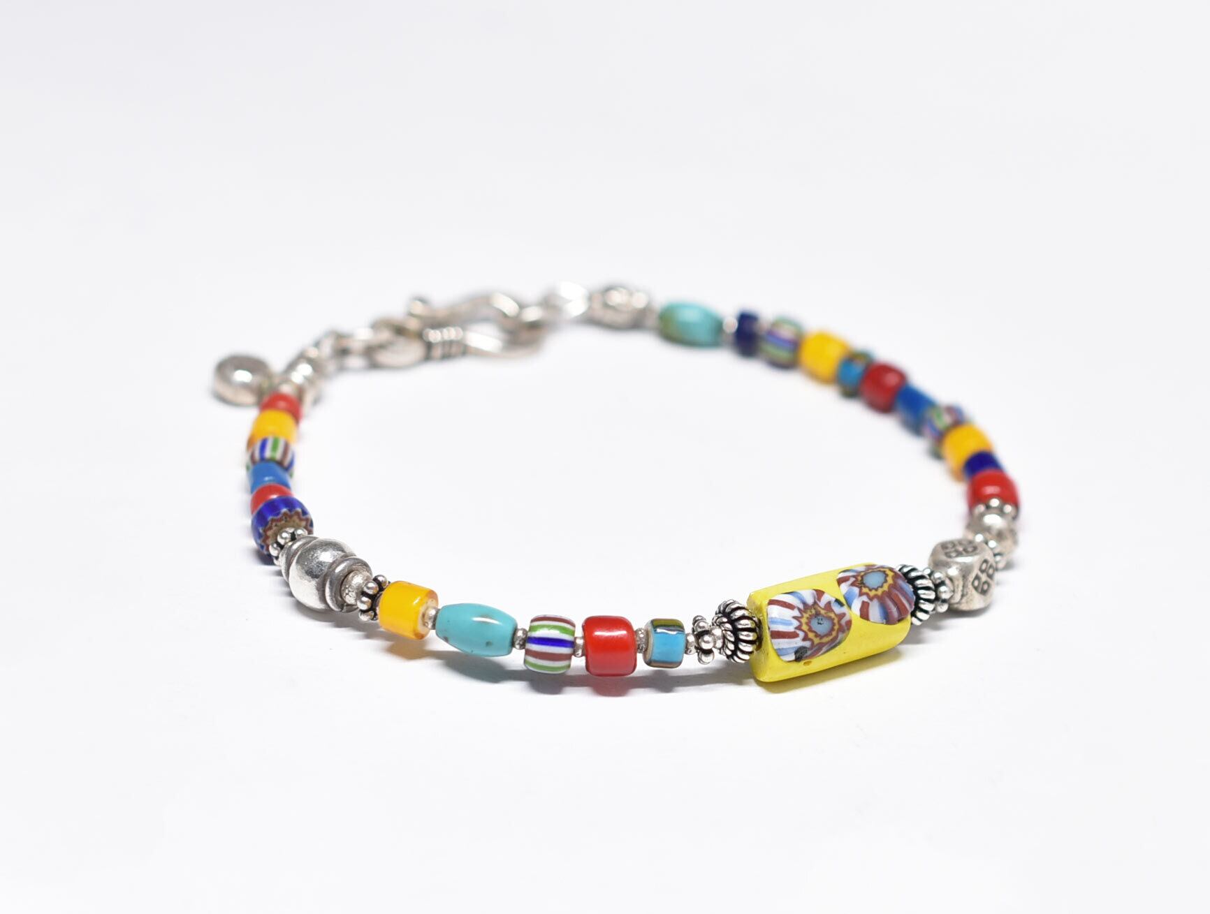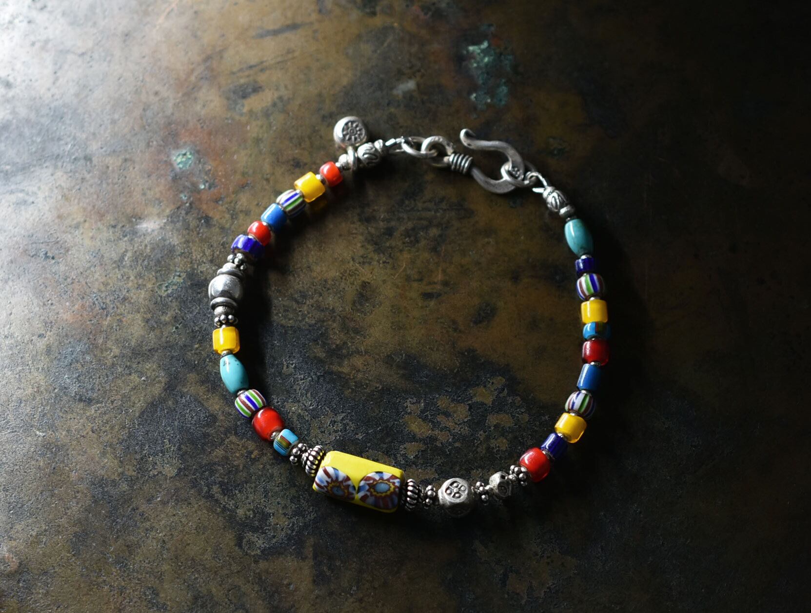 シェブロン柄ミルフィオリビーズとカレンシルバー、カラフルヴェネチアアンティークビーズ、ターコイズのブレス