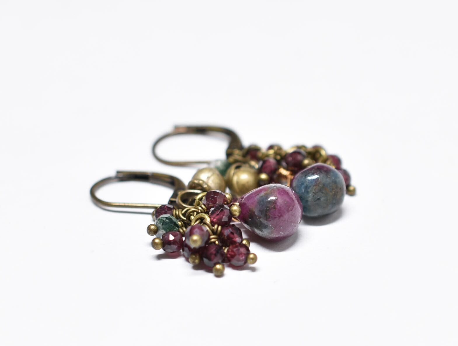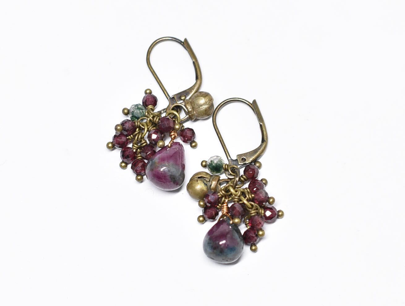 雫ルビーインゾイサイト、たわわなガーネット、モスアゲート、民族鈴を繋いだピアスです。