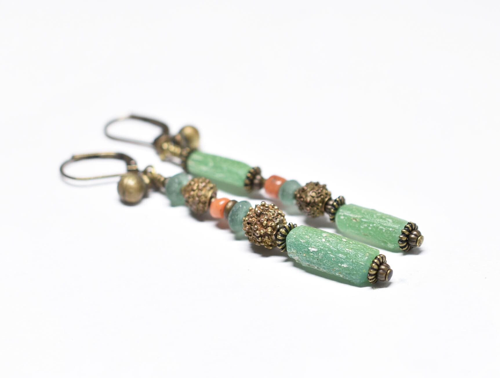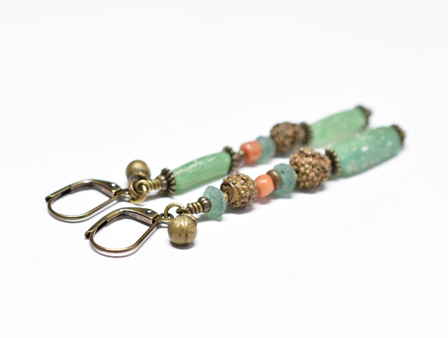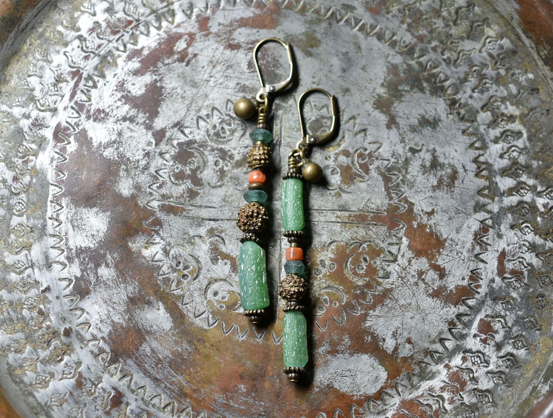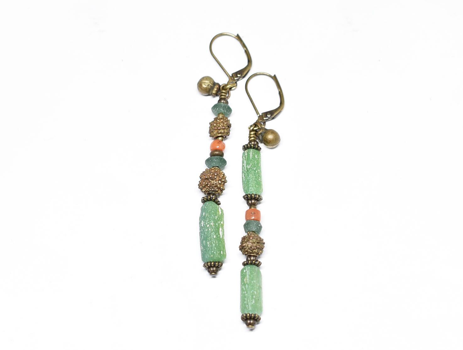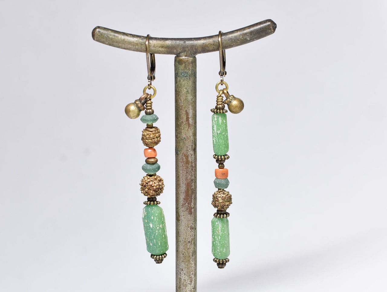 翡翠色ローマングラス、ベニン族のツブツブビーズ、チベタンコーラル、民族鈴のアンシメトリーピアス
