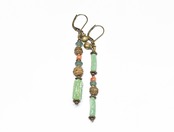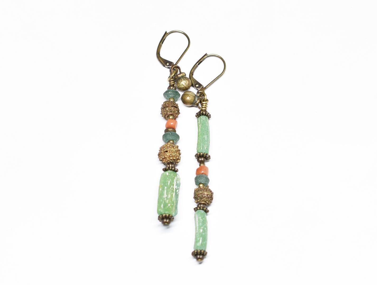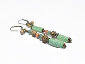 翡翠色ローマングラス、ベニン族のツブツブビーズ、チベタンコーラル、民族鈴を繋いだアンシメトリーピアスです。
