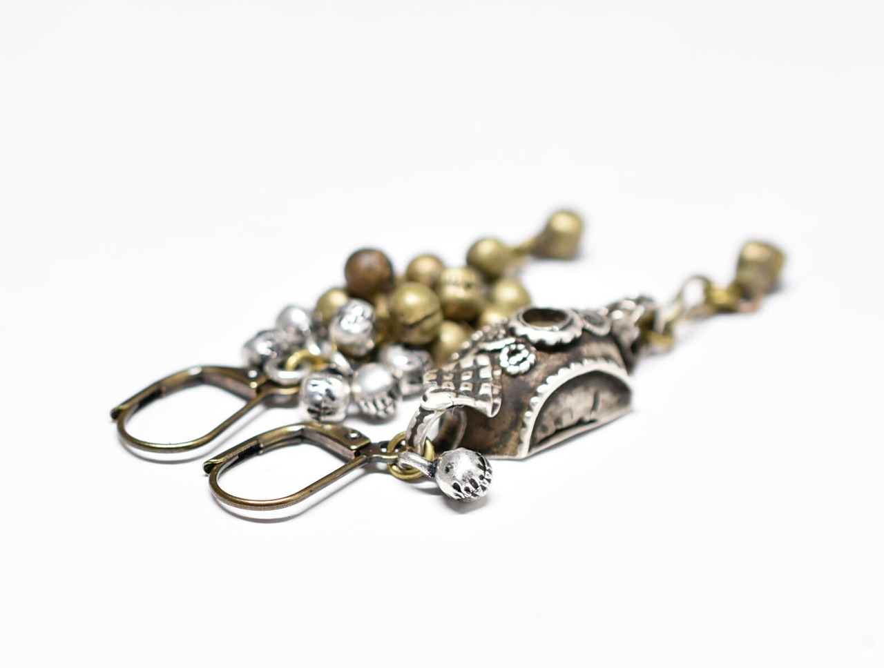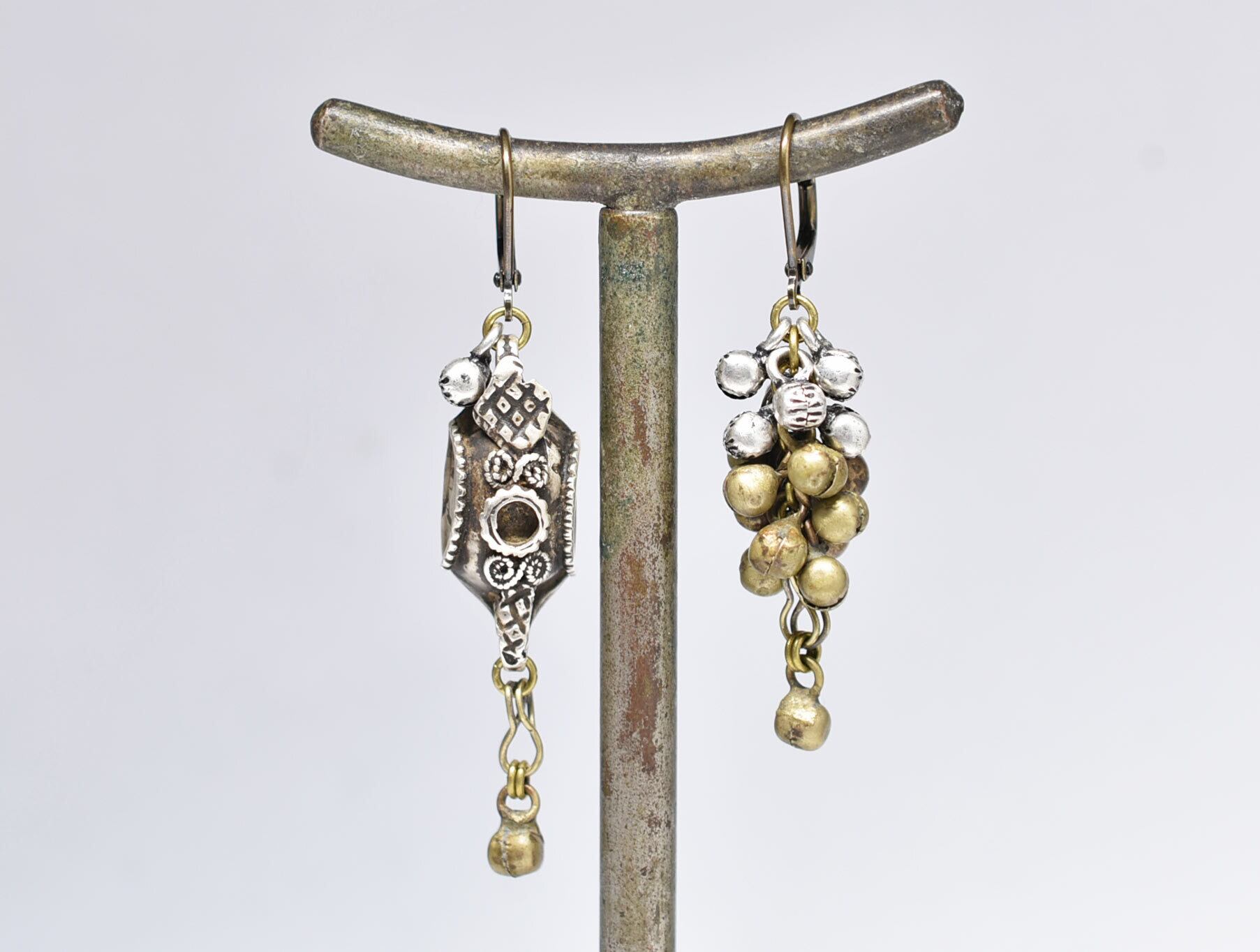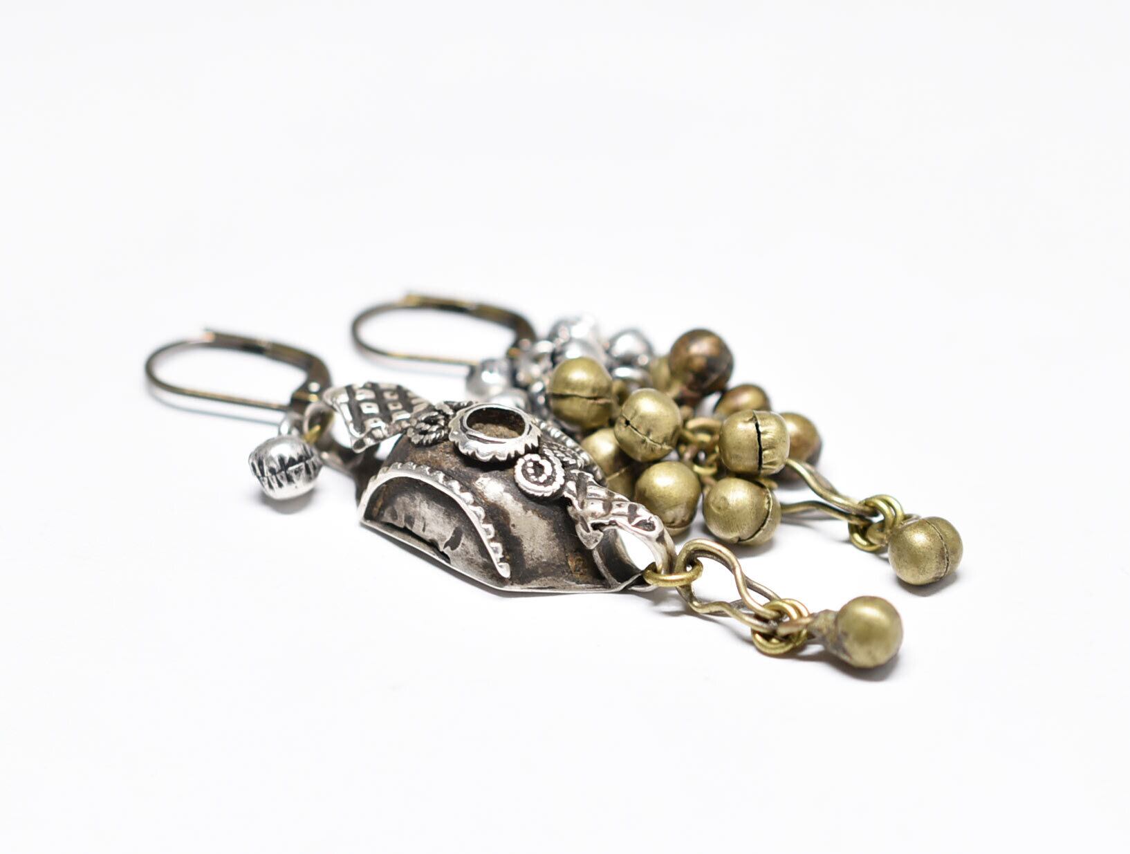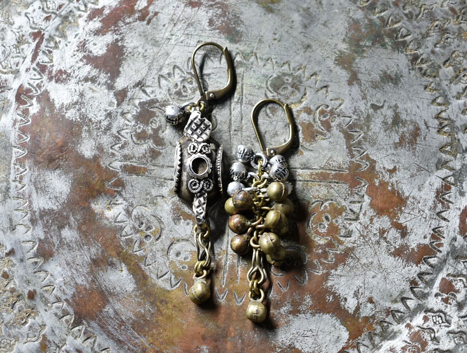 アフガンoldシルバーと民族鈴、インドシルバー鈴を繋いだアンシメトリーなピアスです。