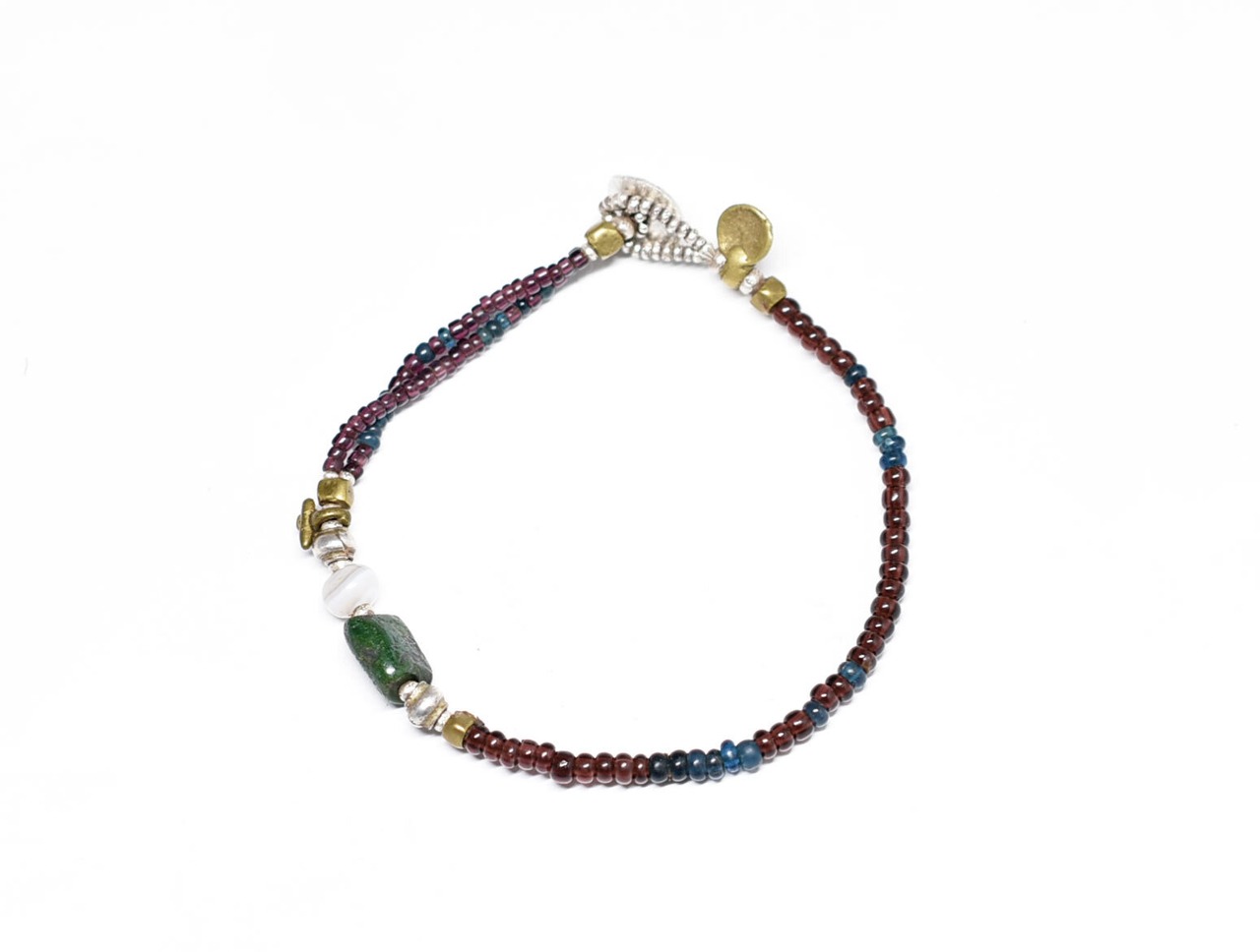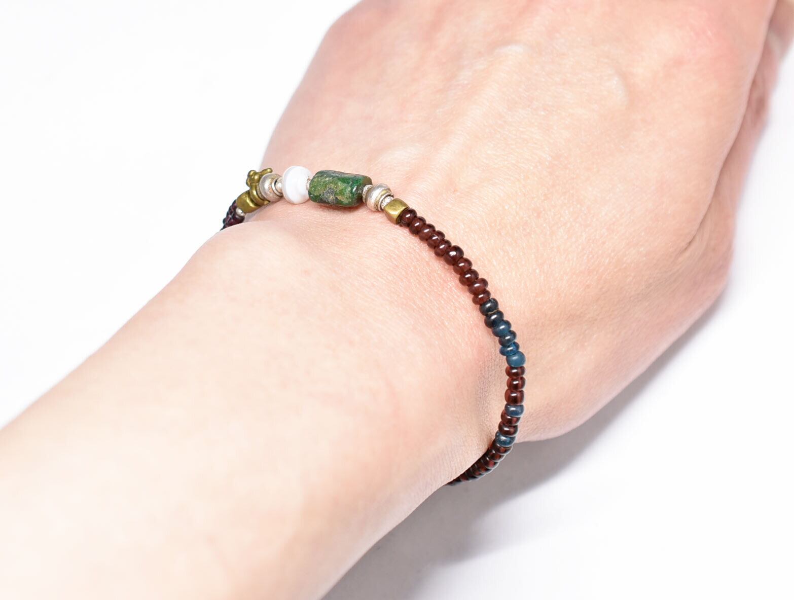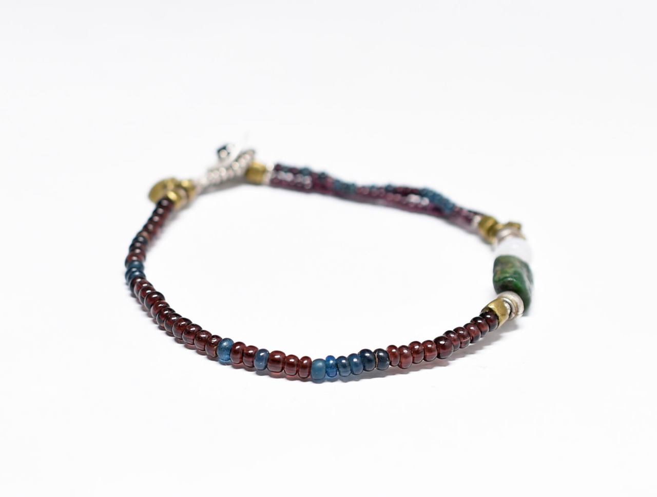 oldチベタンターコイズと古代瑪瑙、ワインレッド&インディゴブルービーズ、oldチンシルバー&オリッサブラスを繋いだブレスです。
