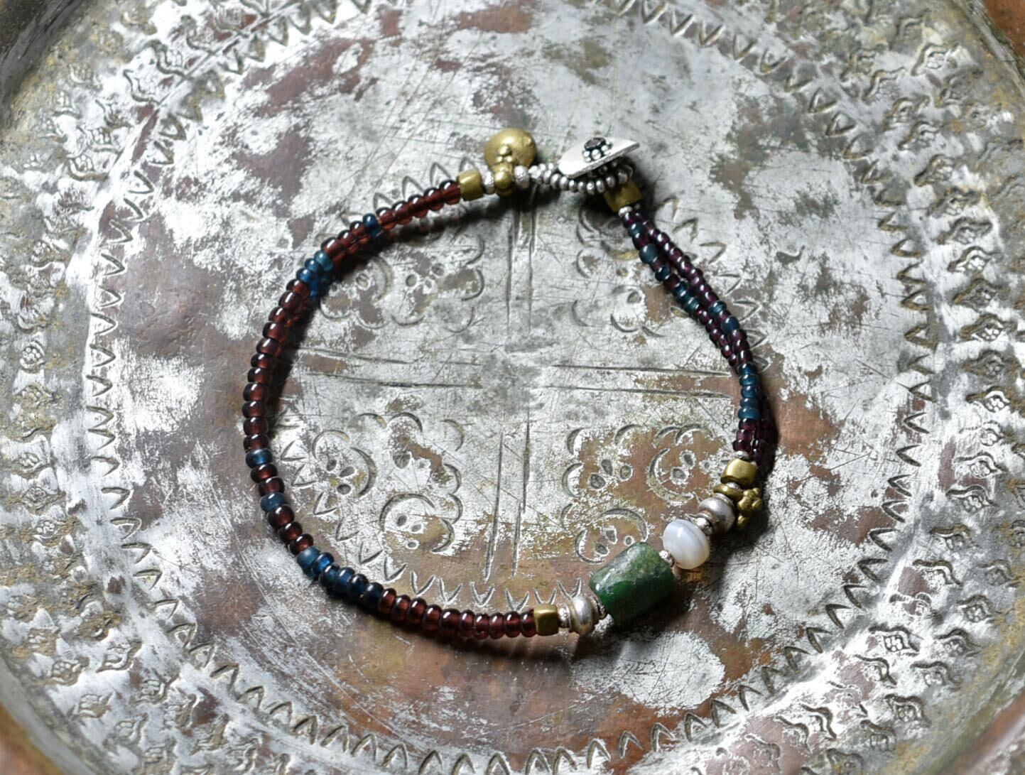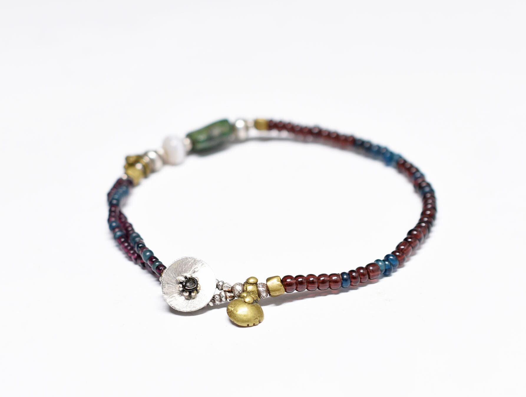 oldチベタンターコイズと古代瑪瑙、ワインレッド&インディゴブルービーズ、oldチンシルバー&オリッサブラスのブレス