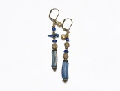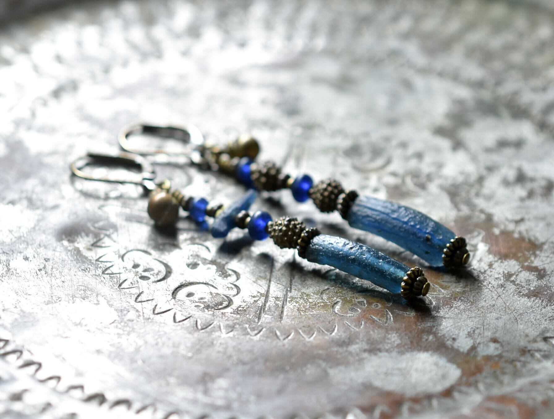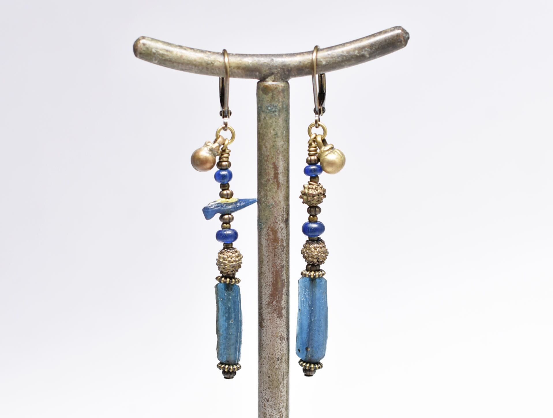 ブルーローマングラス、ベニン族のツブツブビーズ、ブルーアンティークビーズ、民族鈴のアンシメトリーピアス