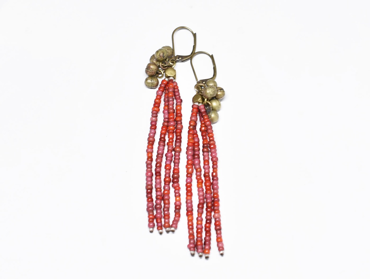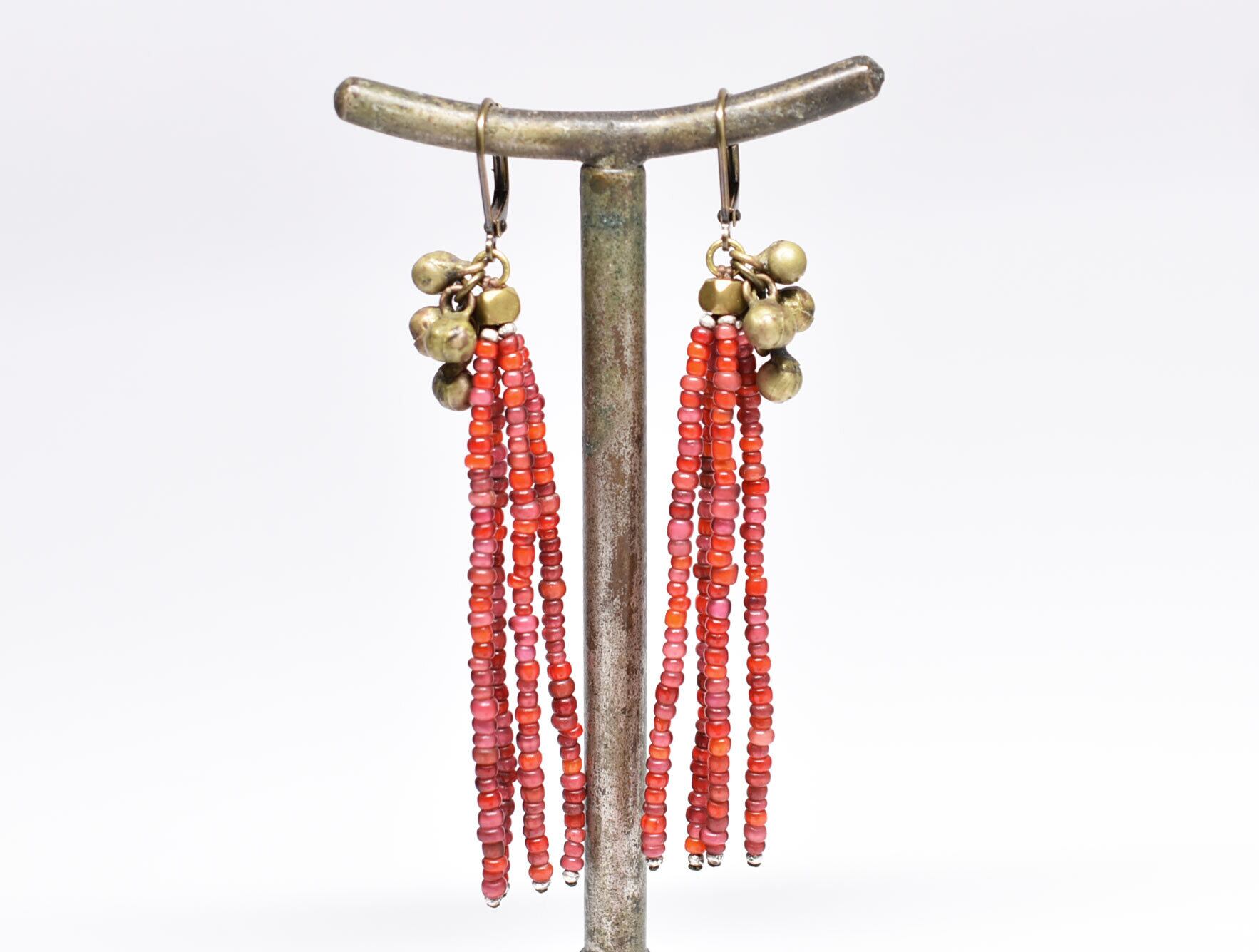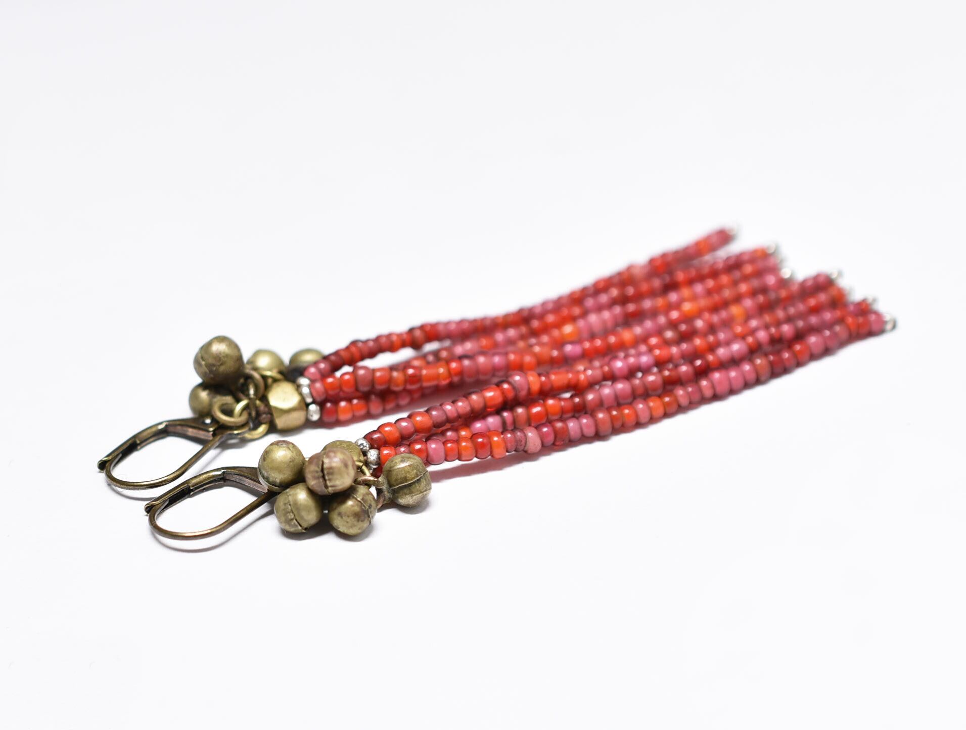 アンティーク金赤mixホワイトハーツとたわわな民族鈴を繋いだ4連ピアスです。