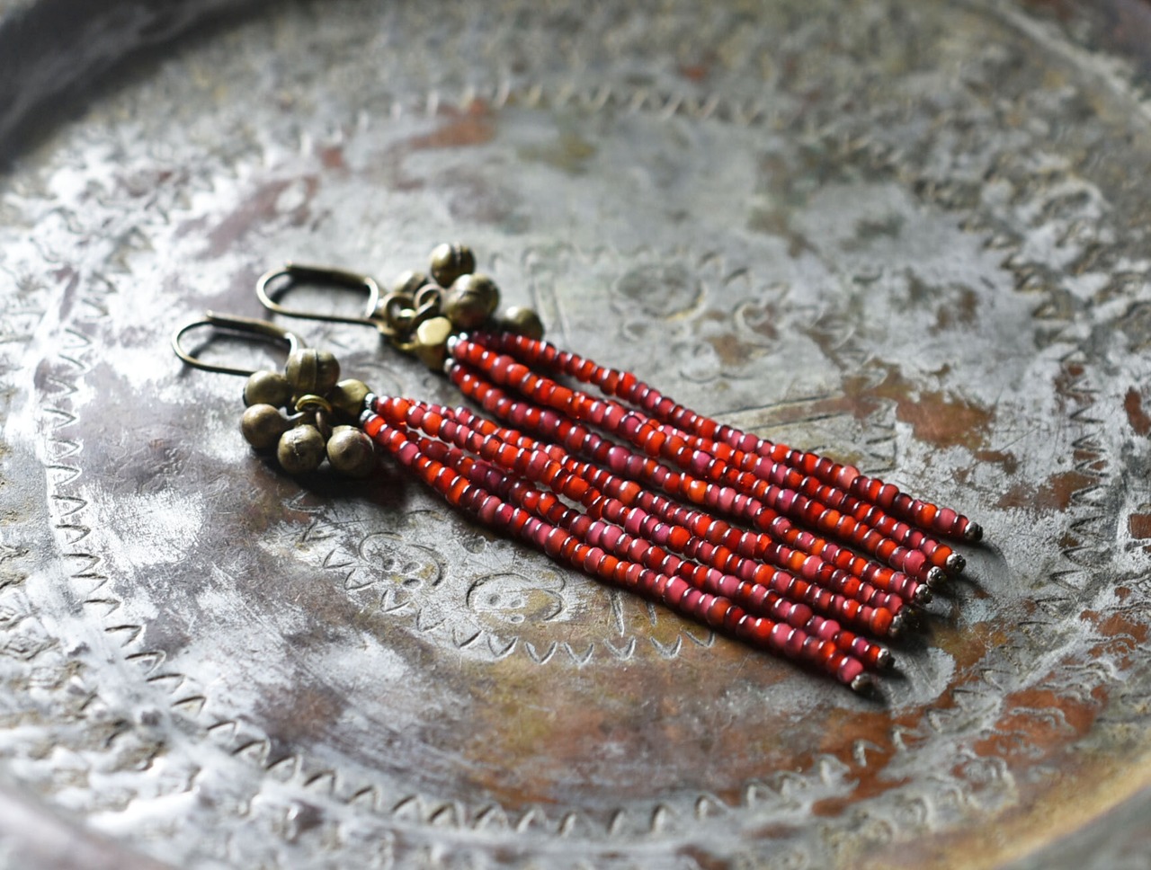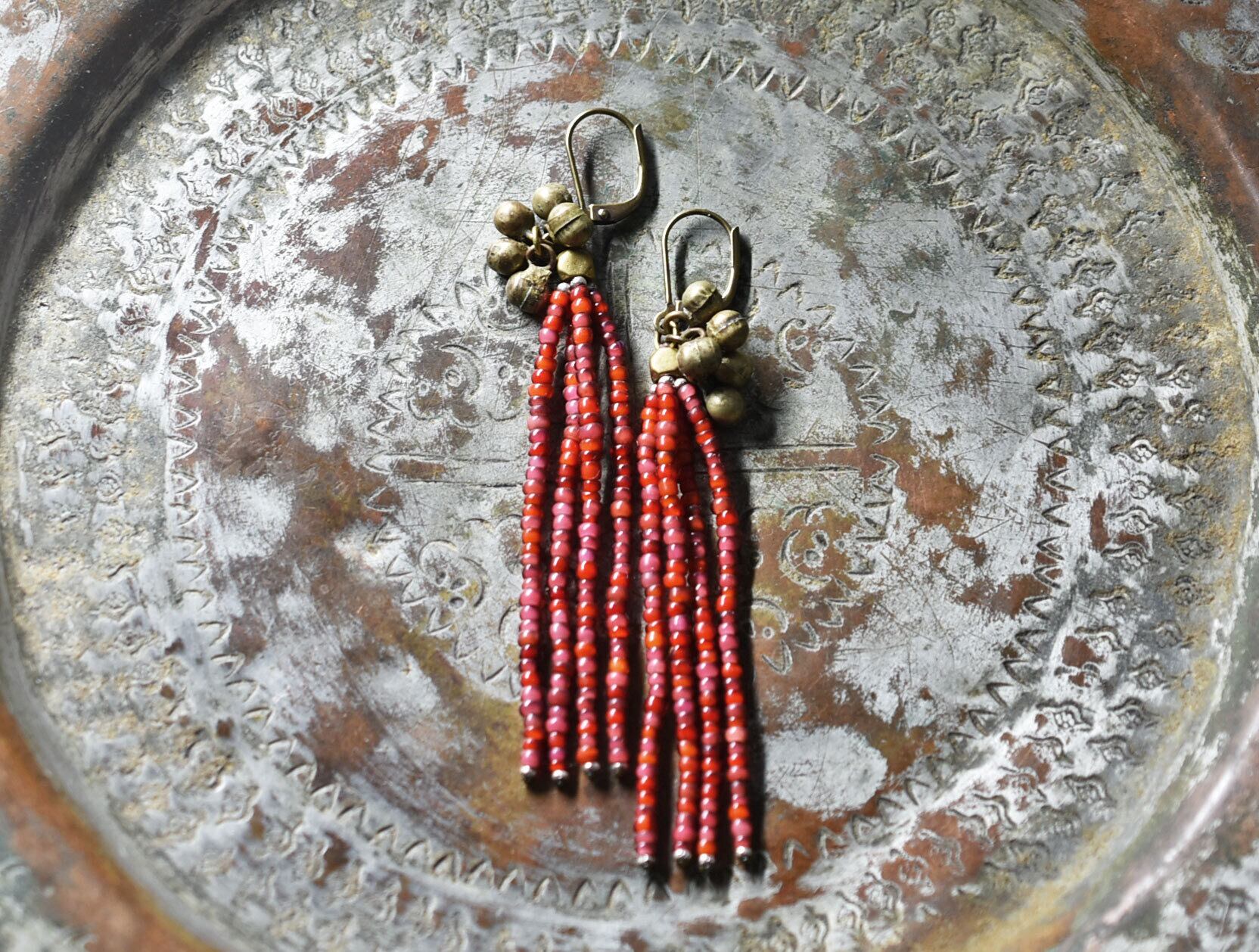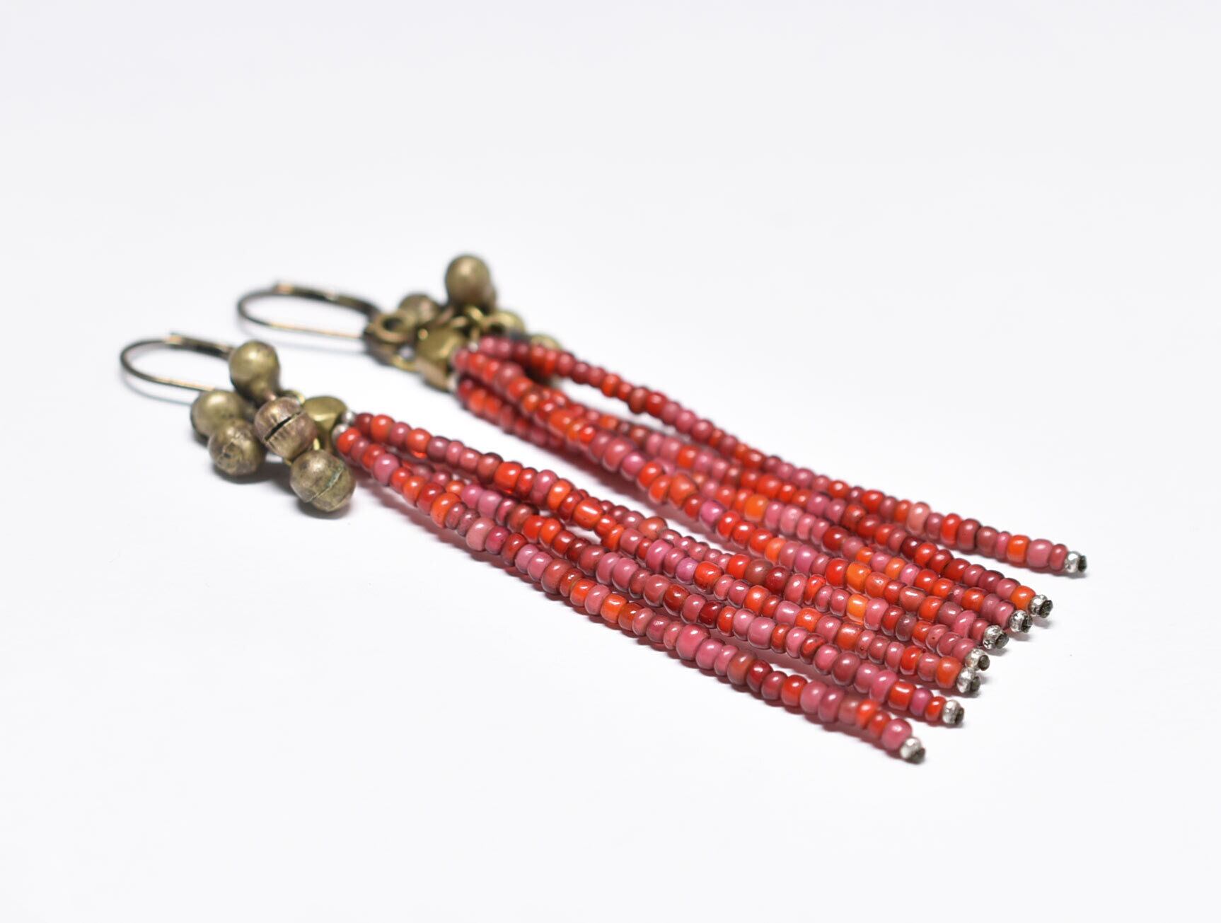 アンティーク金赤mixホワイトハーツとたわわな民族鈴を繋いだ4連ピアスです。
