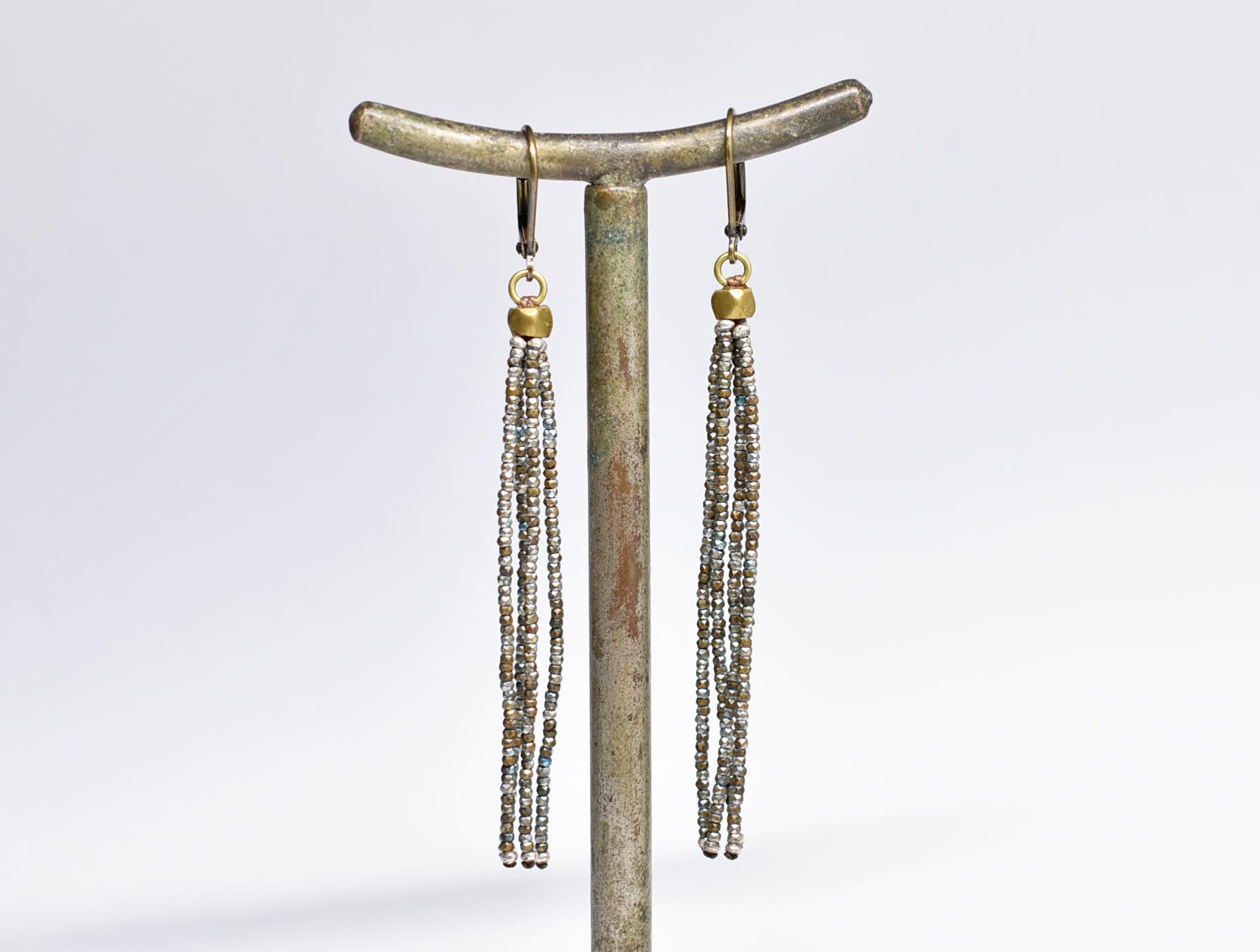 上部の鈍い金色のビーズはoldオリッサブラスです。インドのオリッサ州から届いた古い真鍮ビーズです。とっても希少なメタルビーズです。