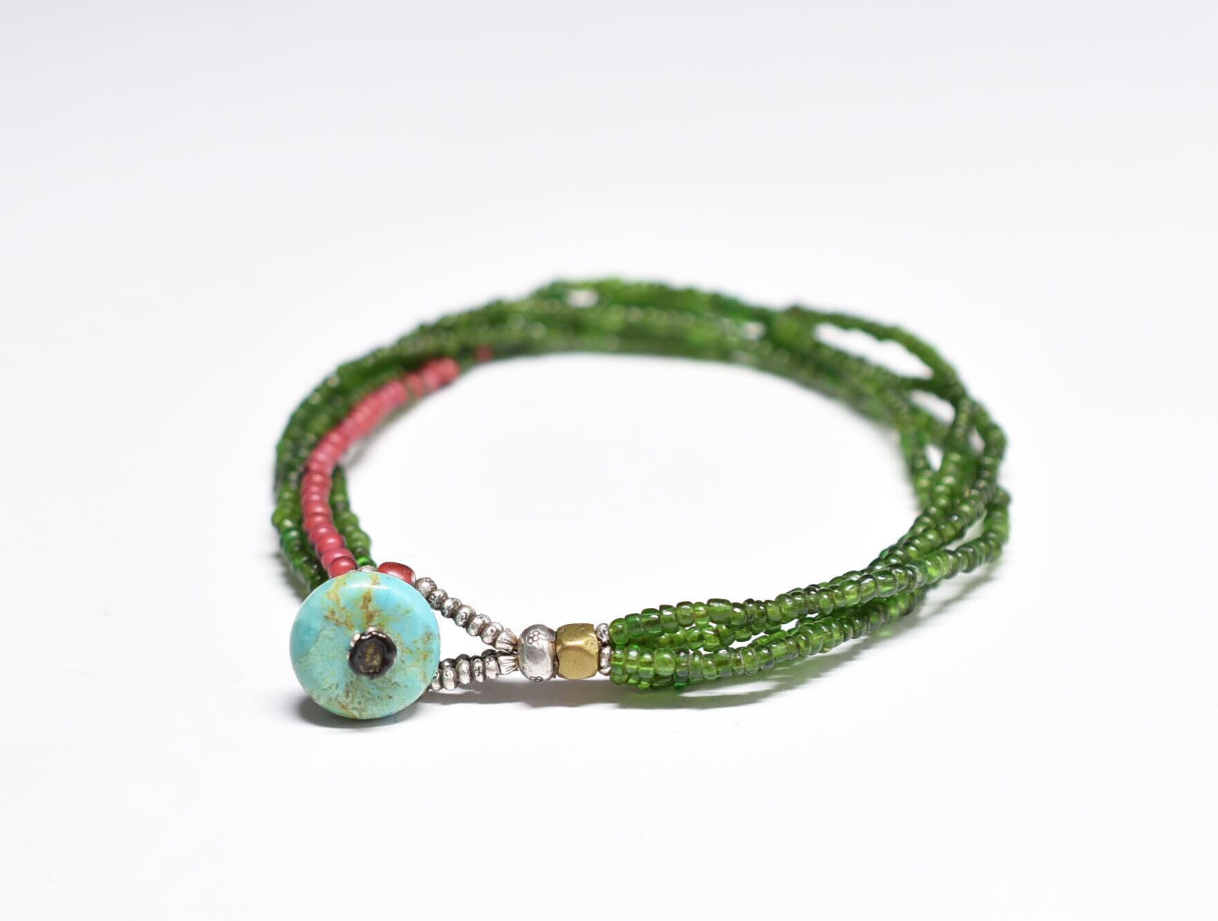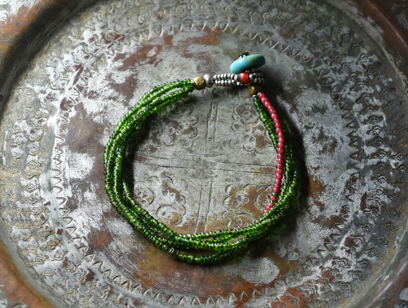 アンティークグリーンシードビーズと金赤ホワイトハーツの4連ブレス(ターコイズ留め金)