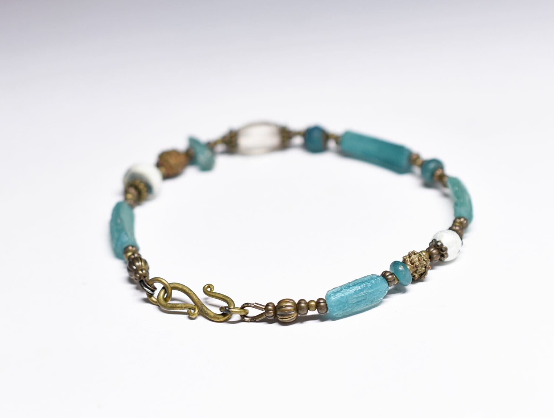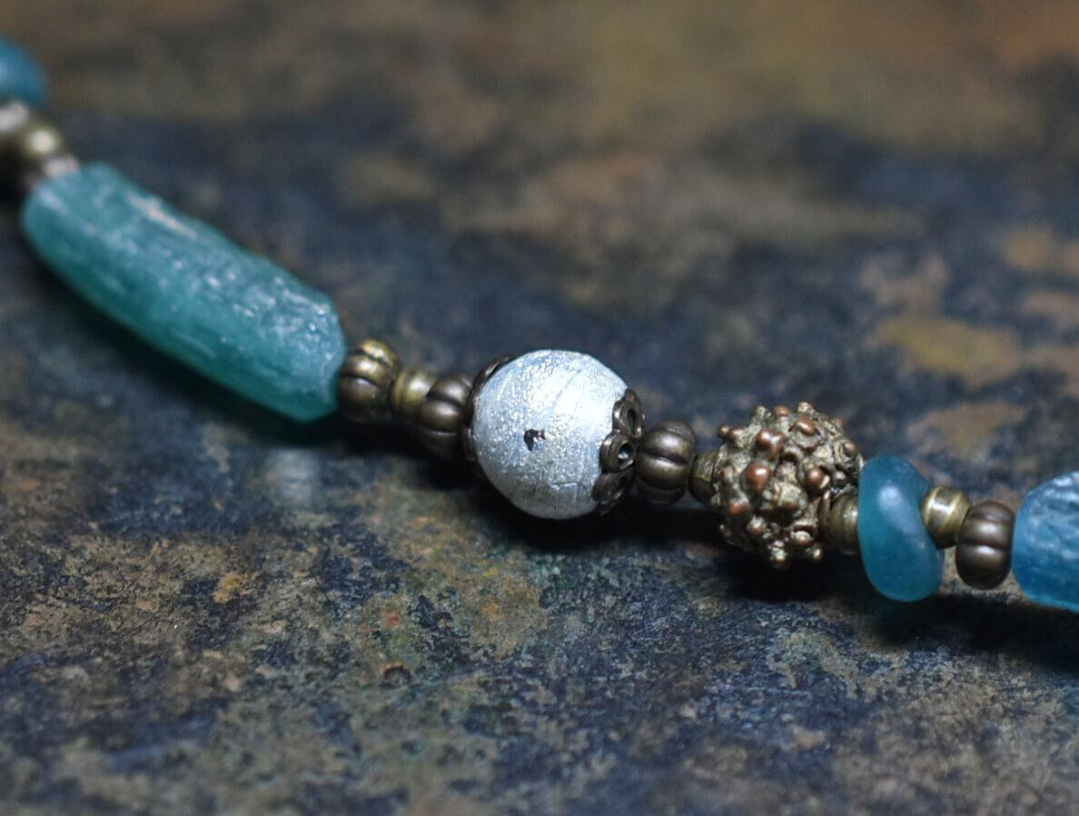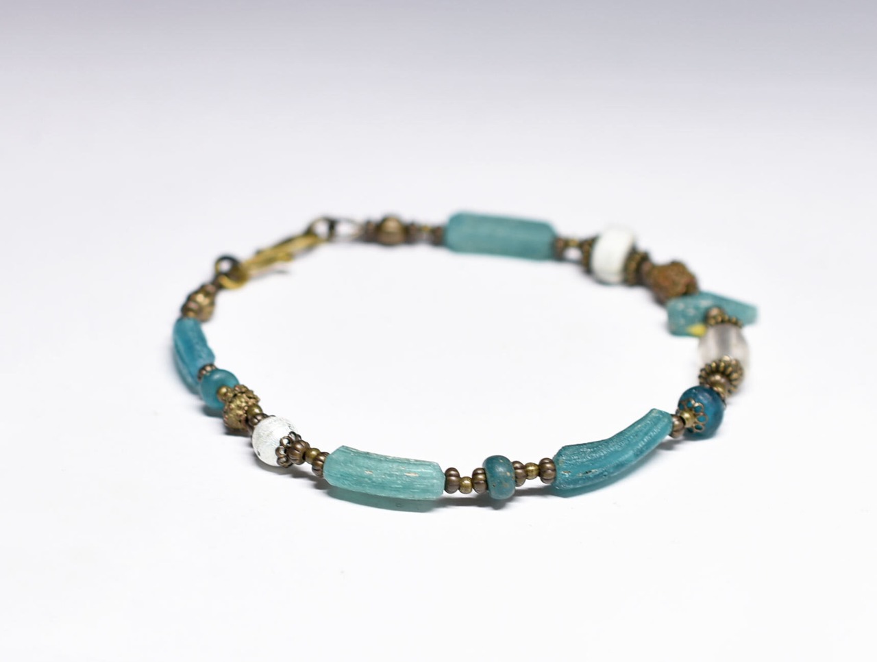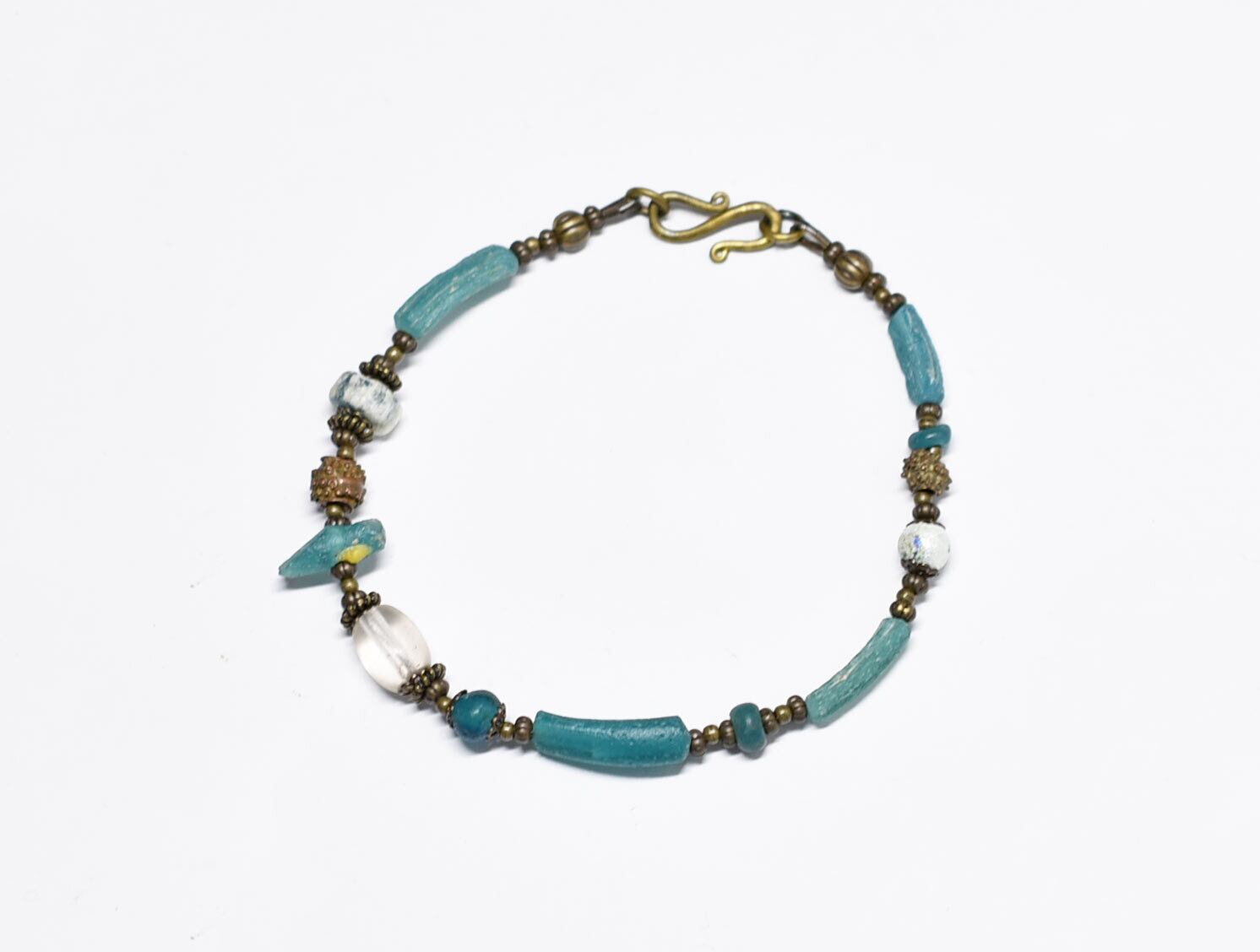 エメラルドグリーンローマングラスとアンティークボヘミアビーズ、発掘ビーズ、銀化ビーズ、民族族ブラスのブレス
