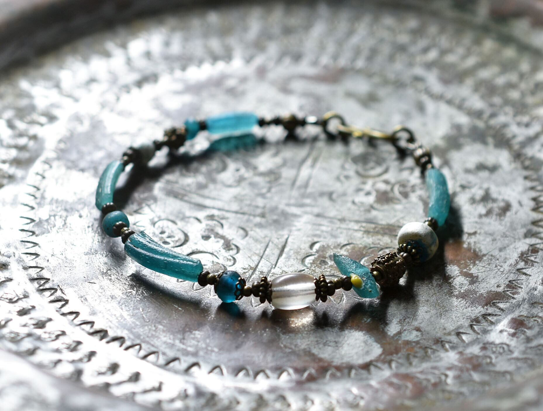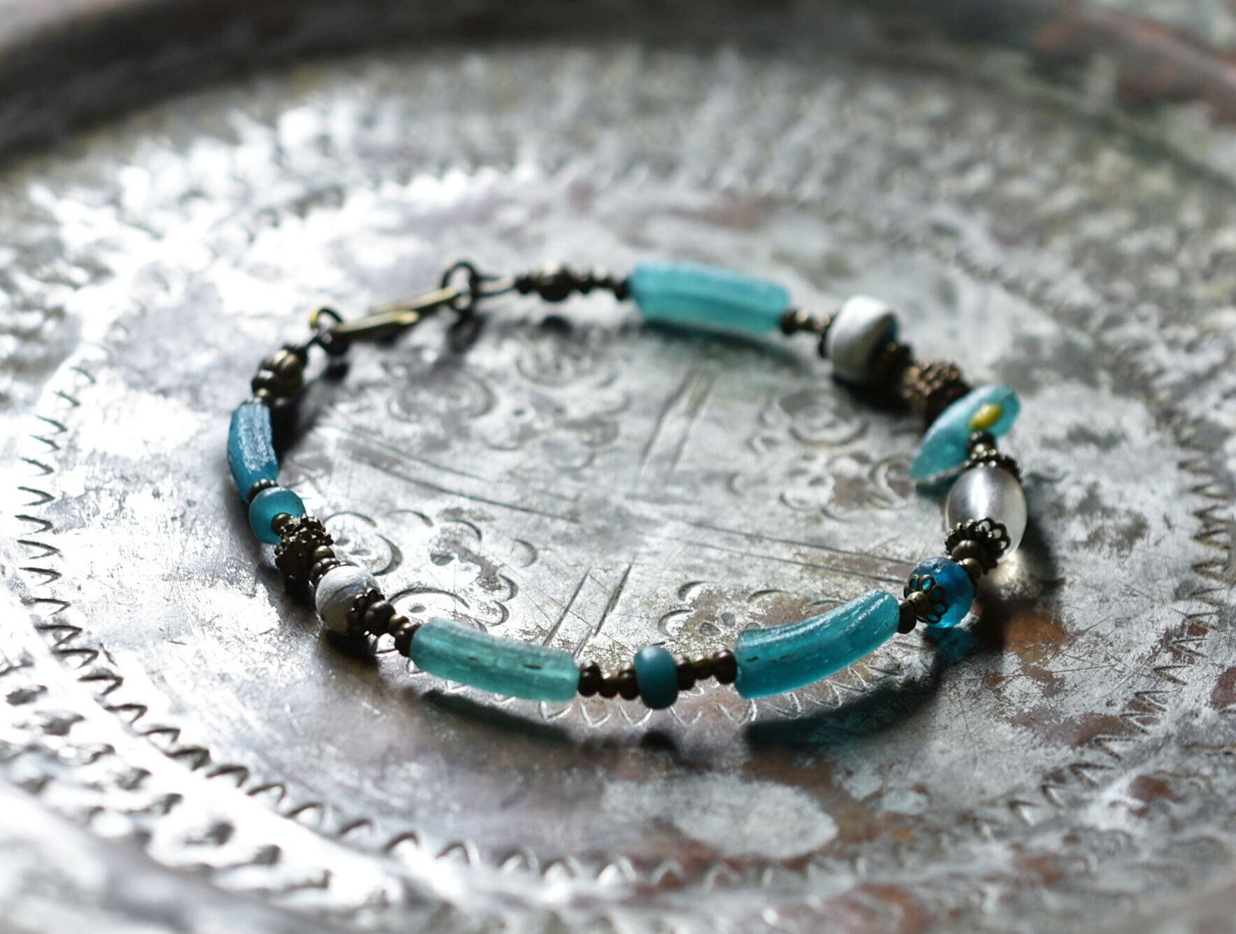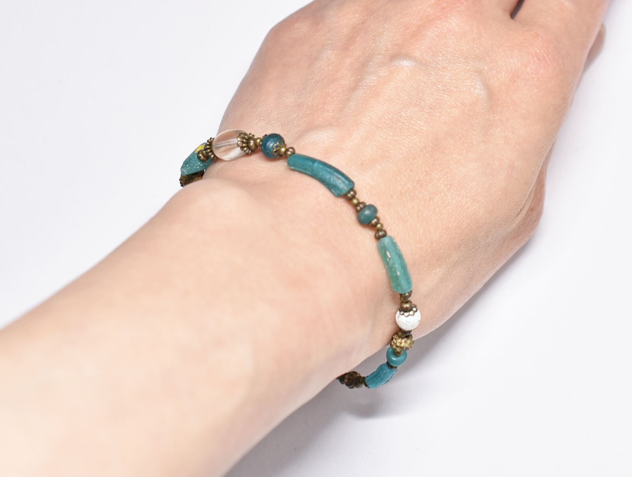 エメラルドグリーンローマングラスとアンティークボヘミアビーズ、発掘ビーズ、銀化ビーズ、民族族ブラスを繋いだブレスです。
