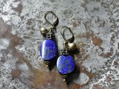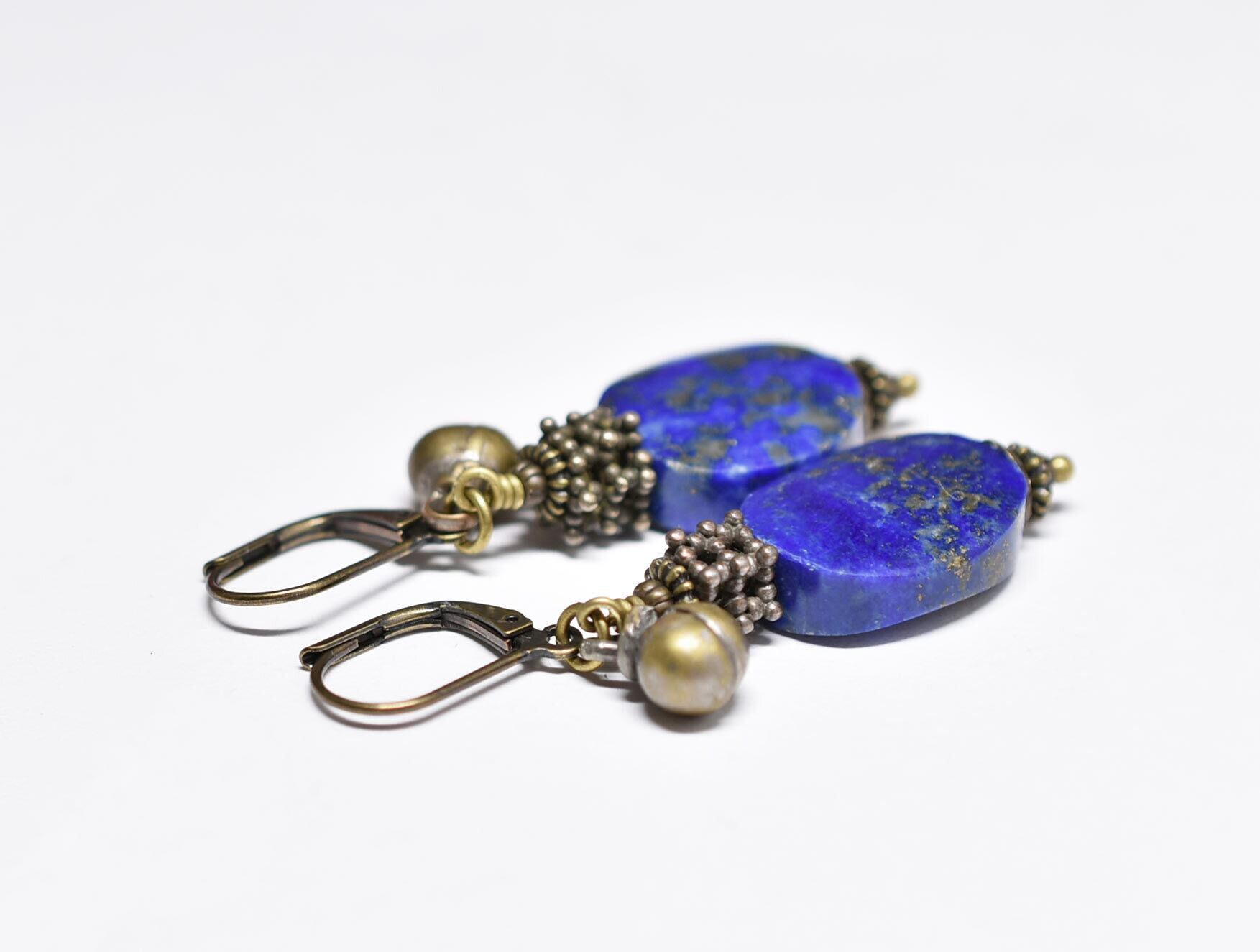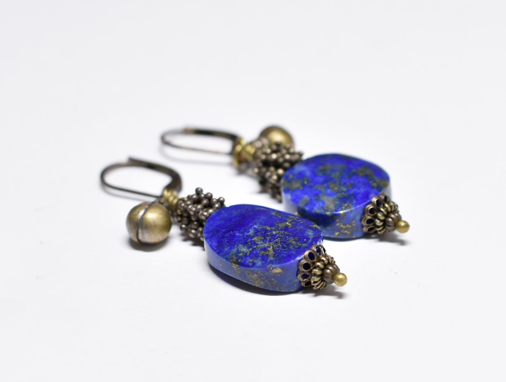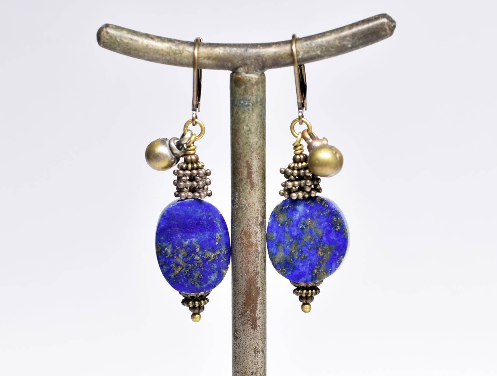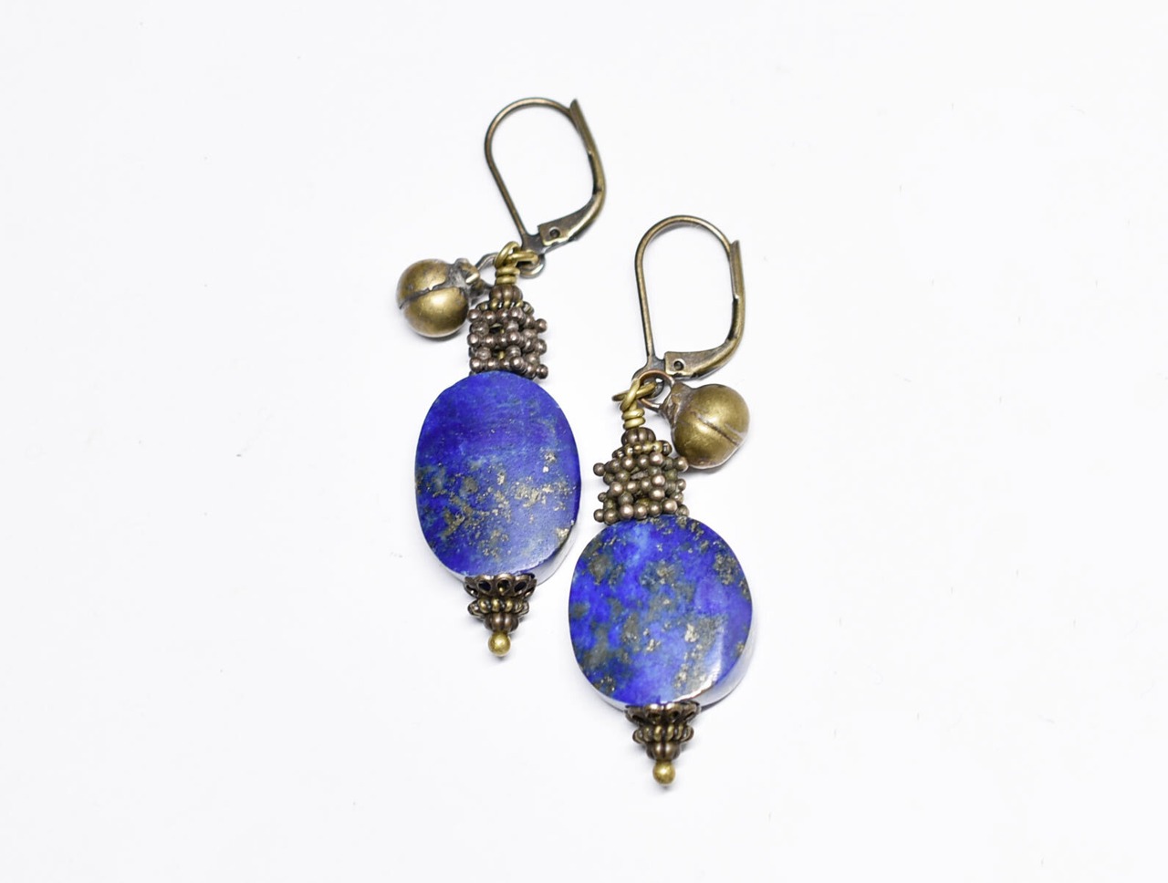 楕円型ラピスラズリとoldメタル、民族鈴のピアス