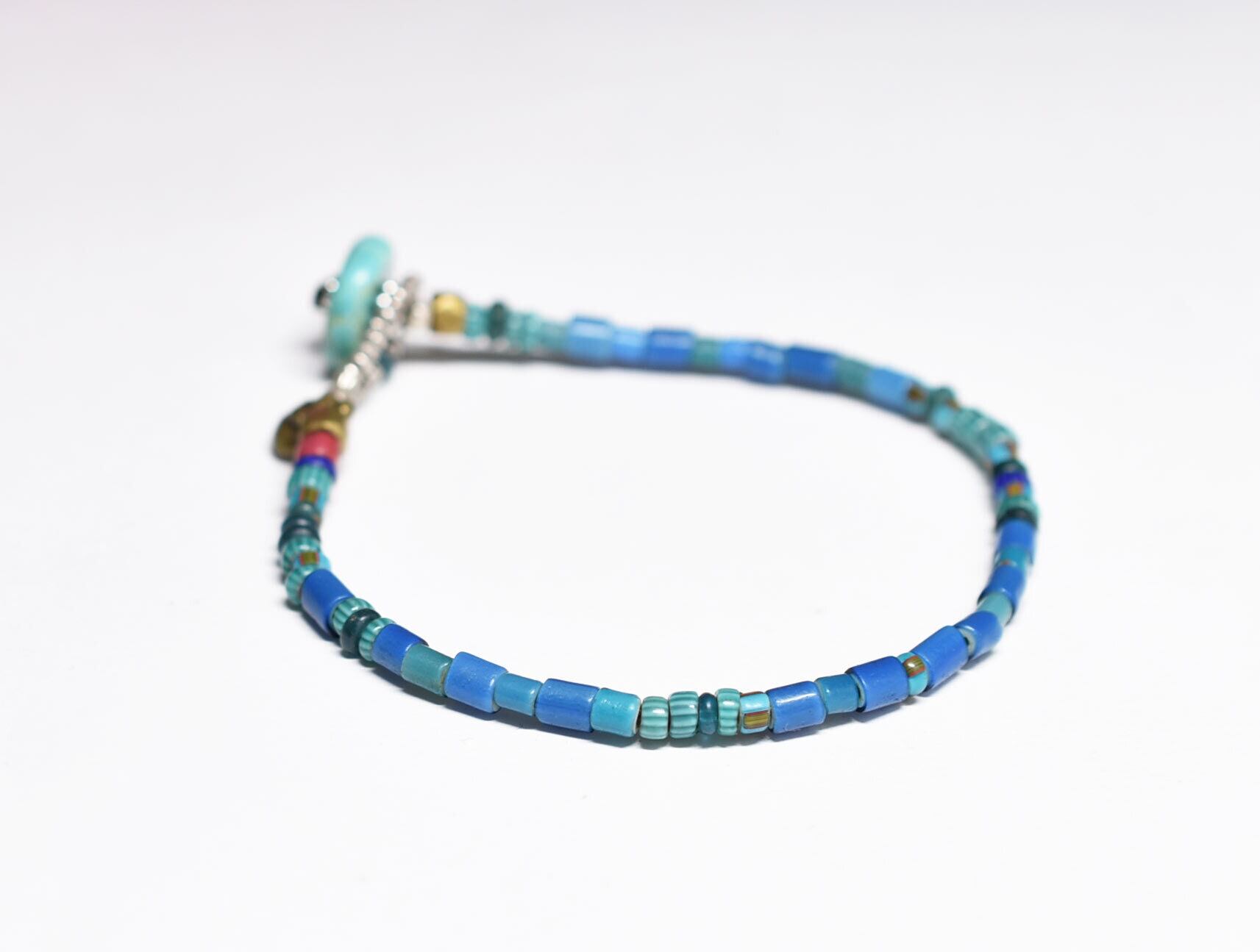 多彩ブルーアンティークホワイトハーツ&シェブロンビーズのブレス(ターコイズ留め金)