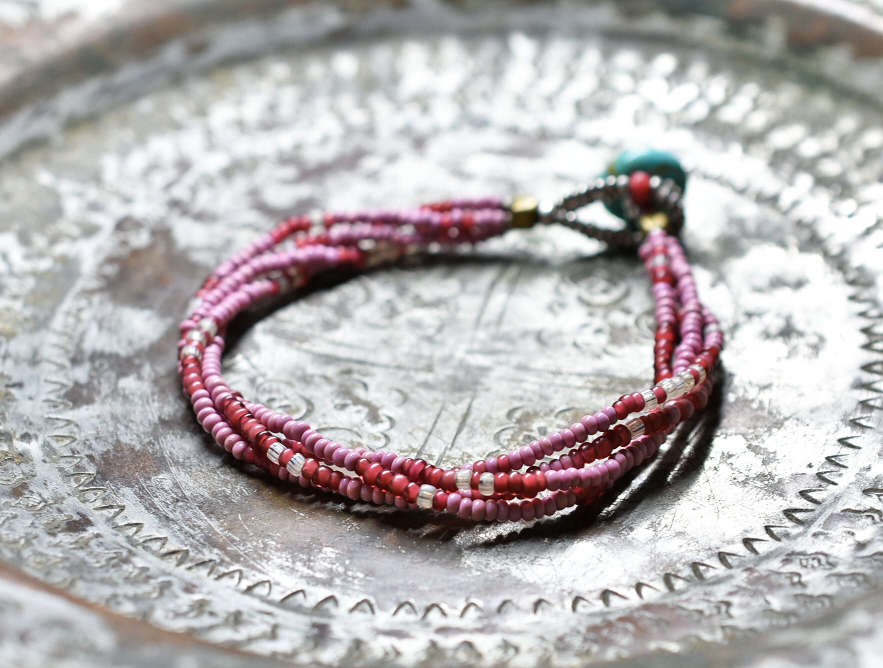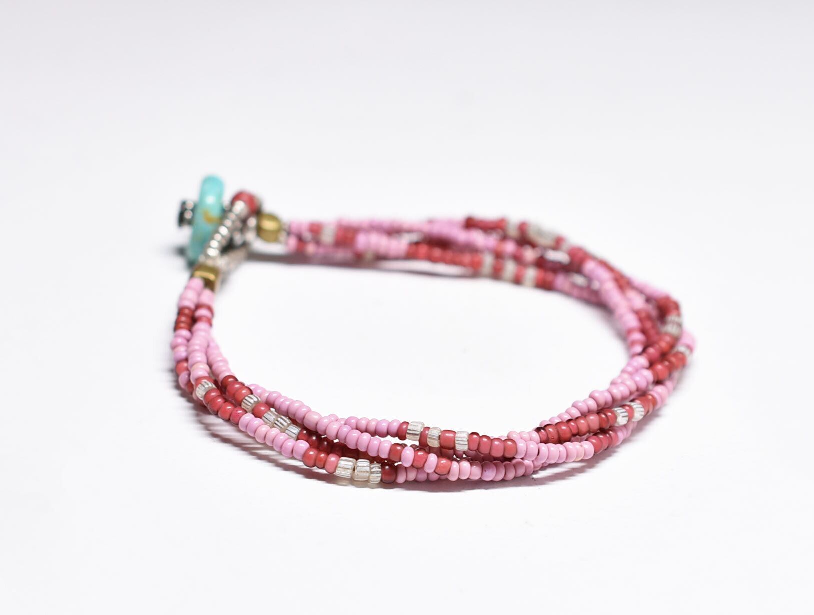 ピンクマサイ、金赤ホワイトハーツ、グーズベリーの4連ブレス(ターコイズ留め金)