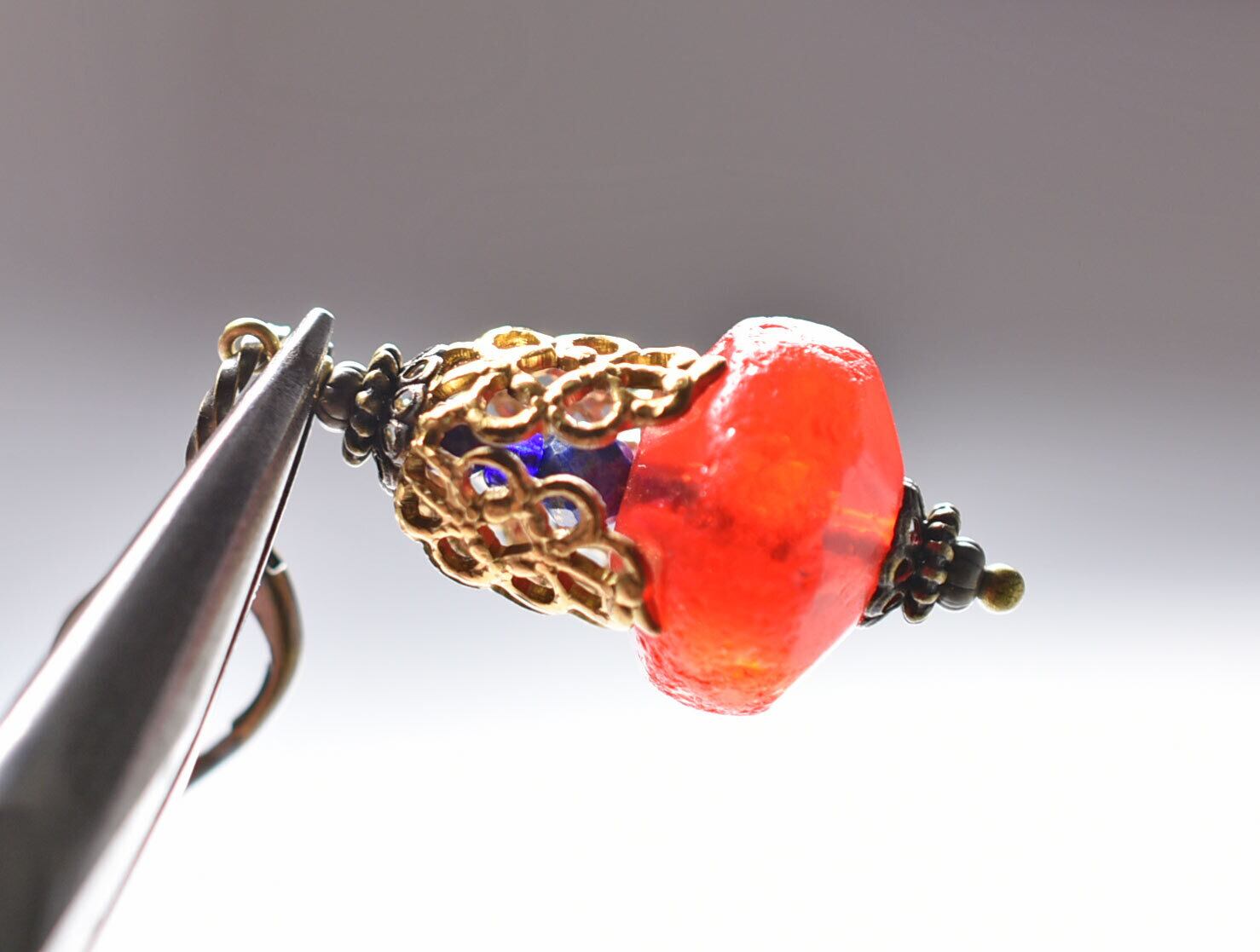 透かしブラスキャップの中には、カットが施されたラピスを2粒と、ブルーのヴェネチアアンティークビーズ忍ばせています。
