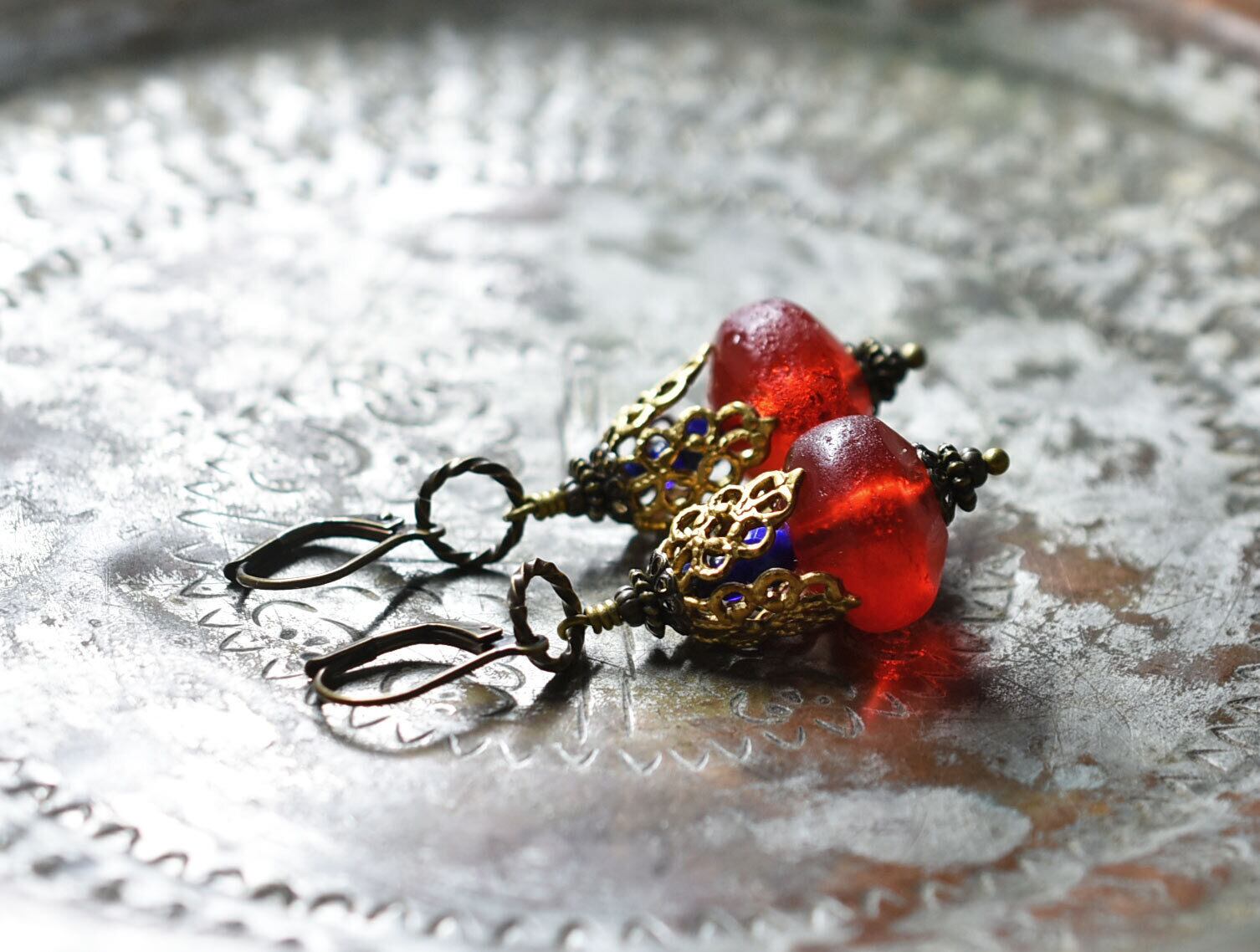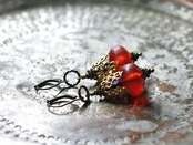 真っ赤な算盤型アンティークボヘミアビーズと繊細装飾ブラスキャップ、ラピスとブルービーズを繋いだボリュームのあるピアスです。