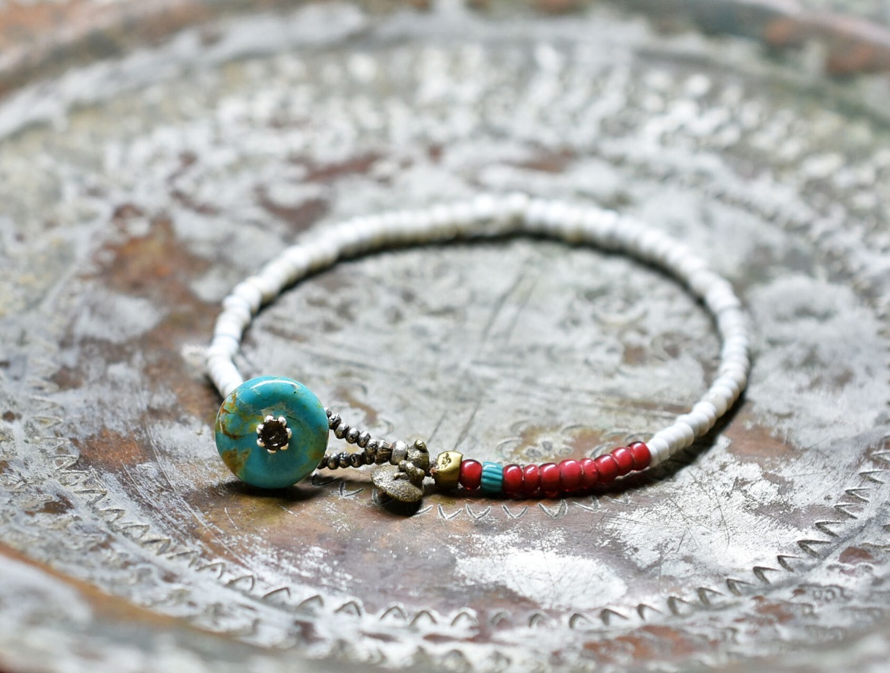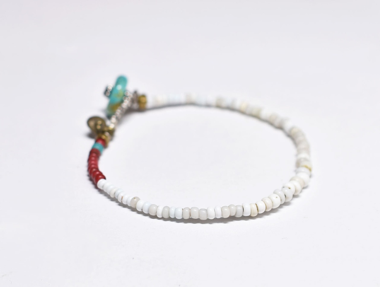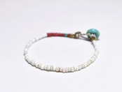 カリマンタン島アンティークホワイトビーズと金赤ホワイトハーツ、ターコイズブルーシェブロンビーズを繋いだブレスです。