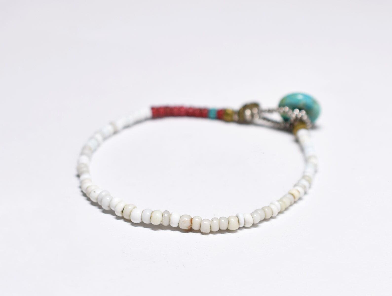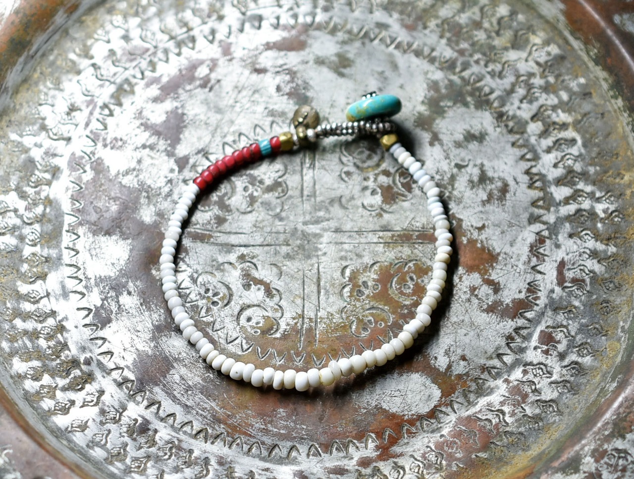 カリマンタン島アンティークホワイトビーズと金赤ホワイトハーツ、ターコイズブルーシェブロンビーズのブレス(ターコイズ留め金)