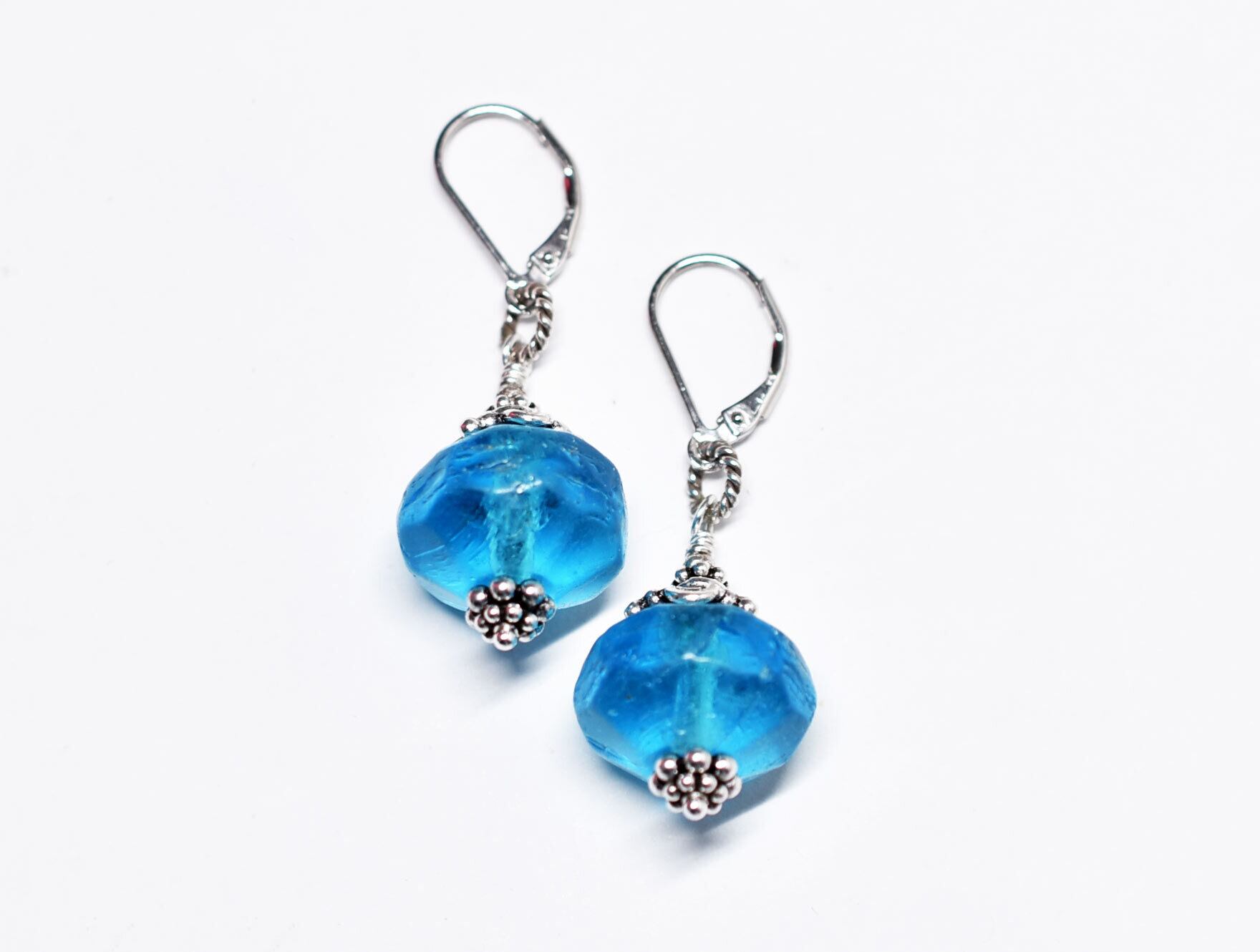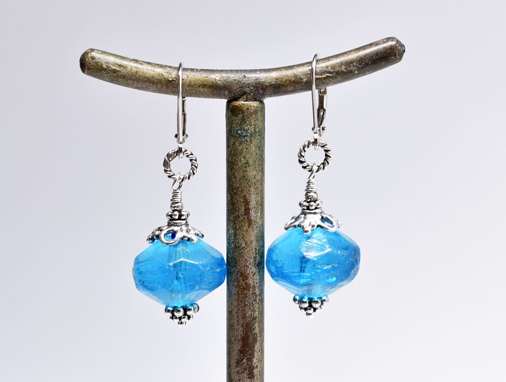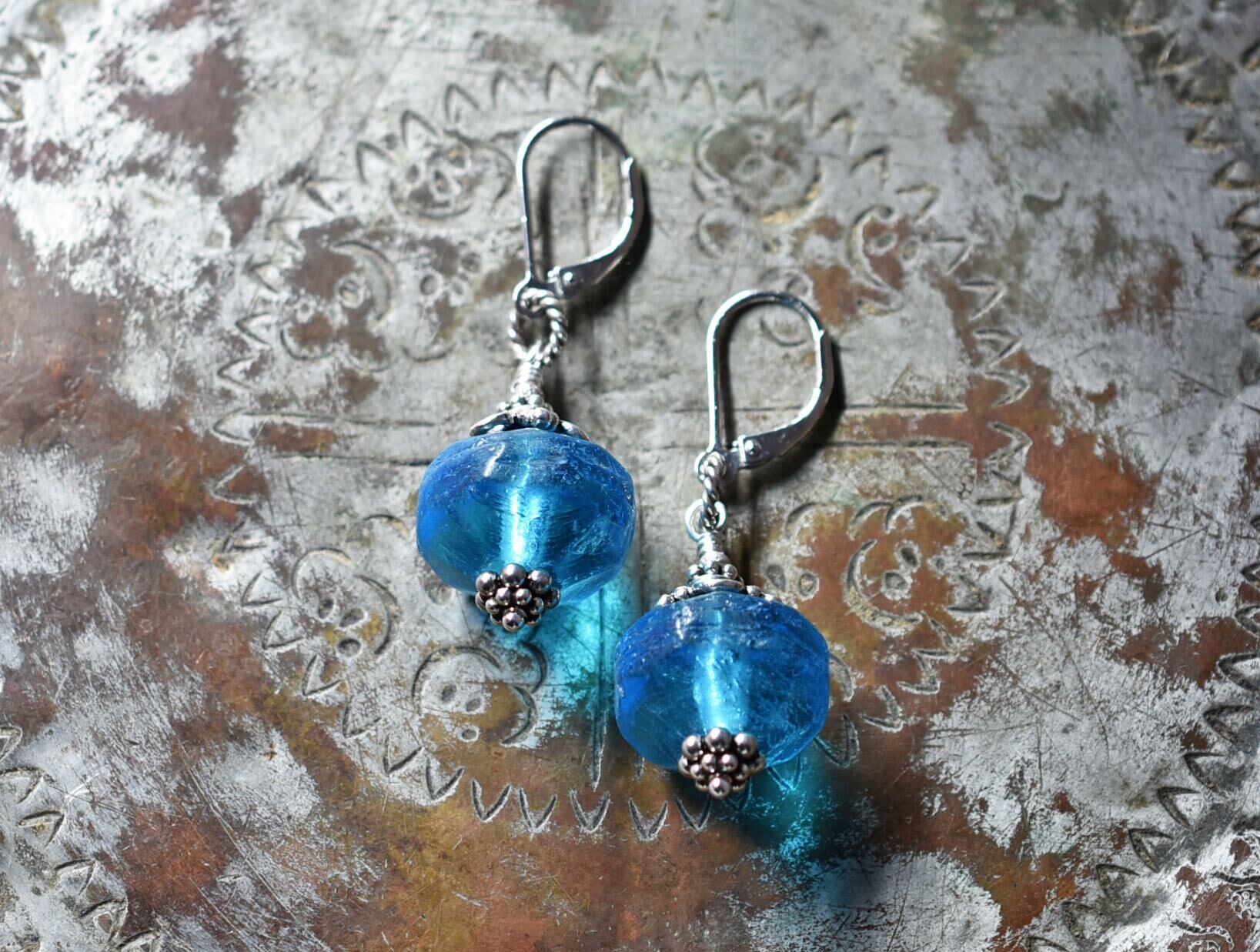 ブルー算盤型アンティークボヘミアビーズと隠しブルービーズのピアス
