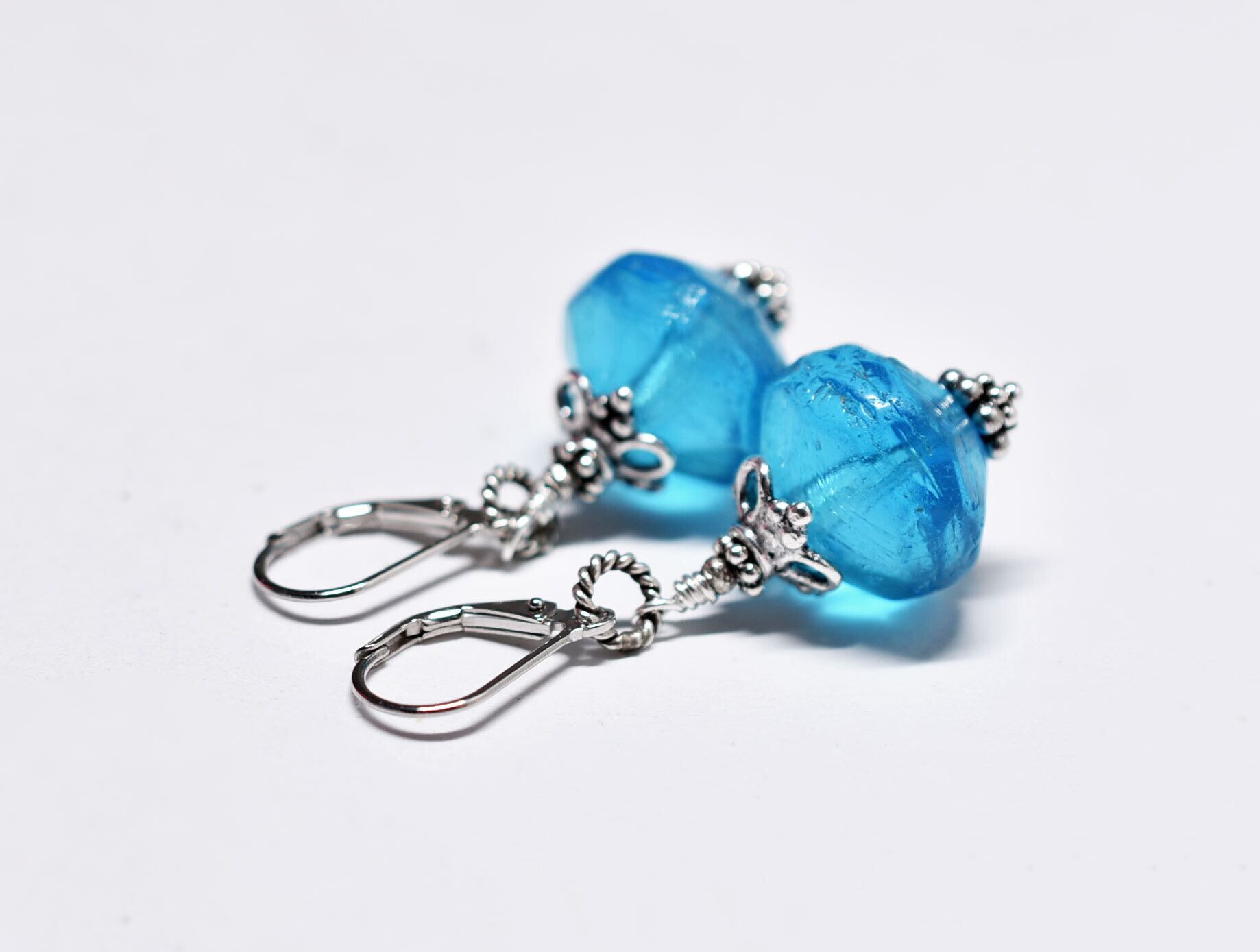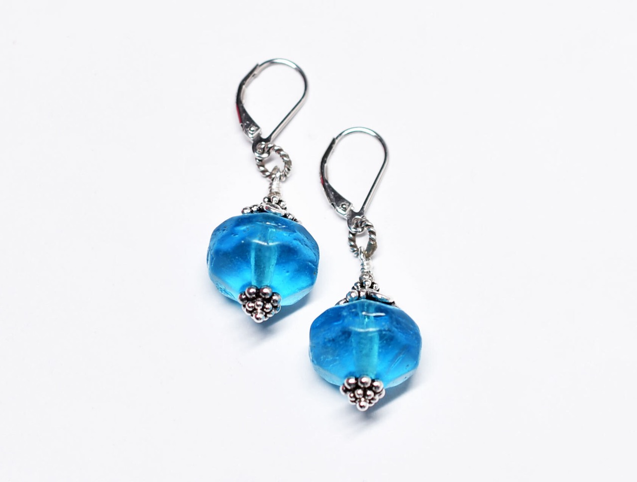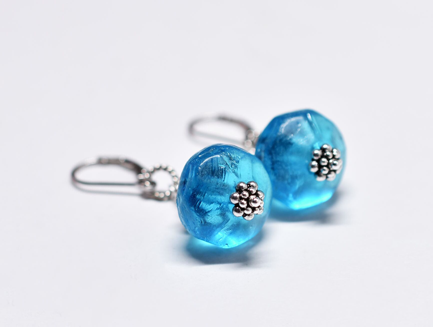 ブルー算盤型アンティークボヘミアビーズと隠しブルービーズのピアス