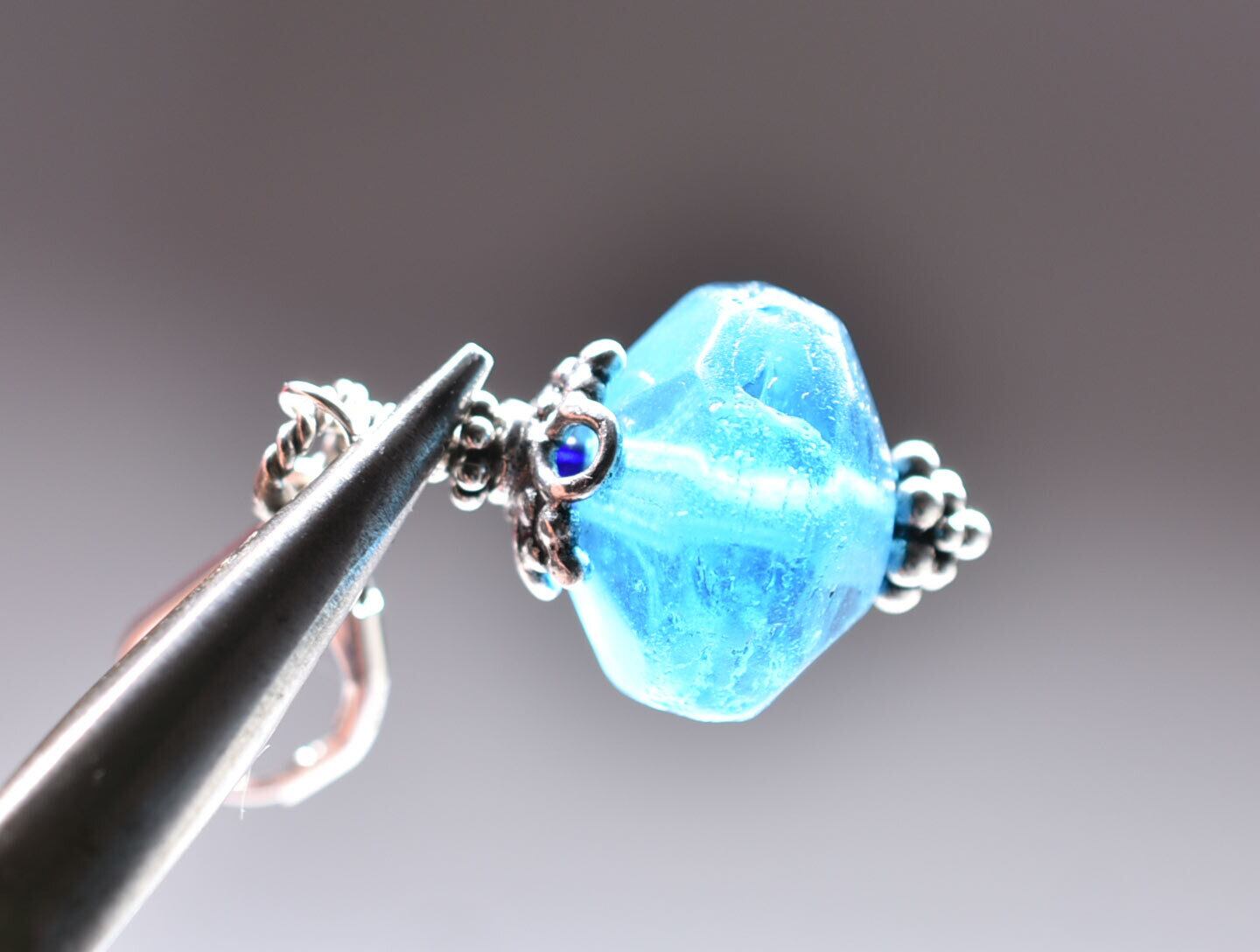 ブルー算盤型アンティークボヘミアビーズの上部にはアンティークのヴェネチアブルービーズを忍ばせています。