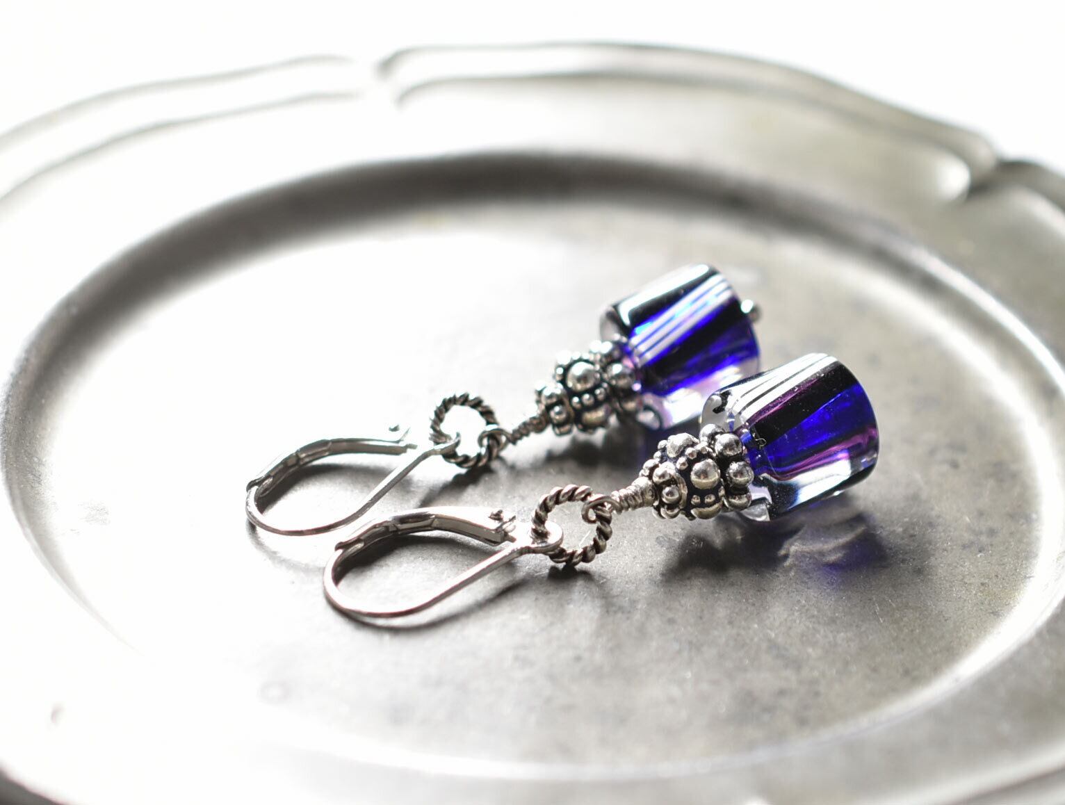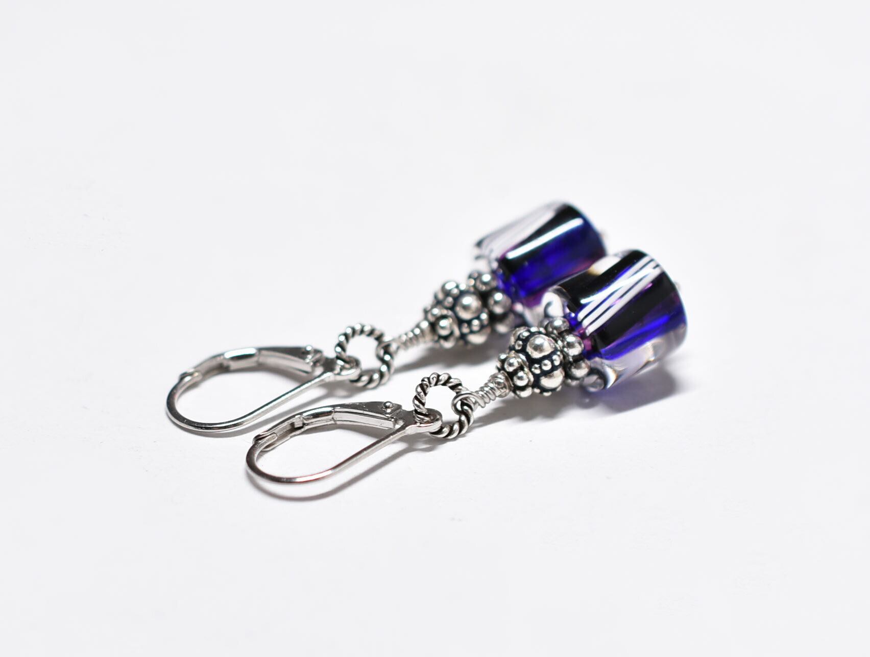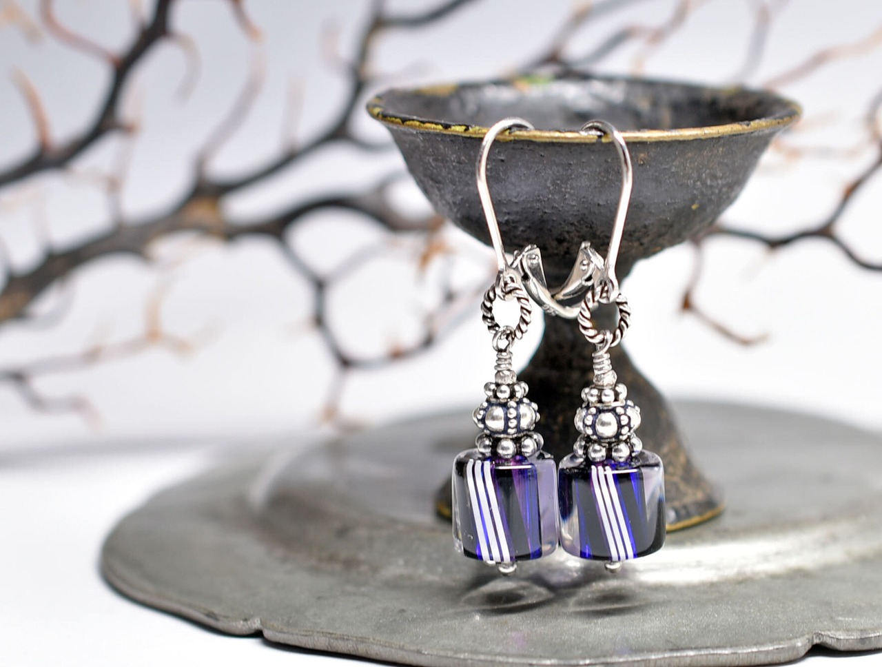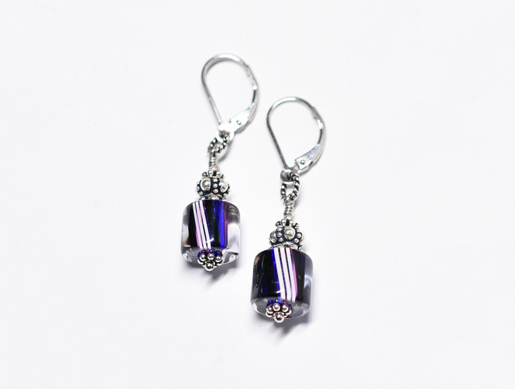 ブルー×パープルアメリカストライプビーズとシルバービーズのピアス