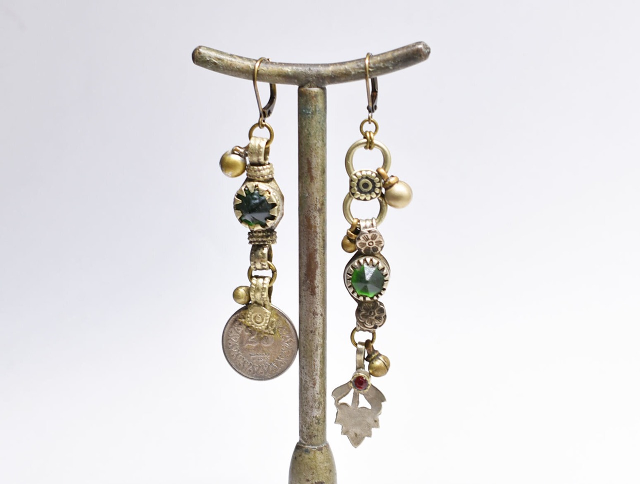 oldコインとアフガンメタル、民族鈴のアンシメトリーを繋いだアンシメトリーなピアスです。