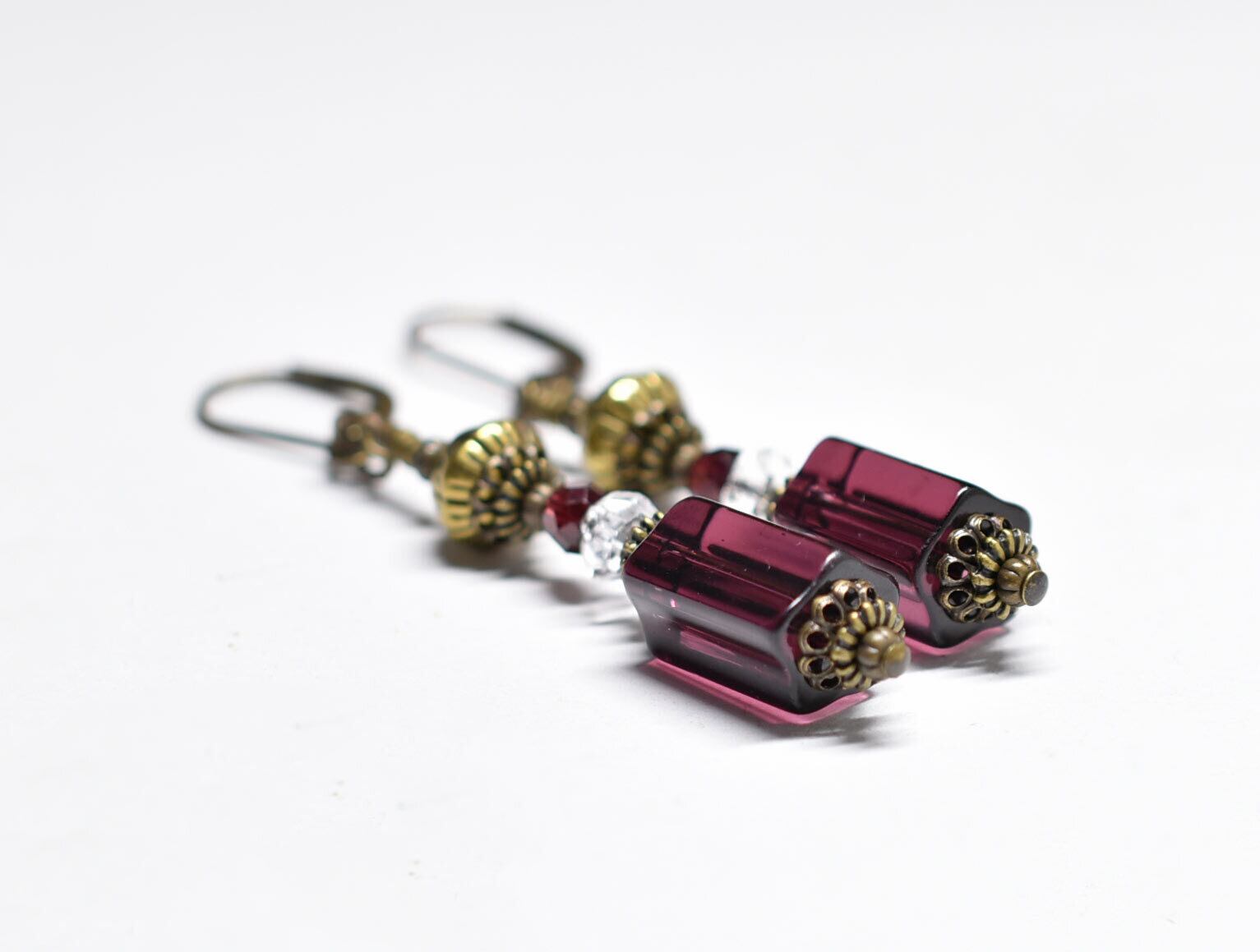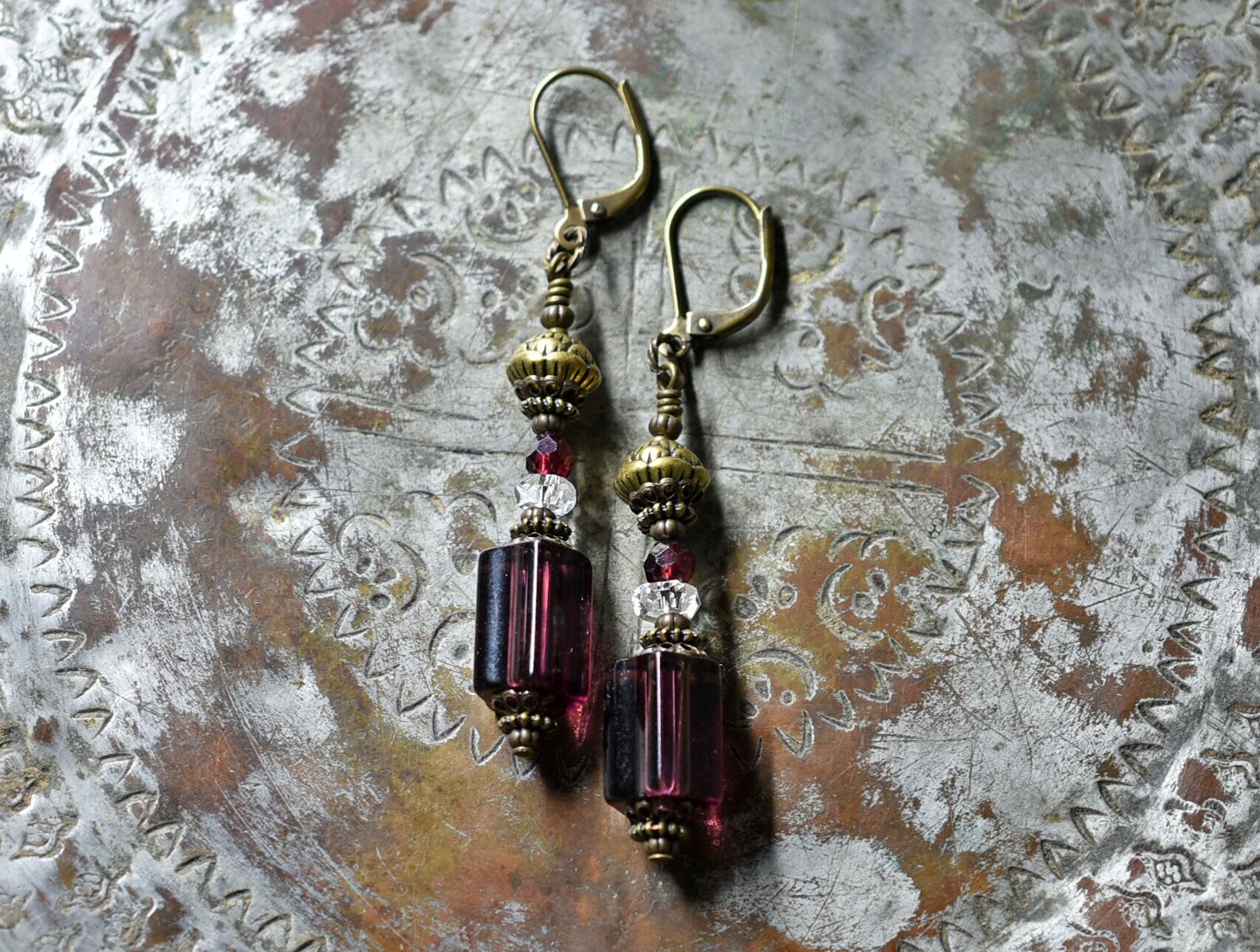 ワインレッドチェコビーズと蓮華ブラス、クォーツ、ガーネットを繋いだピアスです。