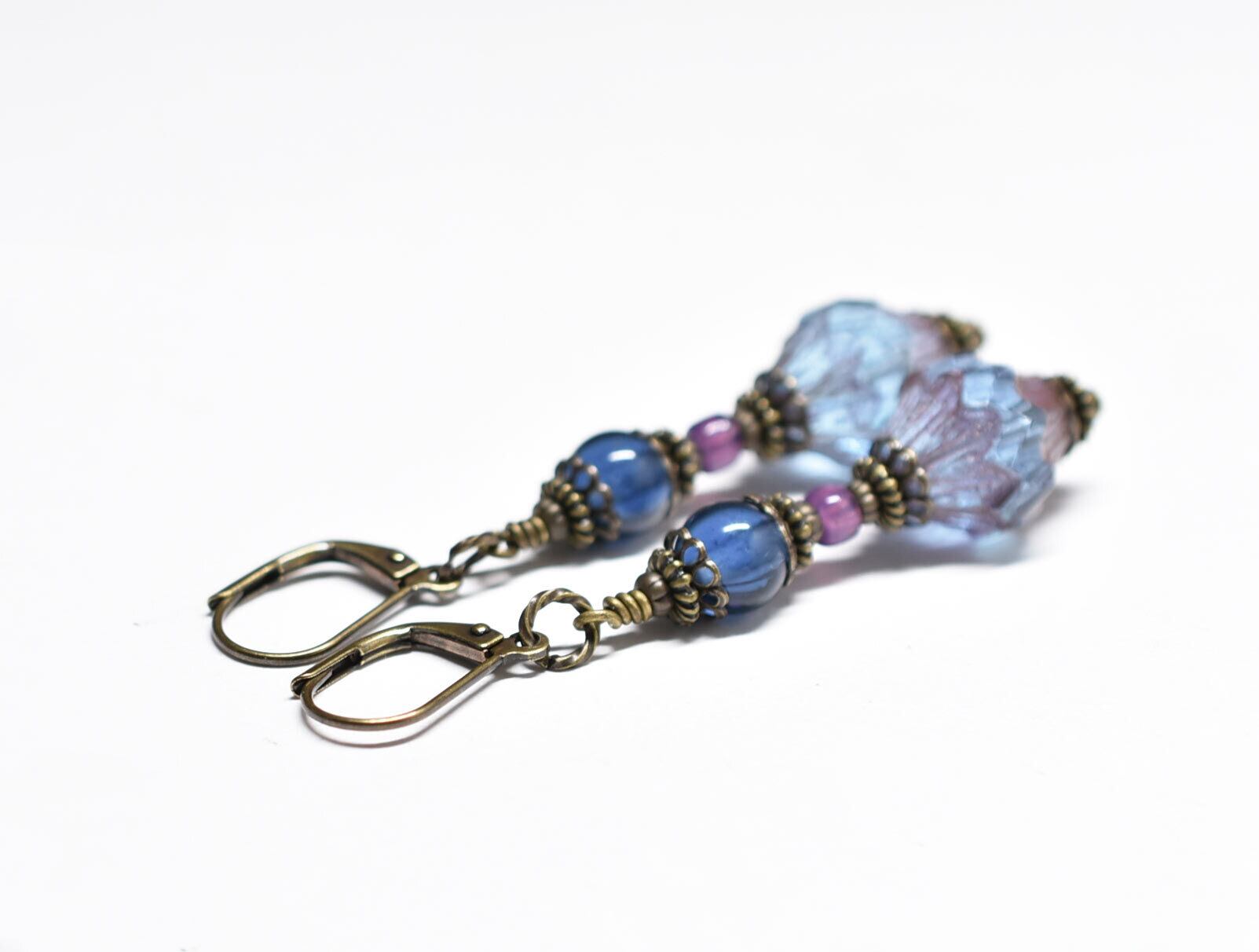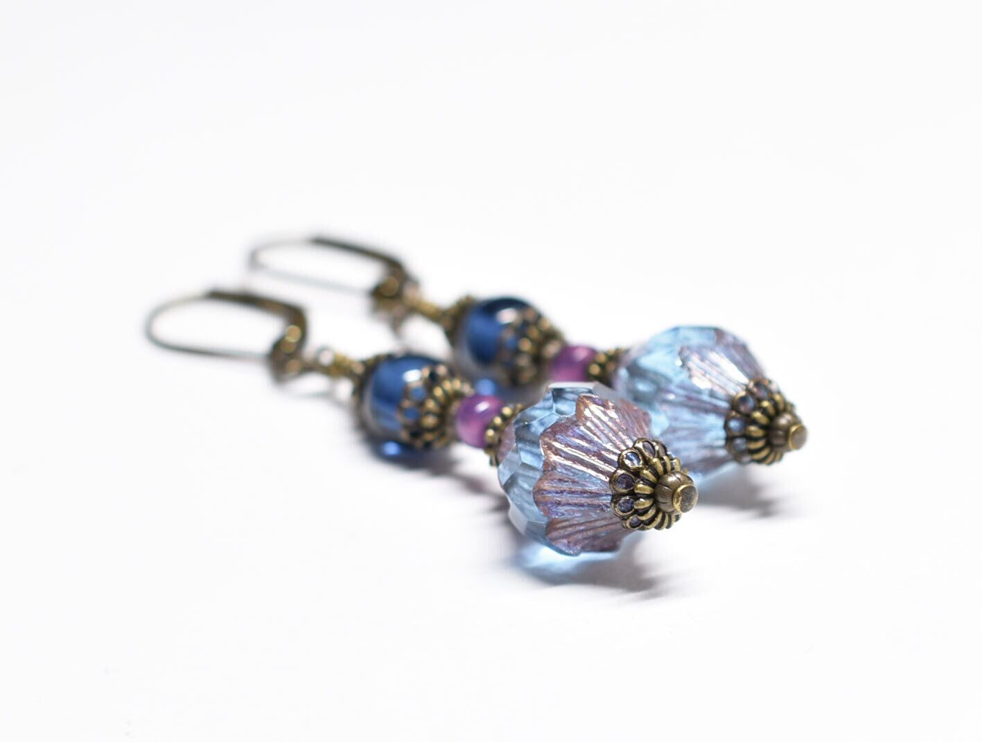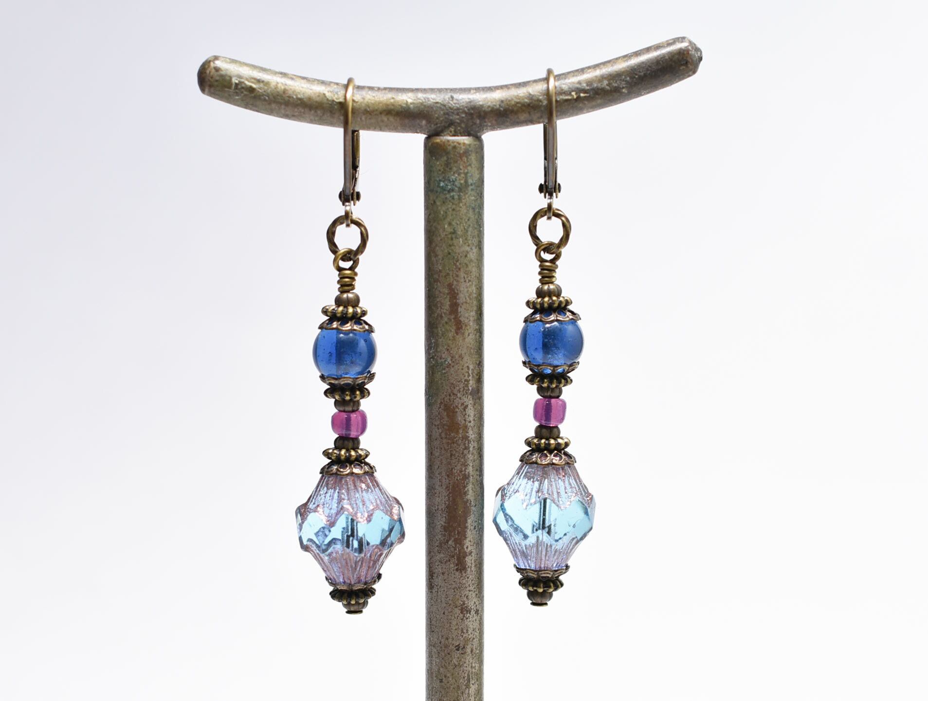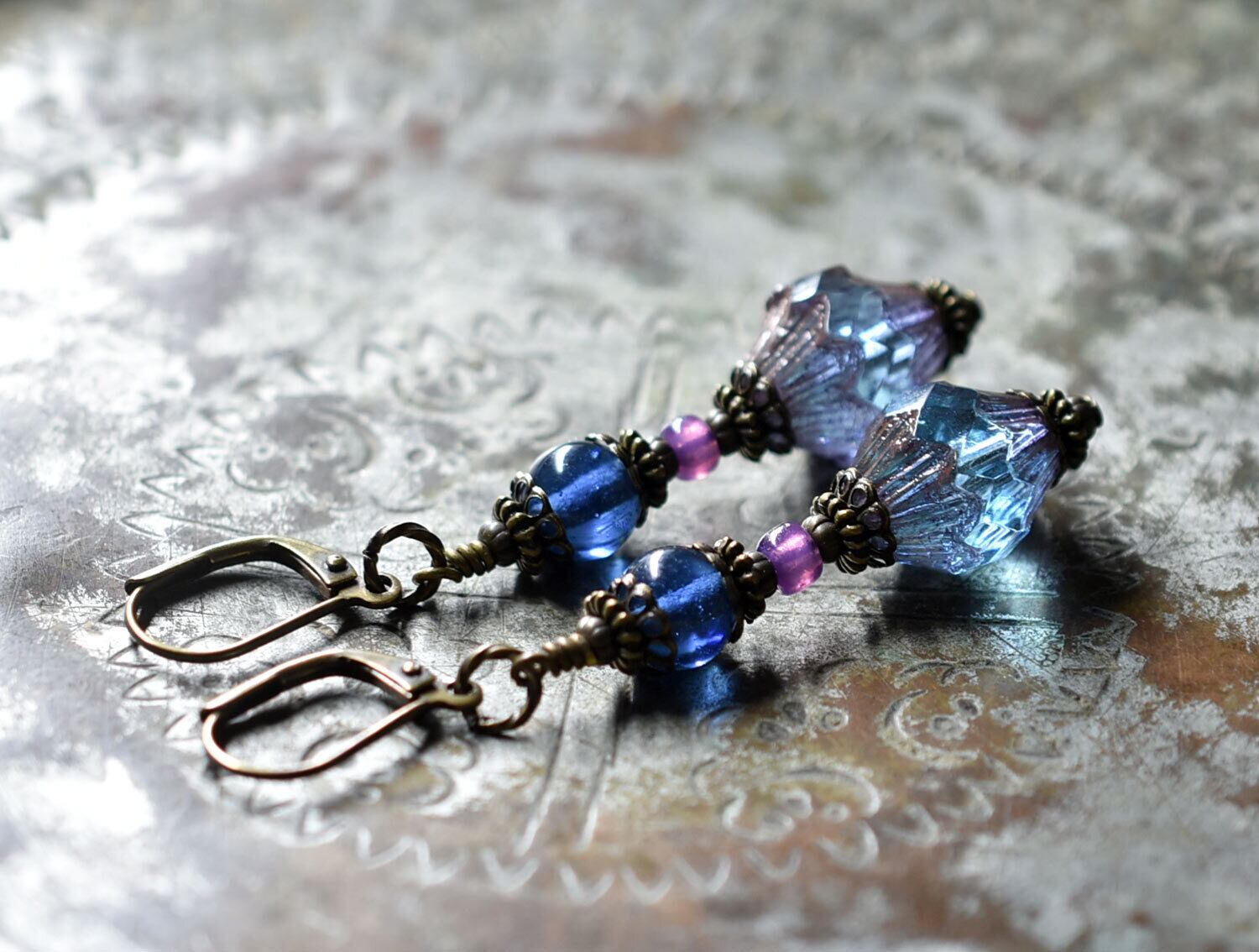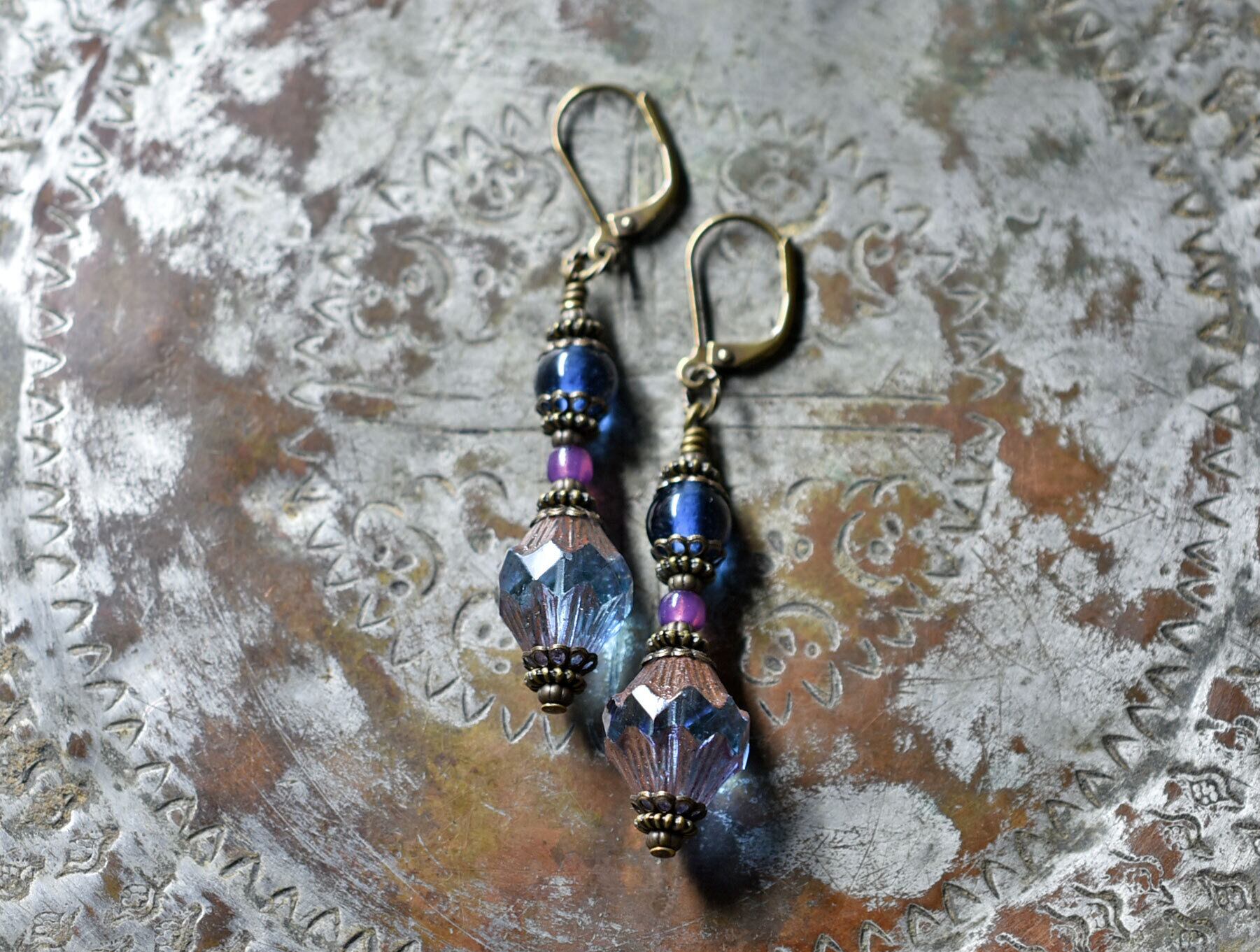 ゼニスブルーチェコビーズとロイヤルブルーヴィンテージビーズ、すみれ色フランスヴィンテージのピアス