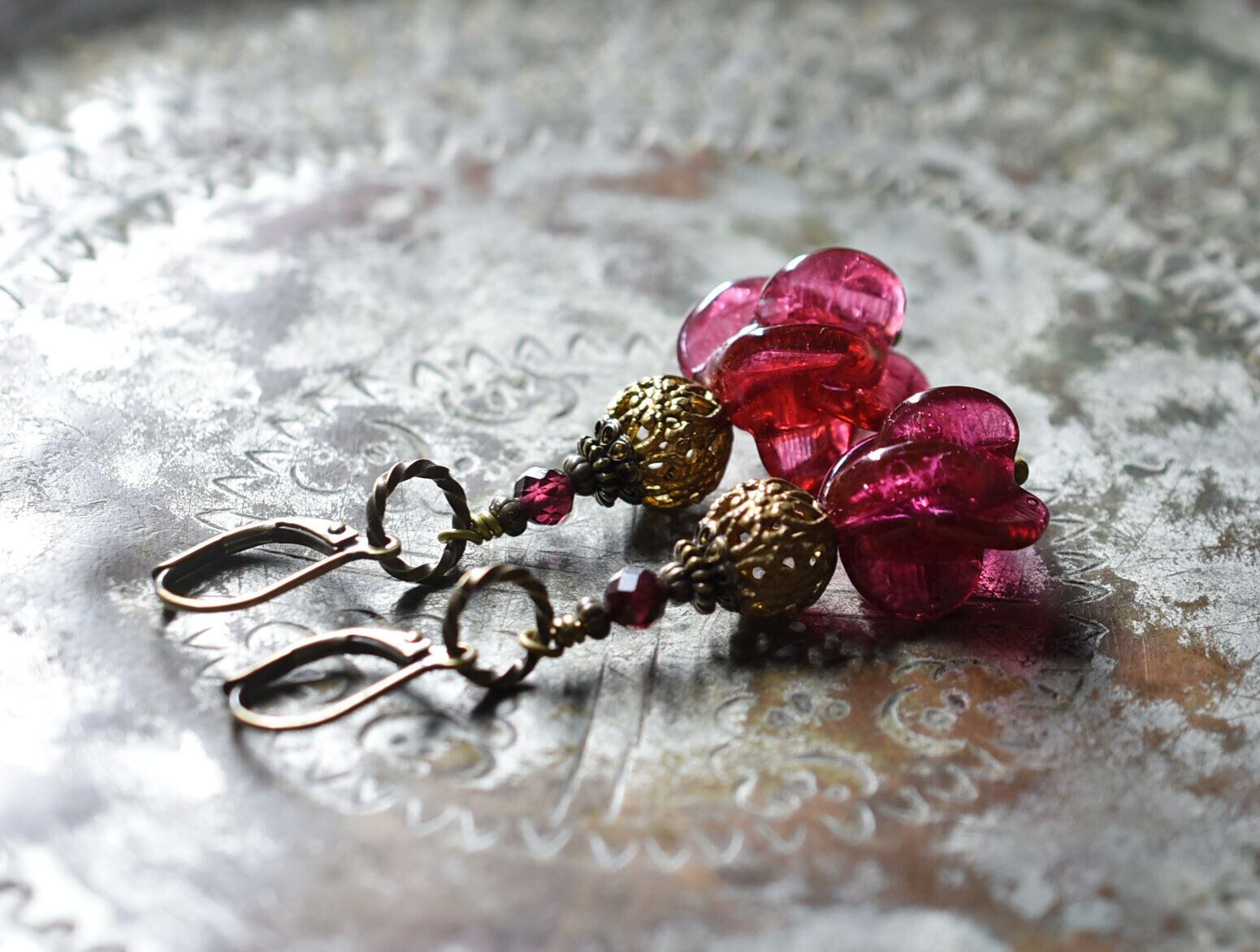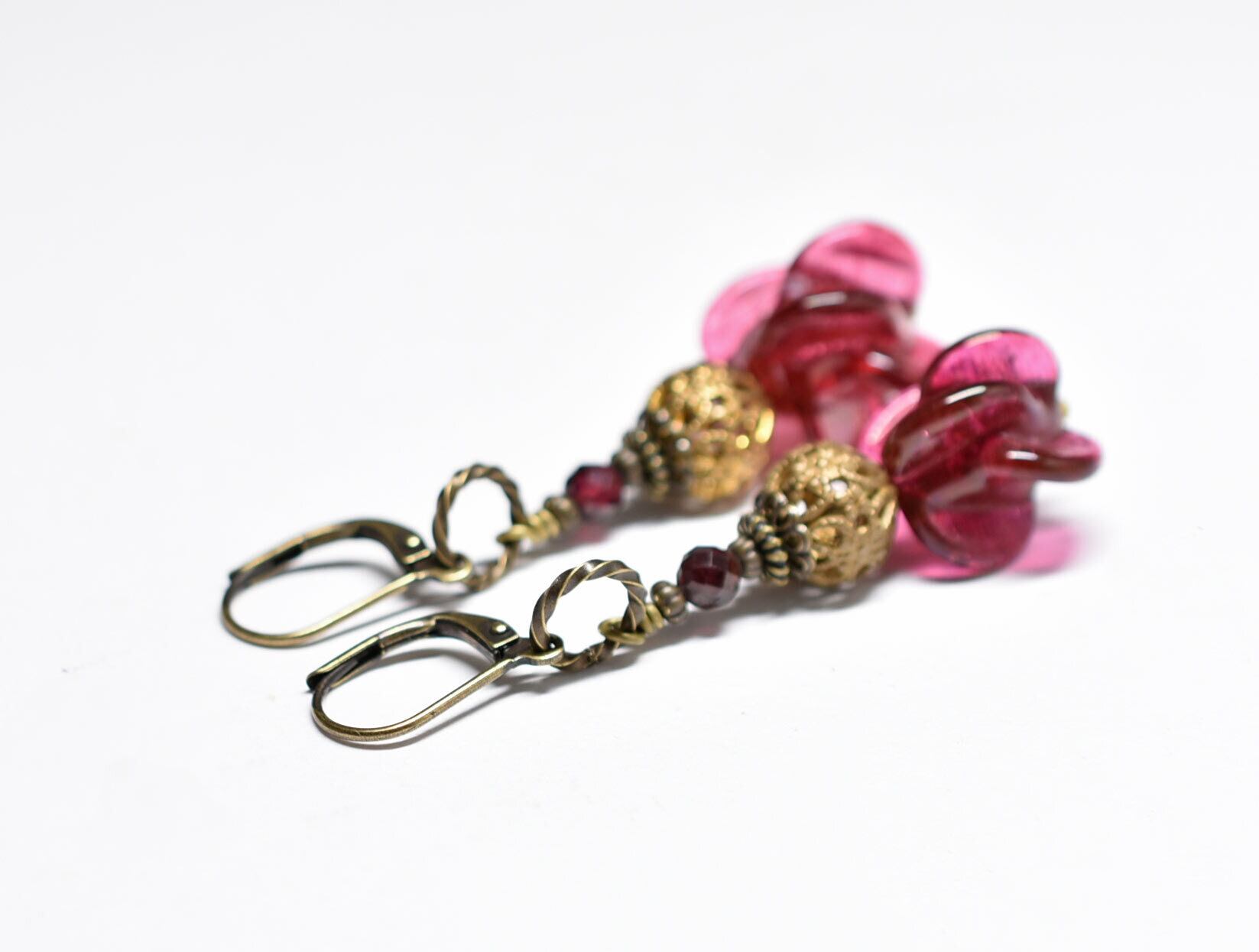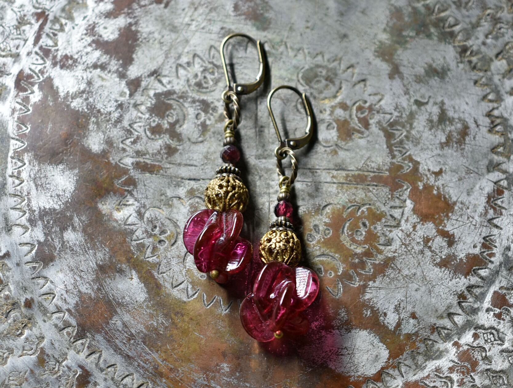 ローズレッドヨーロッパヴィンテージビーズと透かしブラス、ガーネットのピアス