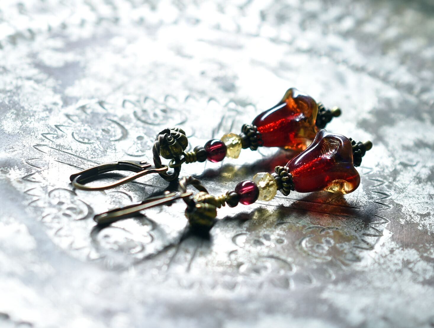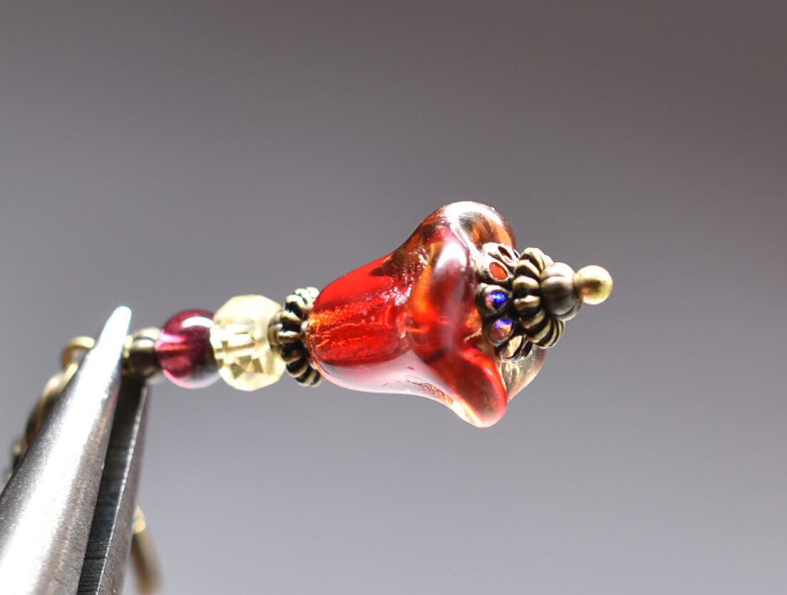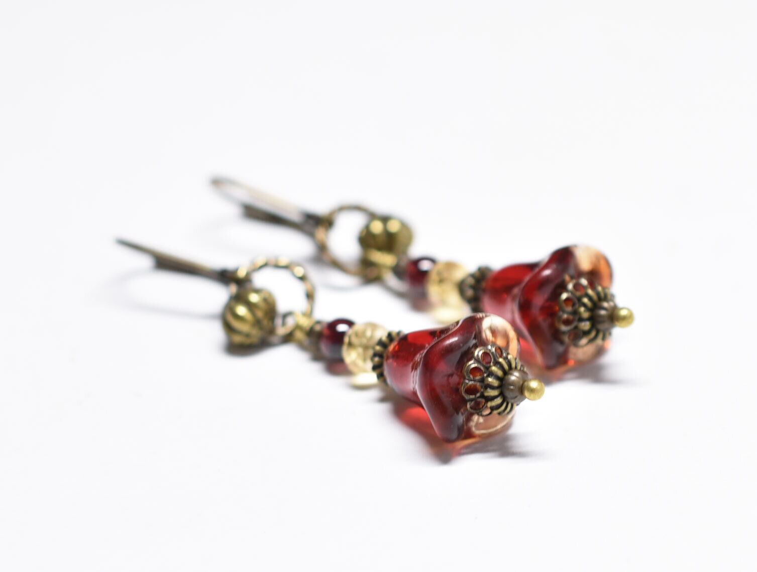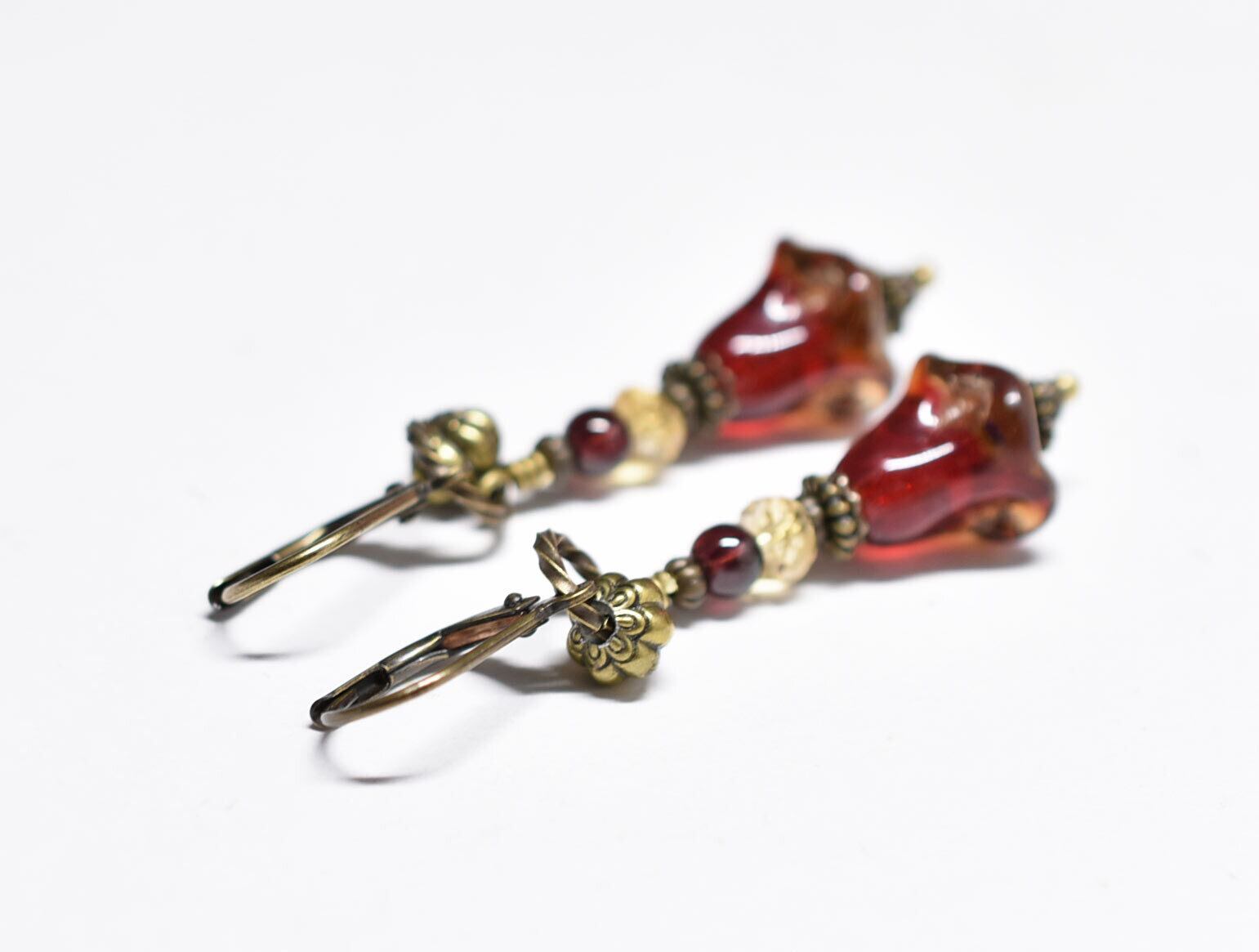 エンジェルトランペットの様なドイツヴィンテージビーズとシトリン&ガーネットのピアス(琥珀×レッド)