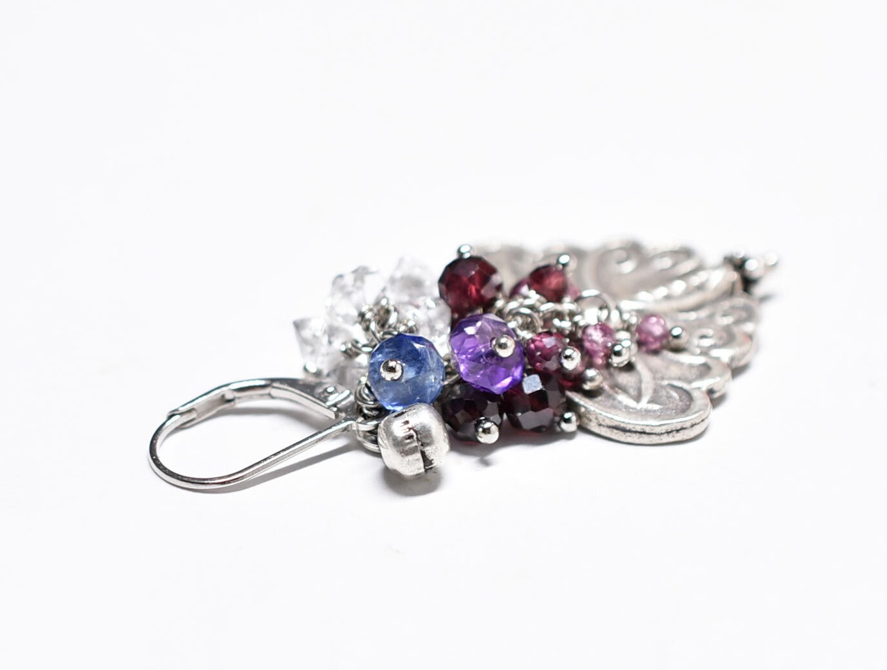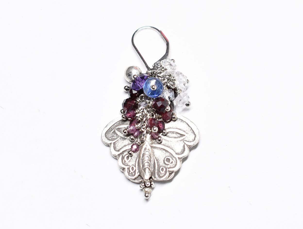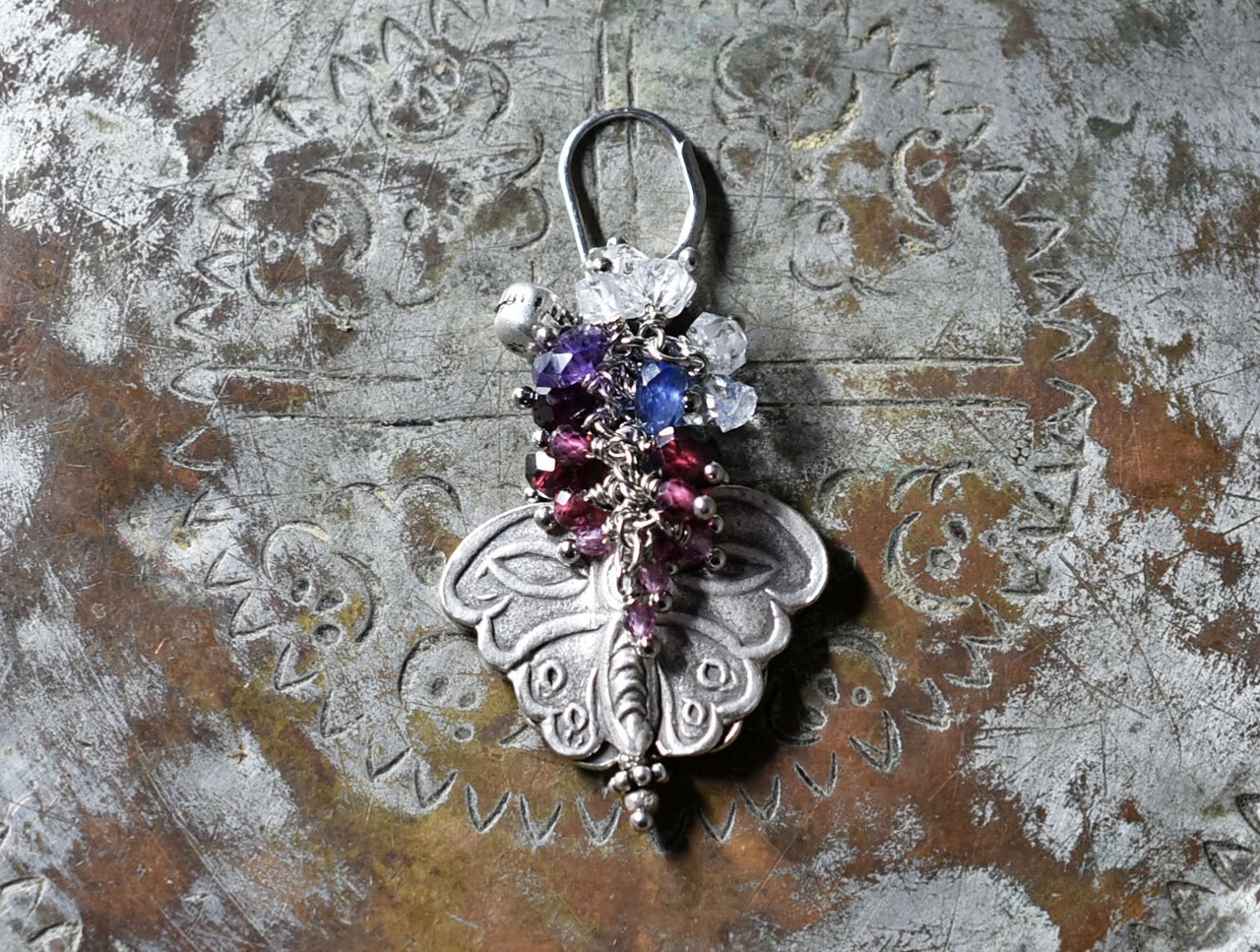 蝶のカレンシルバーとたわわなガーネット&ハーキマーダイヤモンド、カイヤナイト、アメジスト、インドシルバー鈴の片耳ピアス