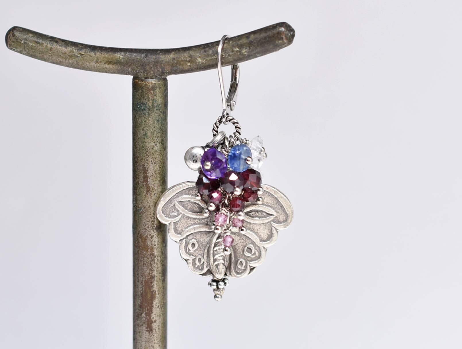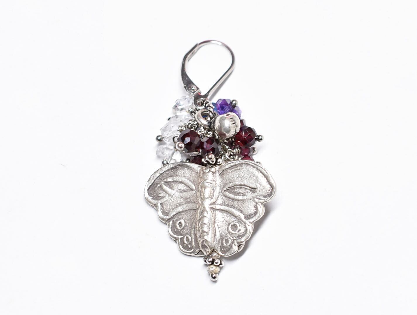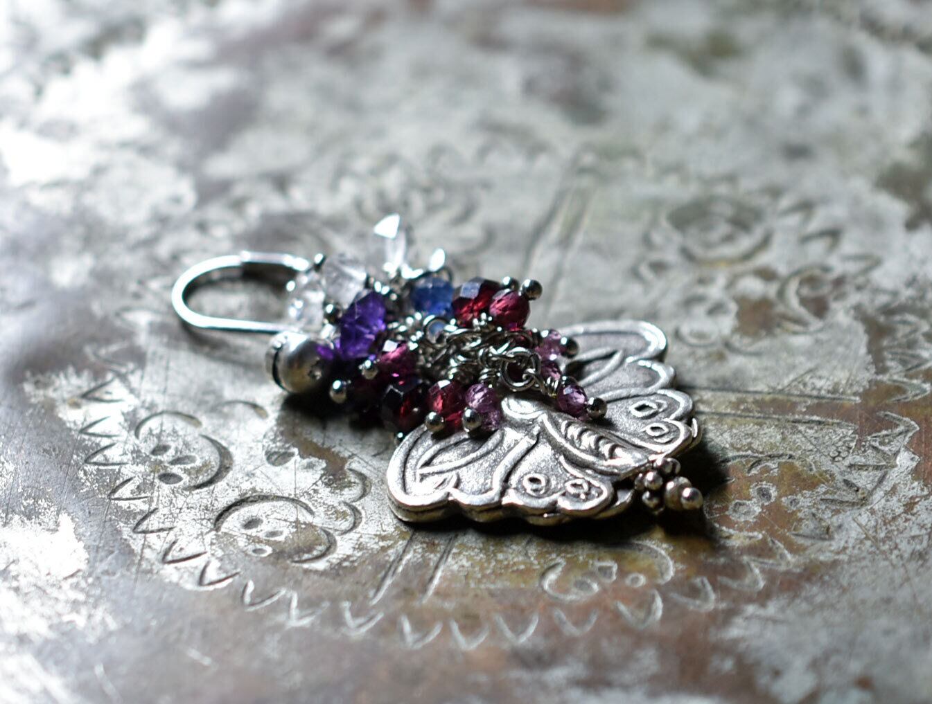 蝶のカレンシルバーとたわわなガーネット&ハーキマーダイヤモンド、カイヤナイト、アメジスト、インドシルバー鈴の片耳ピアス