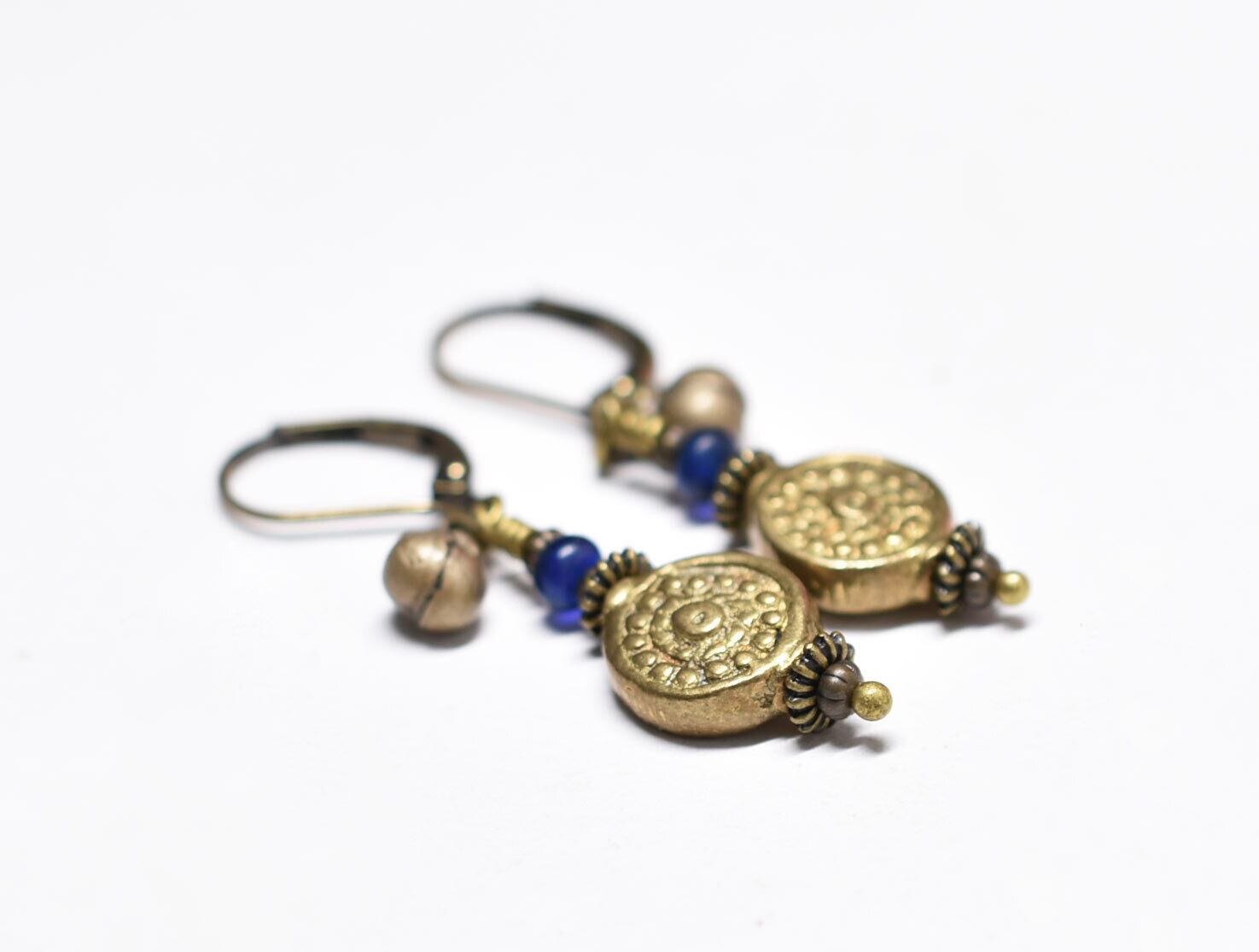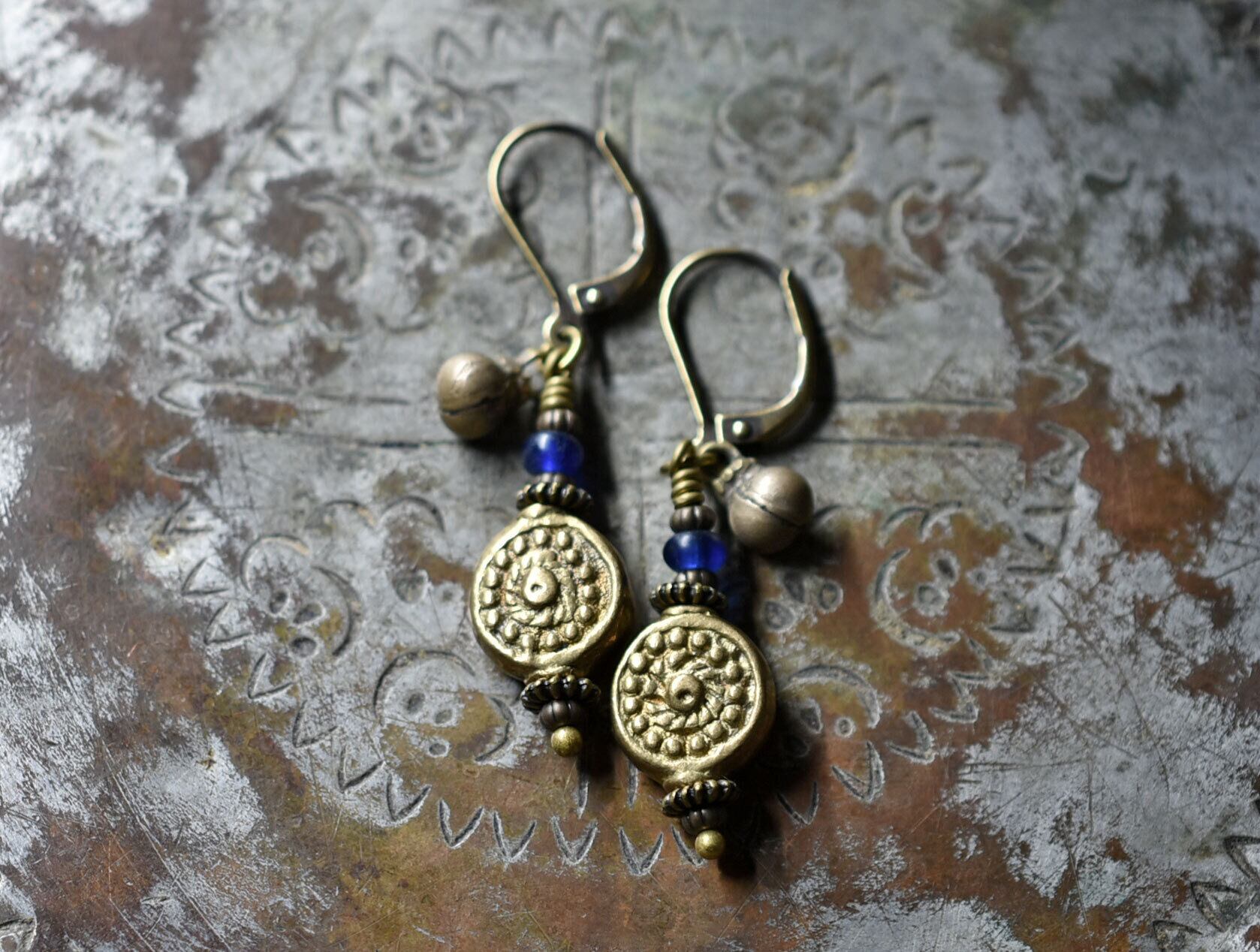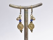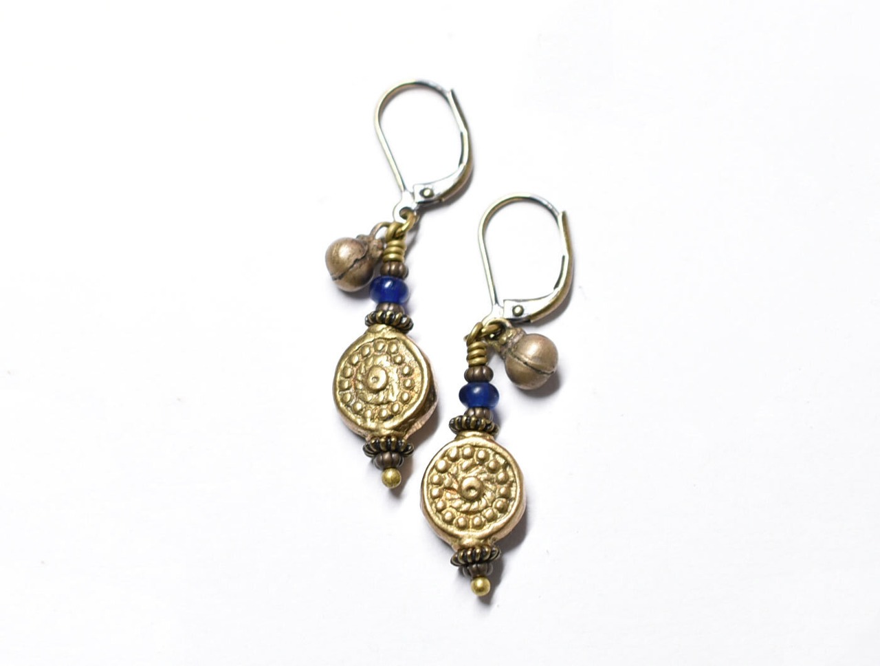 コインの様なインドブラス、ブルービーズ、小さな民族鈴のピアス