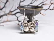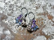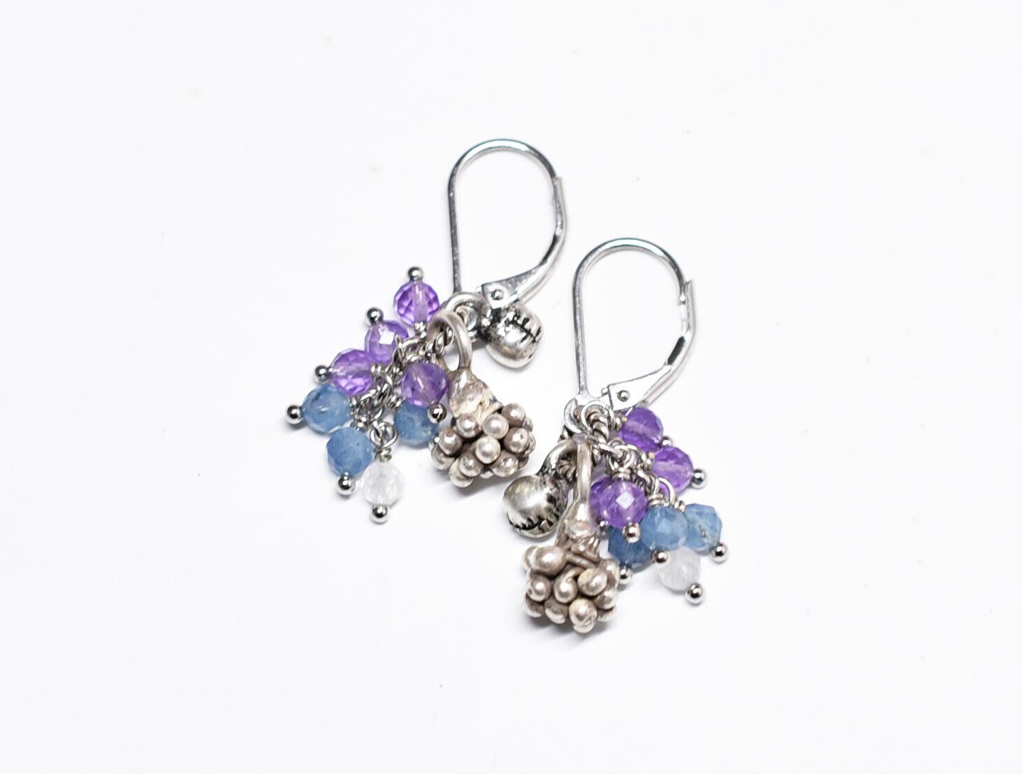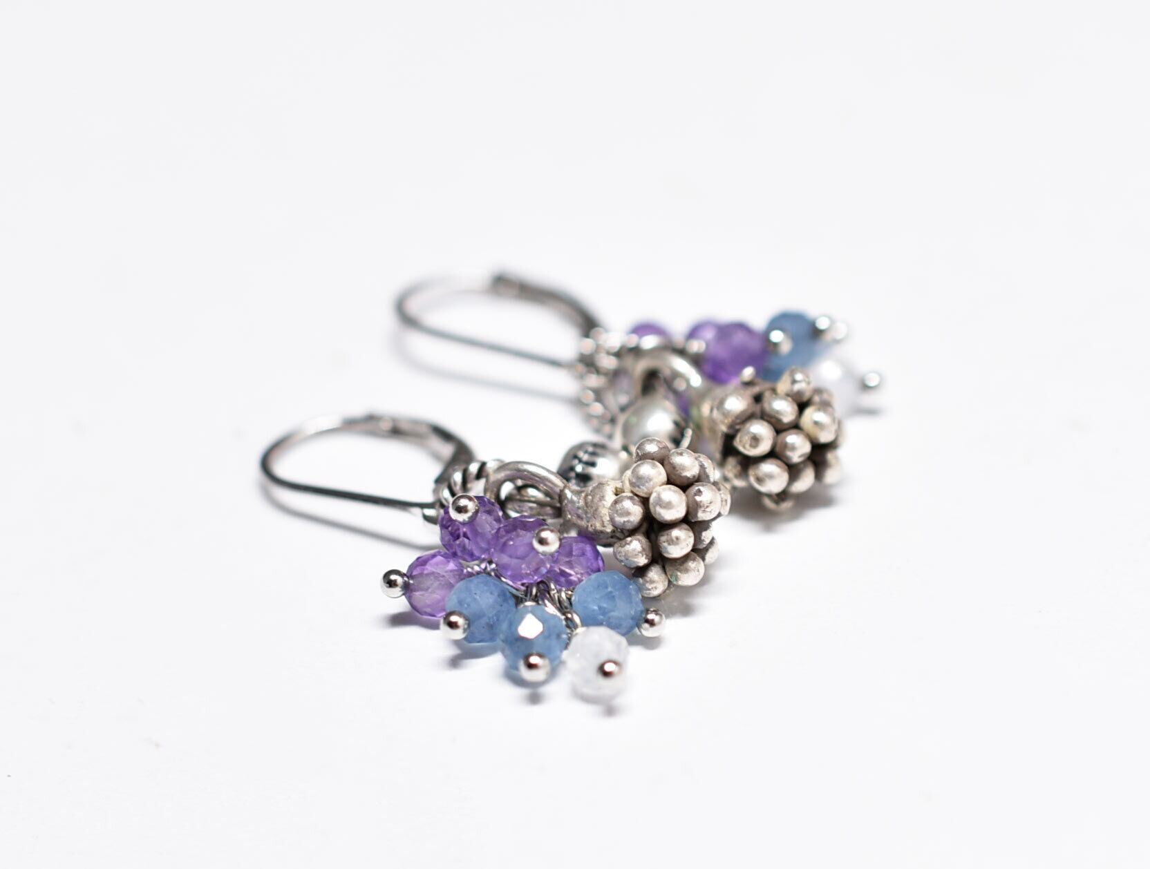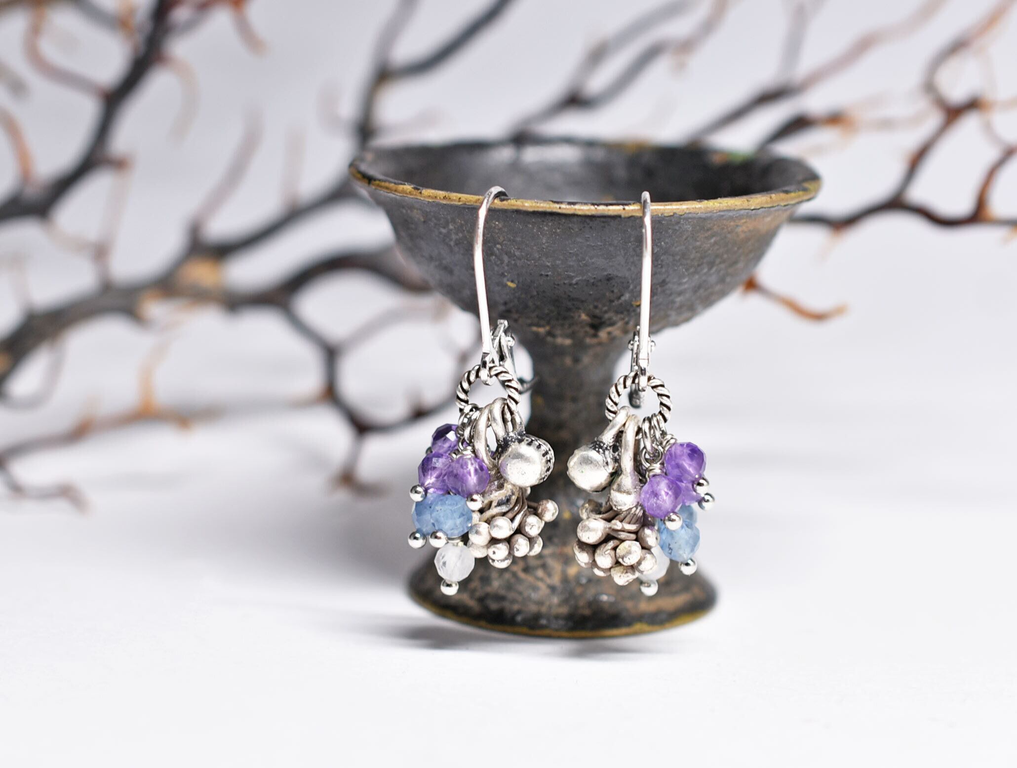 蕾カレンシルバーとたわわなアメジスト&アクアマリン&ムーンストーン、インドシルバー鈴のピアス