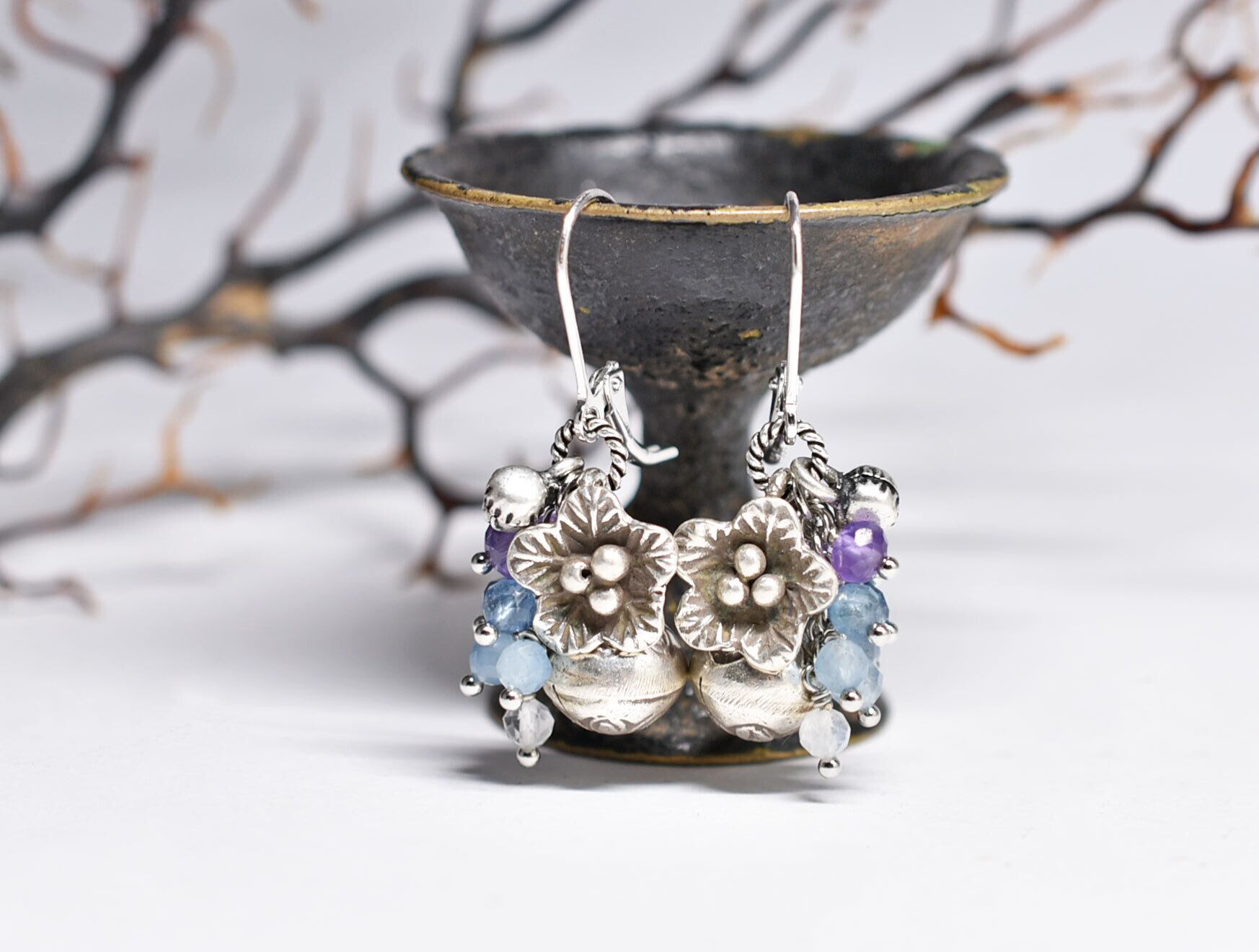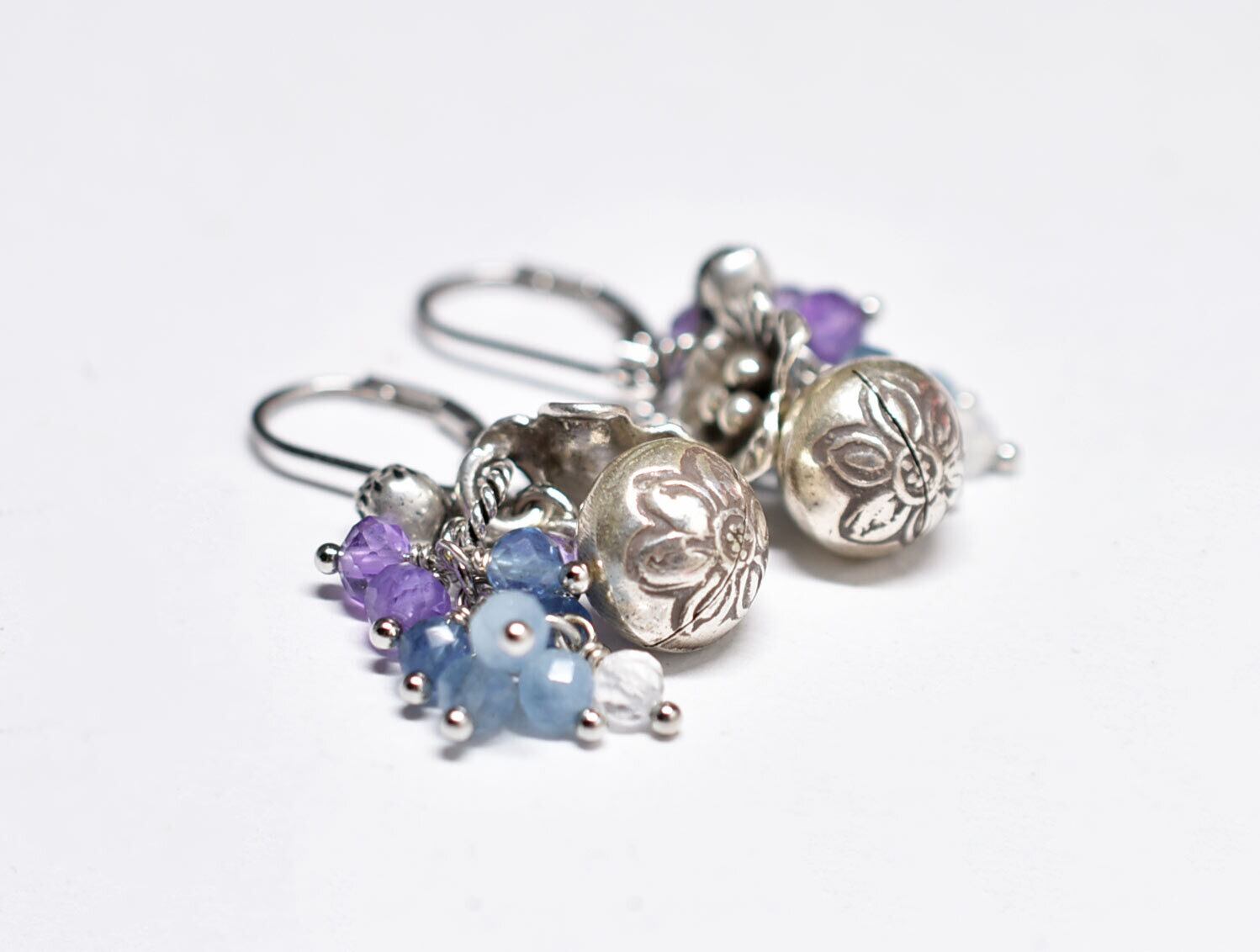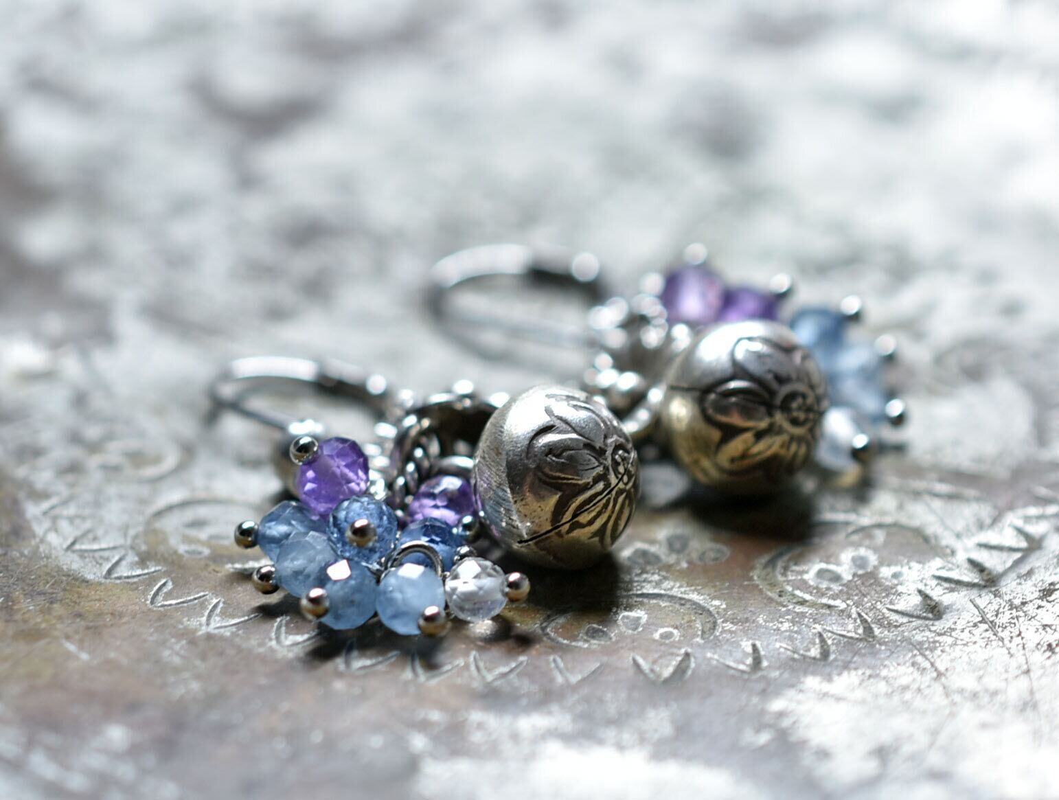 鈴とお花カレンシルバー、たわわなアメジスト&アクアマリン&ムーンストーン、インドシルバー鈴のピアス