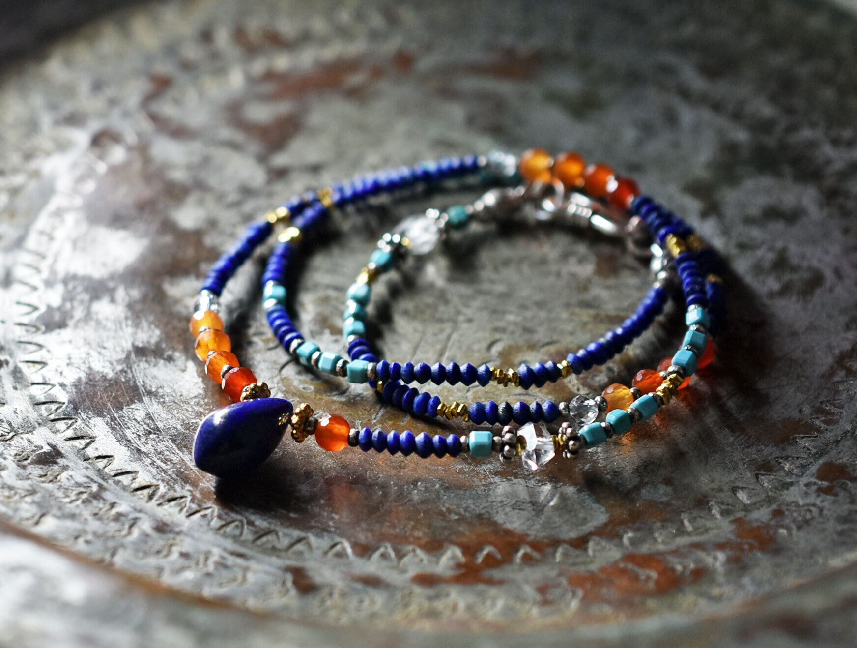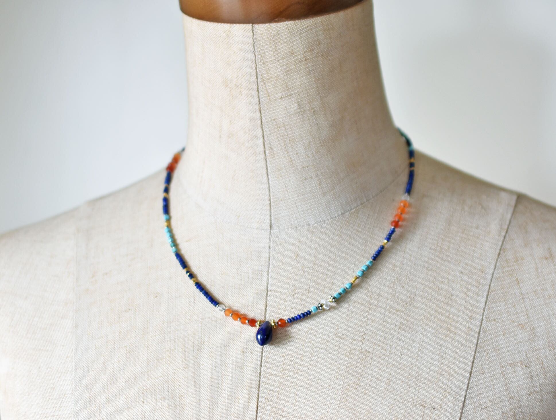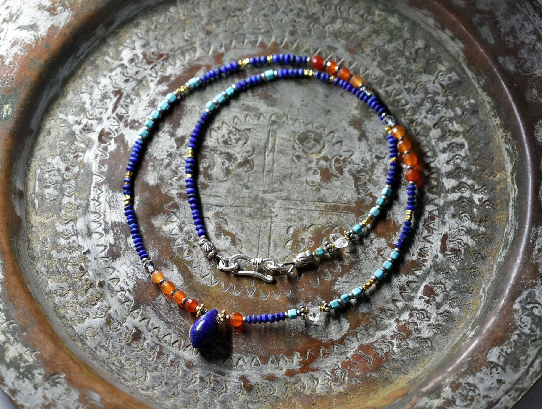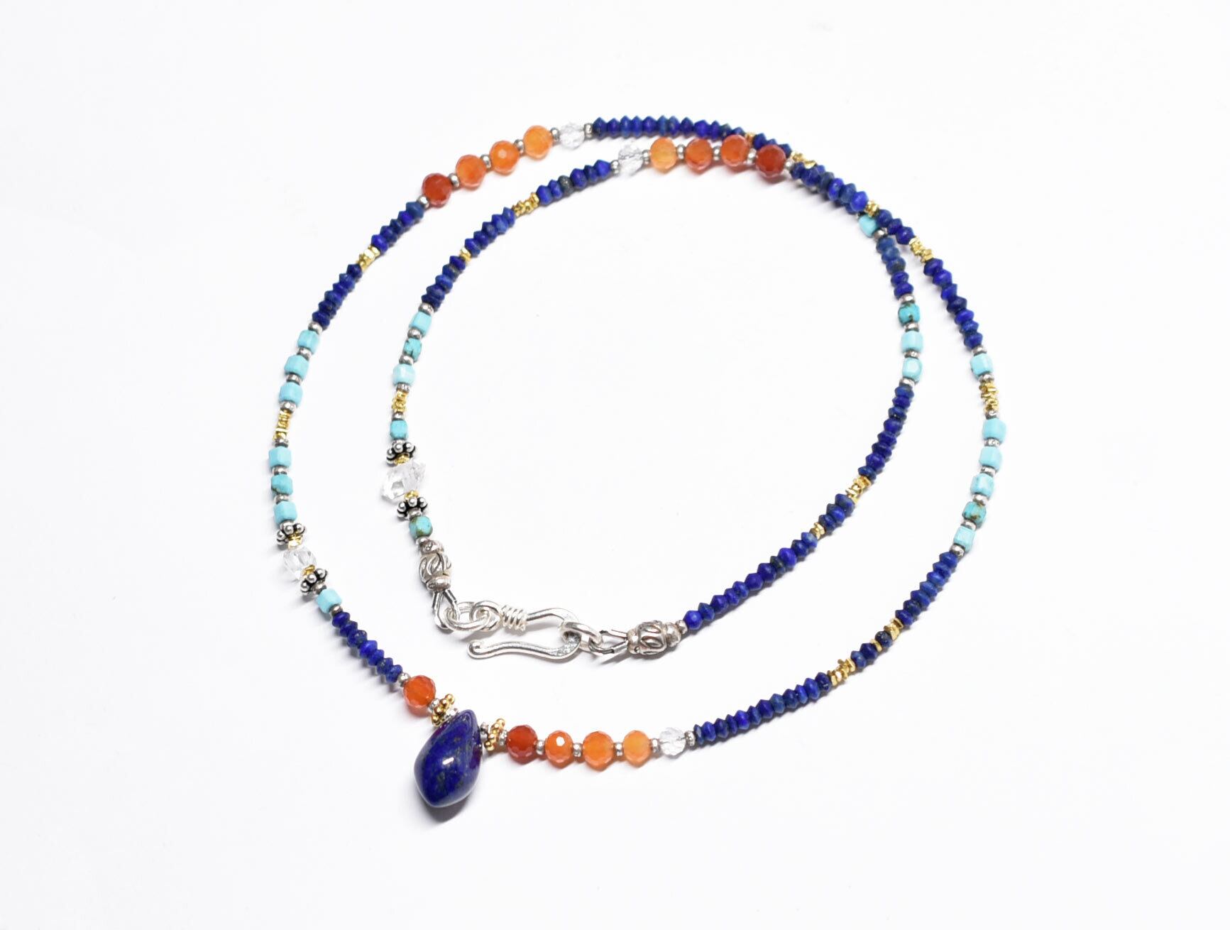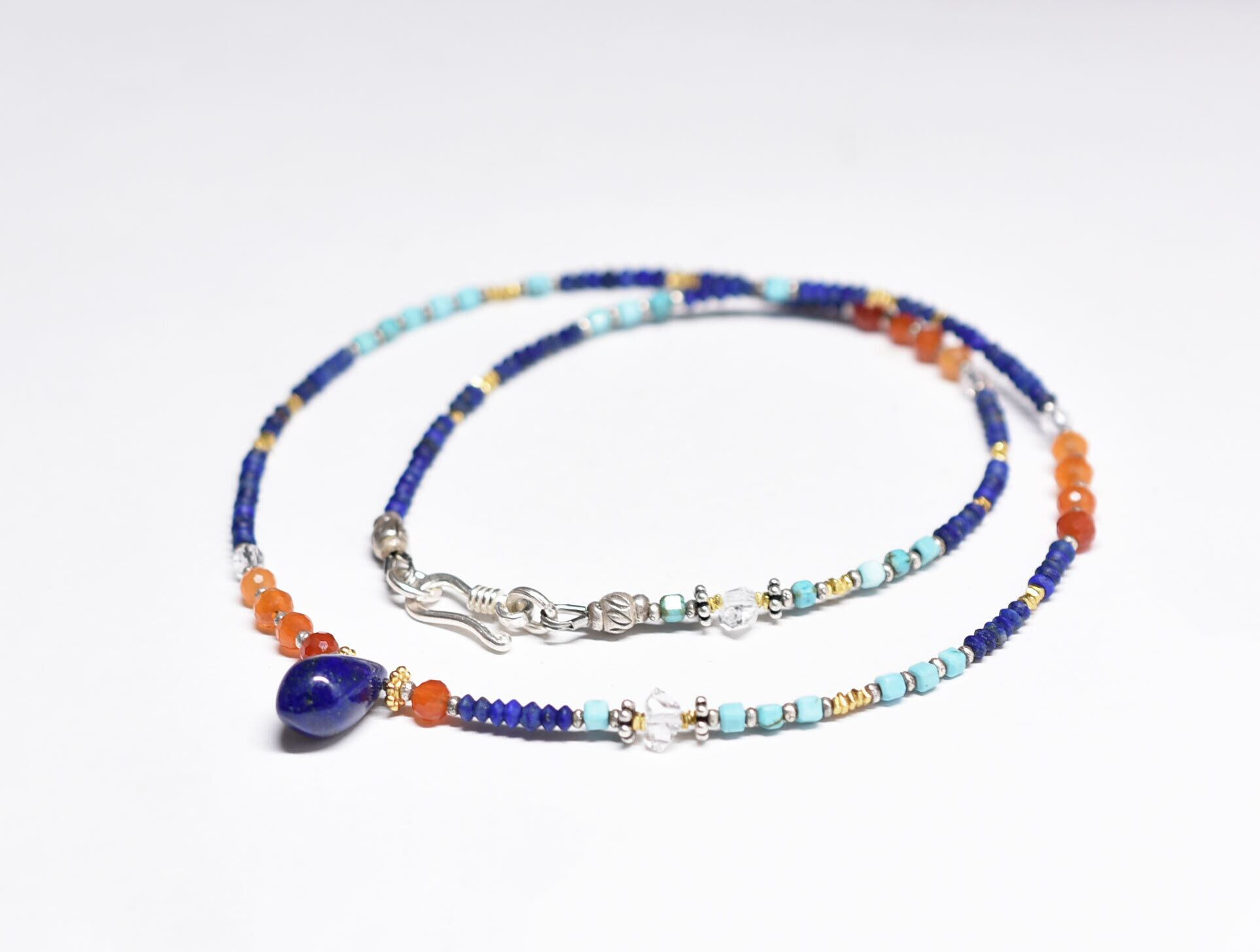 雫型ラピスとカーネリアン、ターコイズ、ハーキマーダイヤモンド、小さなラピス、カレンシルバーを繋いだ華奢なネックレスです。